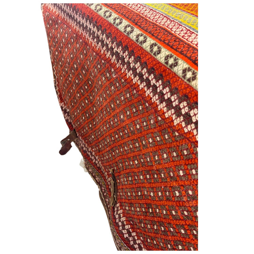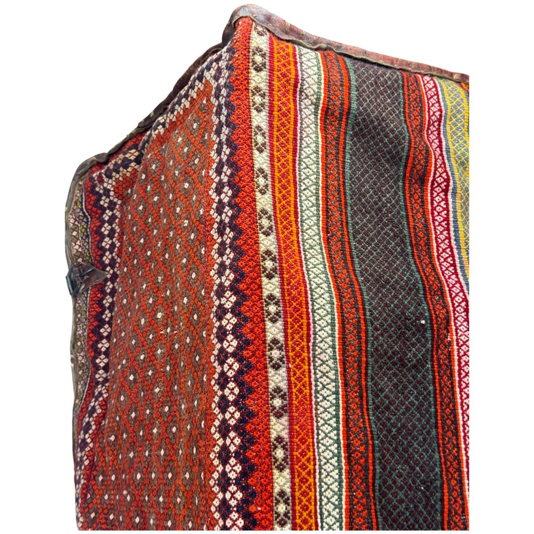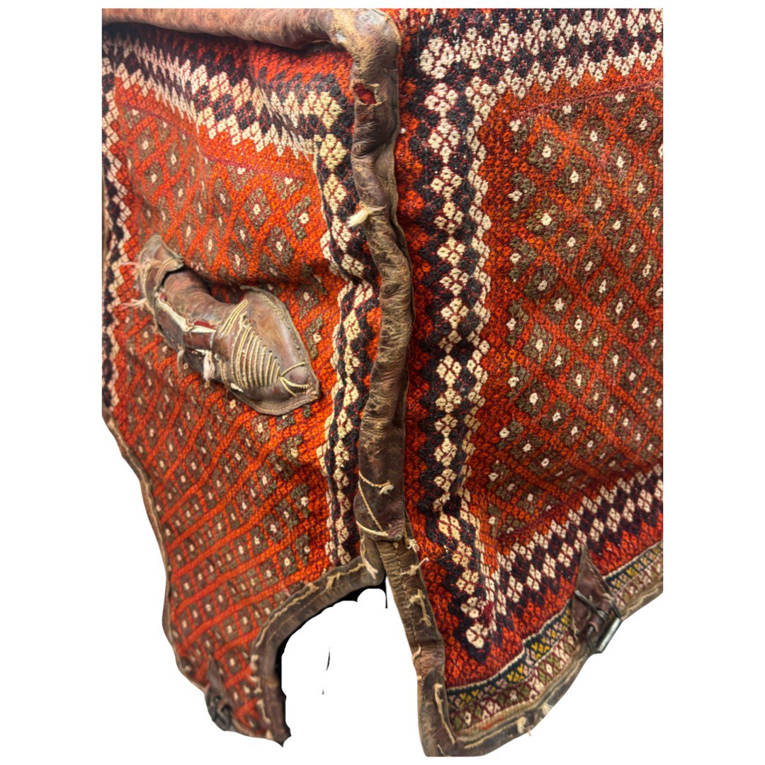 cargo bag or Mafrash - bedding bags, the front, back and side panels Hand knotted rug, mother and baby paisley repeating red and ivory , brown , within geometric motif secondary borders. Mafrash have been made in the largest numbers by Shahsevan tribal people and other groups in NW and across the border in Azerbaijan. Others were made in Georgia and Armenia. A majority are intricately woven soumak; others are slit-tapestry, sometimes with narrow contrasting soumak bands. Bags have been made by nomads for storage of bedding in their tents, and for use as cargo bags. They were normally made in pairs which could be balanced over the backs of camels on migration. In the marketplace, Mafrash were woven in three parts, and then assembled.