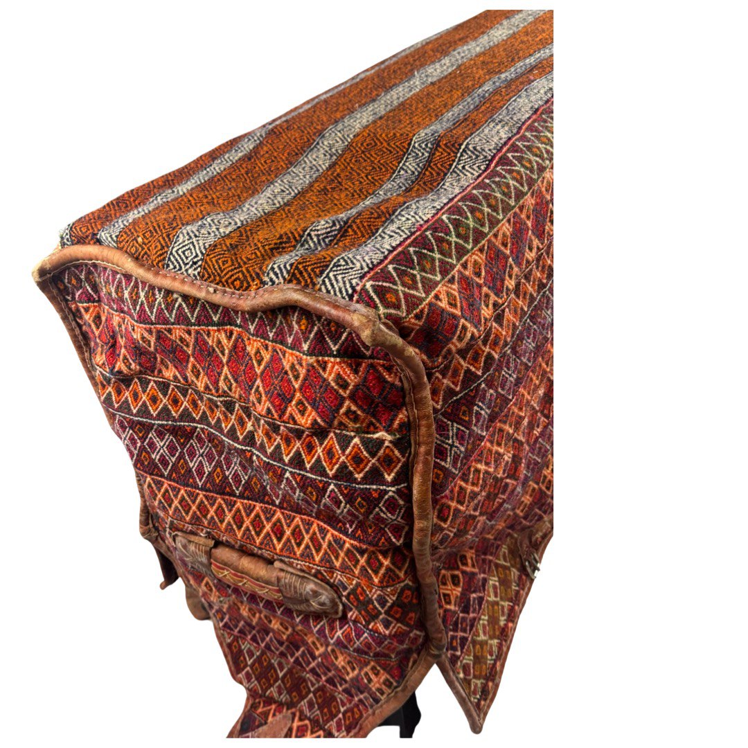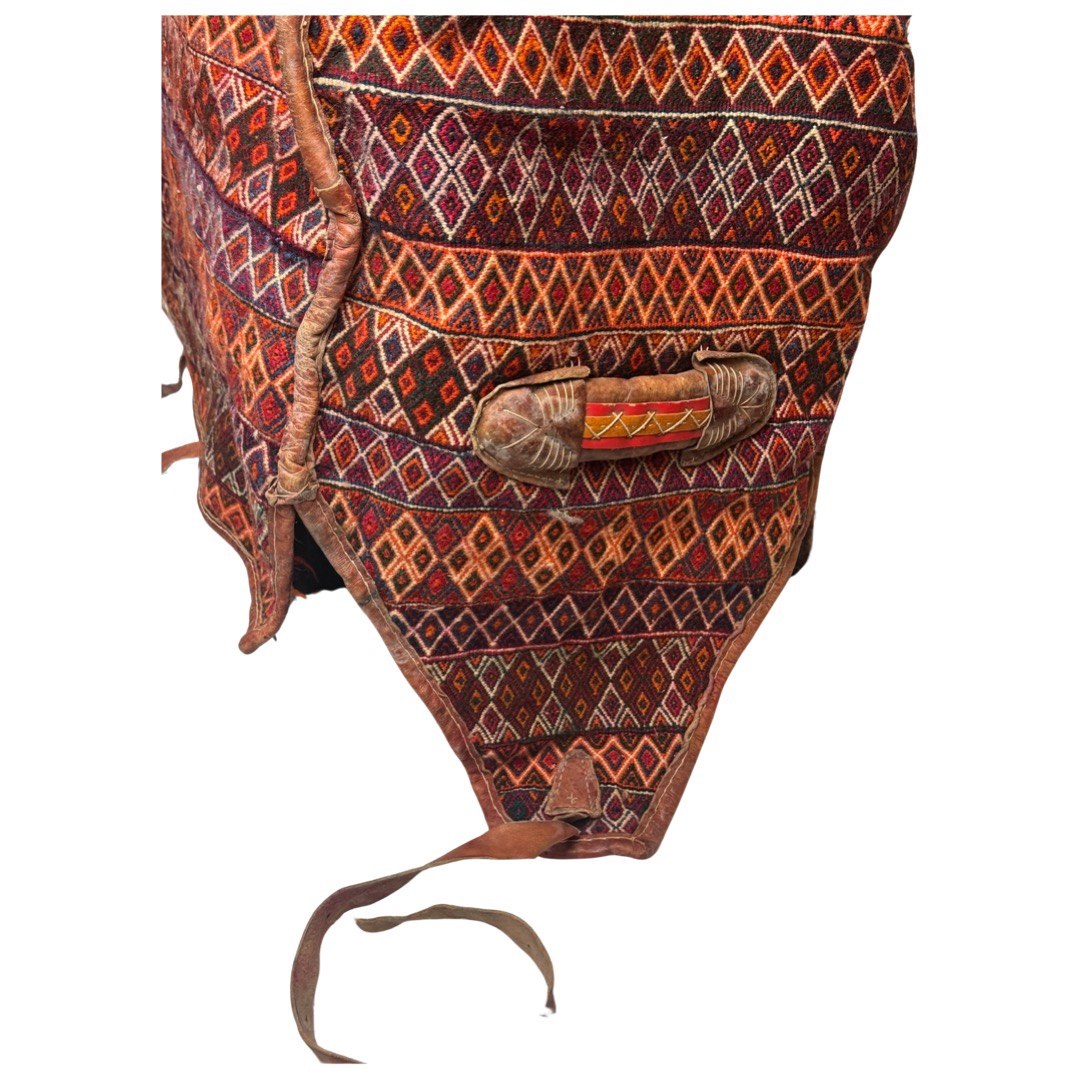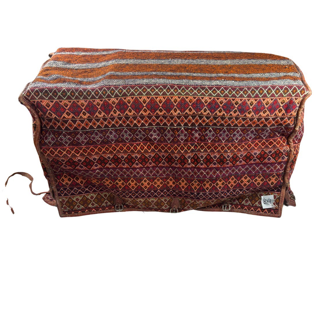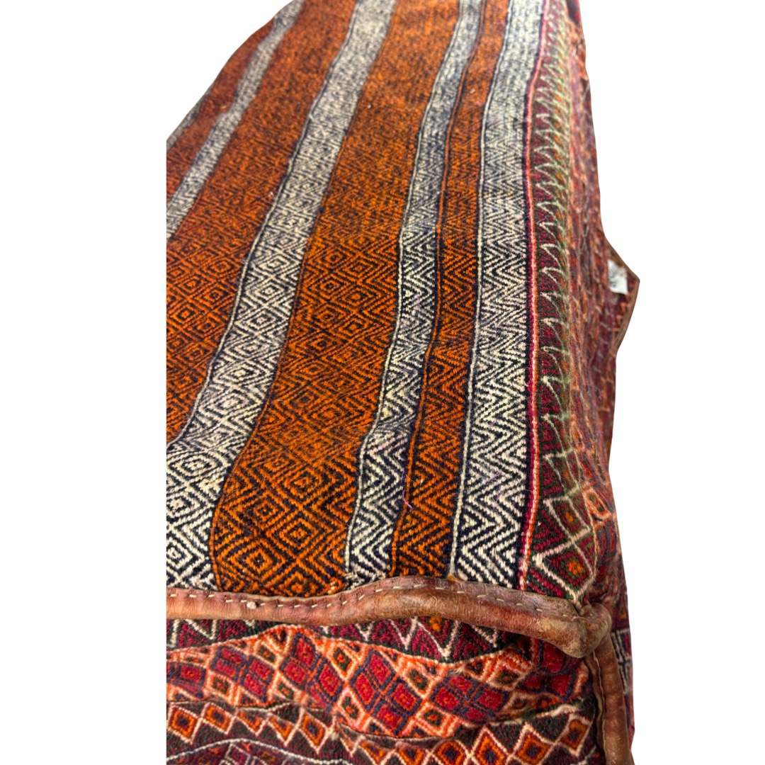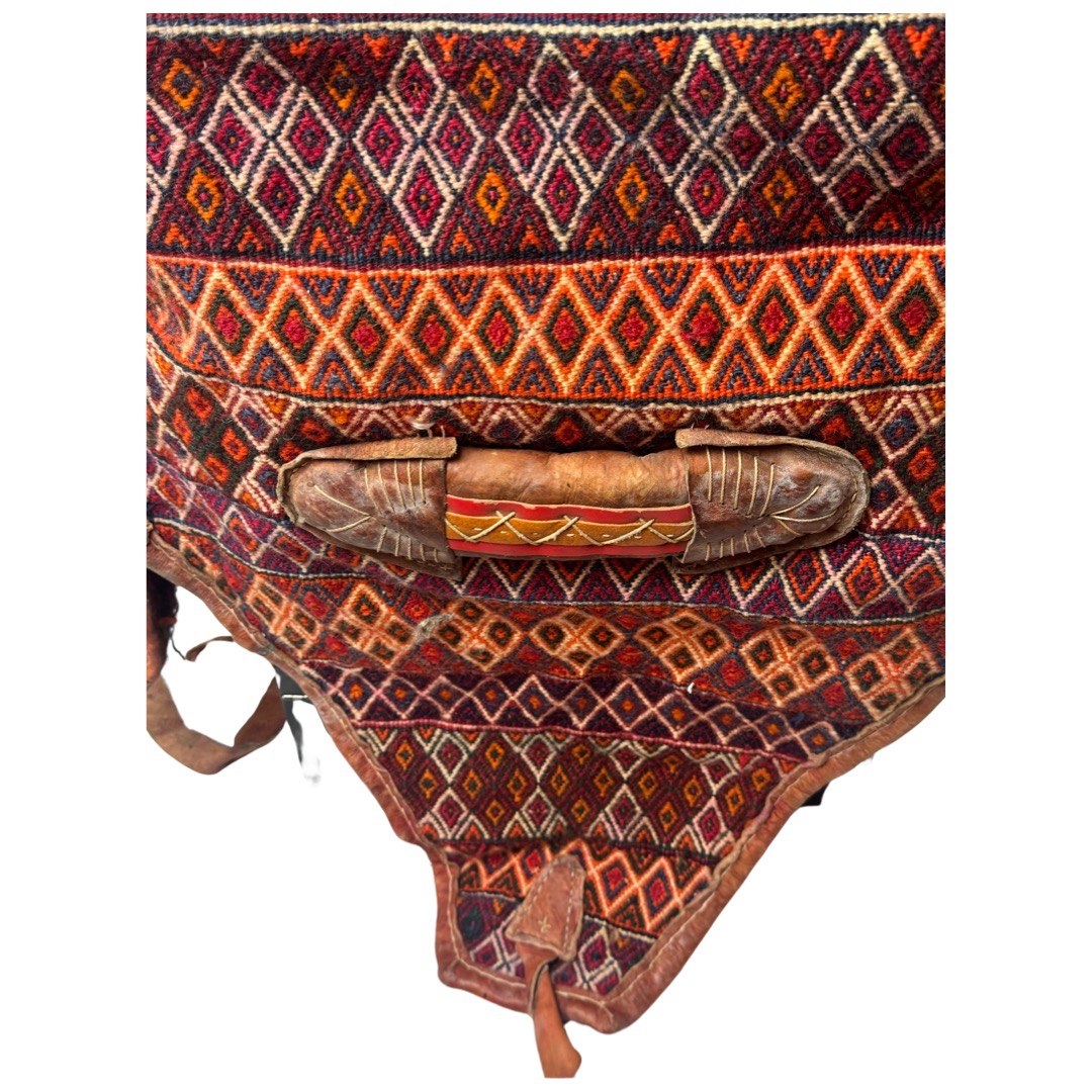 cargo bag or Mafrash - bedding bags, the front, back and side panels Hand knotted rug, mother and baby paisley repeating red and ivory , brown , within geometric motif secondary borders. Mafrash have been made in the largest numbers by Shahsevan tribal people and other groups in NW and across the border in Azerbaijan. Others were made in Georgia and Armenia. A majority are intricately woven soumak; others are slit-tapestry, sometimes with narrow contrasting soumak bands. Bags have been made by nomads for storage of bedding in their tents, and for use as cargo bags. They were normally made in pairs which could be balanced over the backs of camels on migration. In the marketplace, Mafrash were woven in three parts, and then assembled.