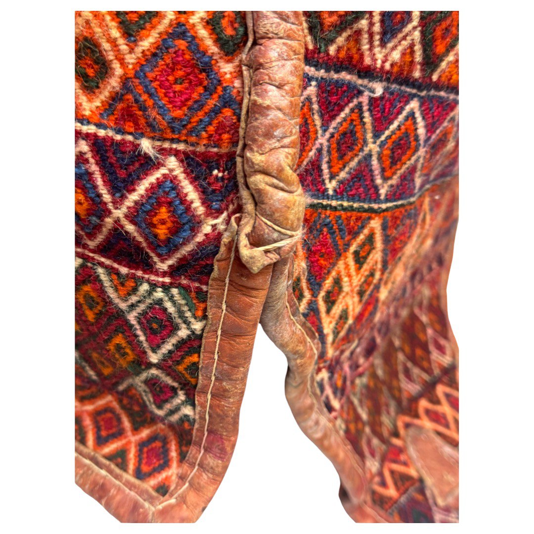 The materials are from vegetable dyes wool pile over cotton foundation with leather accierisse . The pattern is geometric style.
