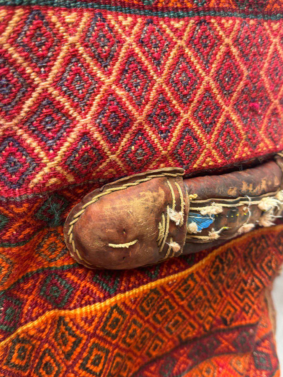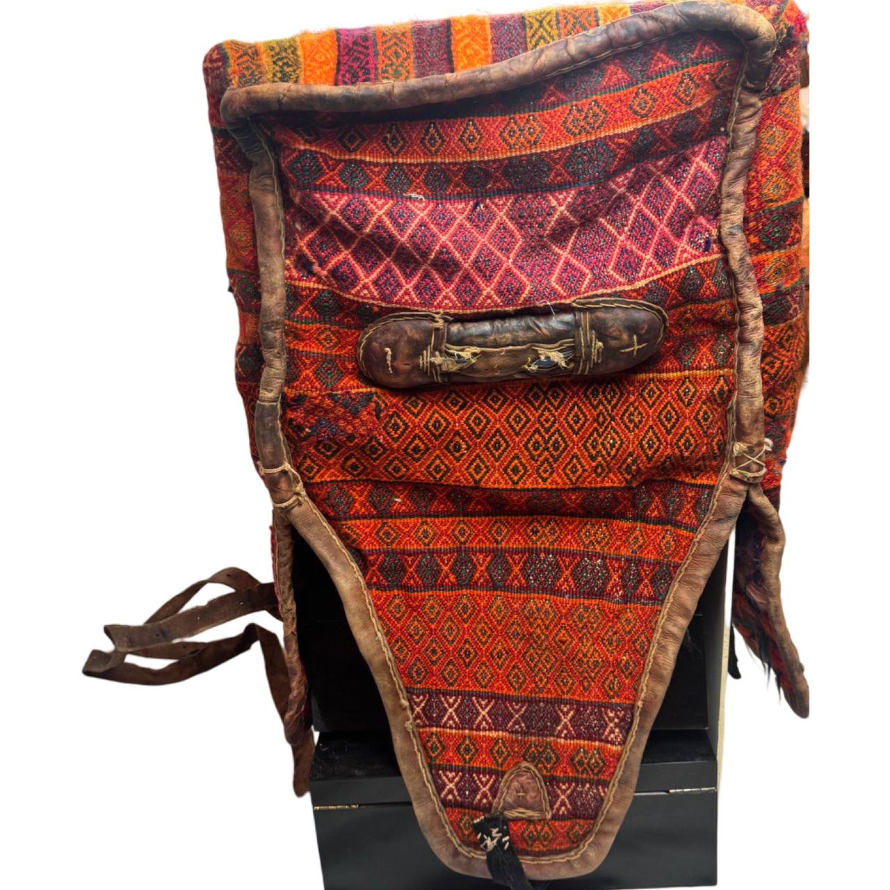 The materials are from vegetable dyes wool pile over cotton foundation with leather accierisse . The pattern is geometric style.