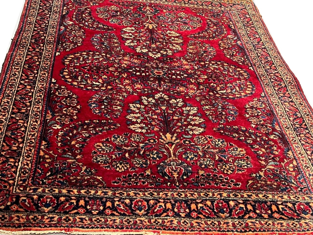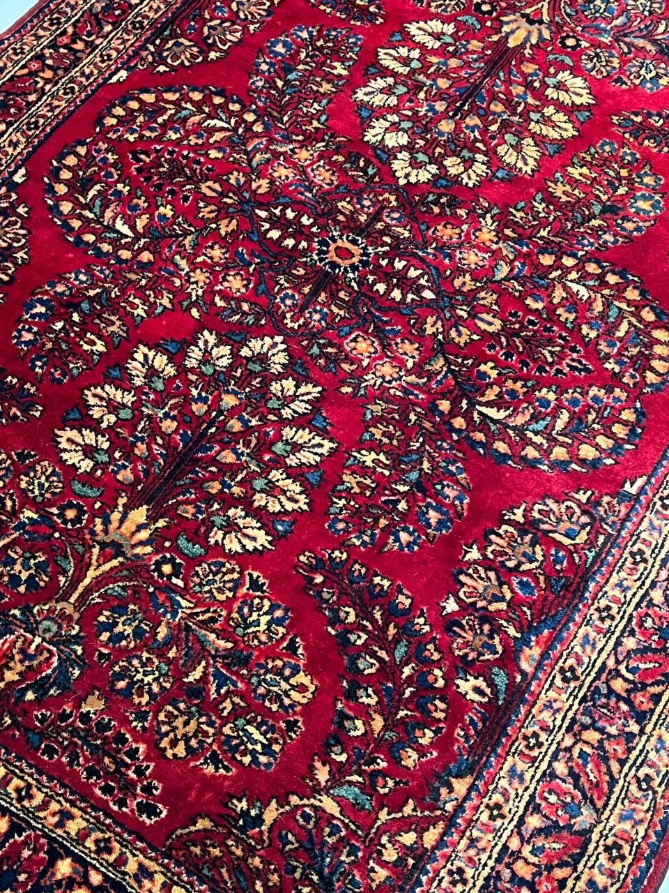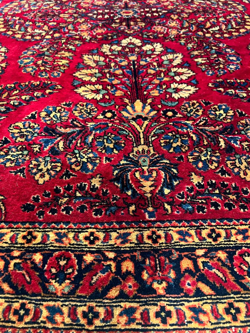 Antique Persian Sarouk rug. These vintage rugs bring traditional sophistication to your home. These rugs feature 100% premium lamb's wool pile hand-knotted into elegant designs, perfect for your elegant decor. Circa 1920.