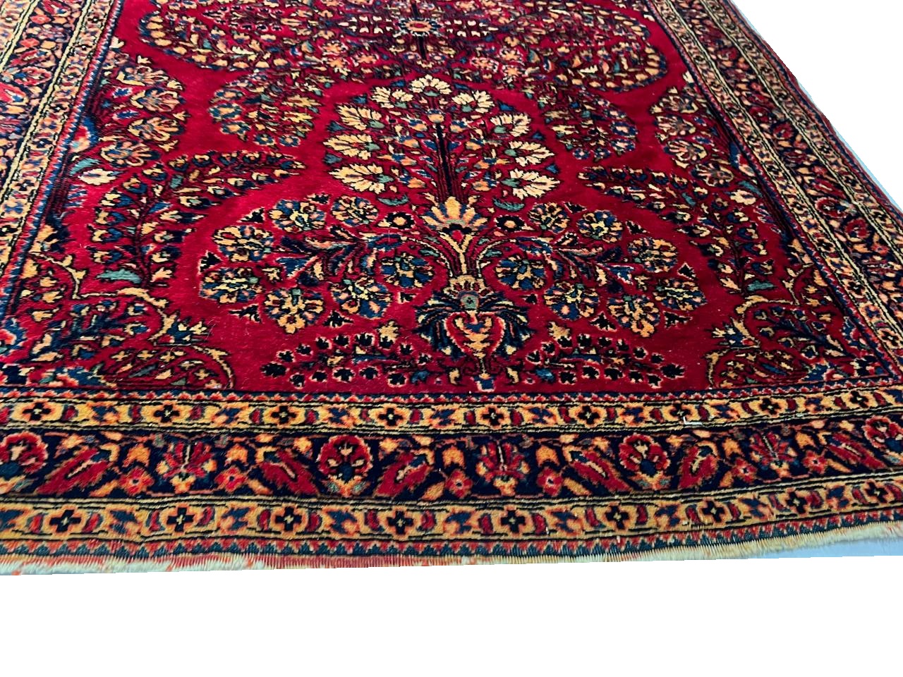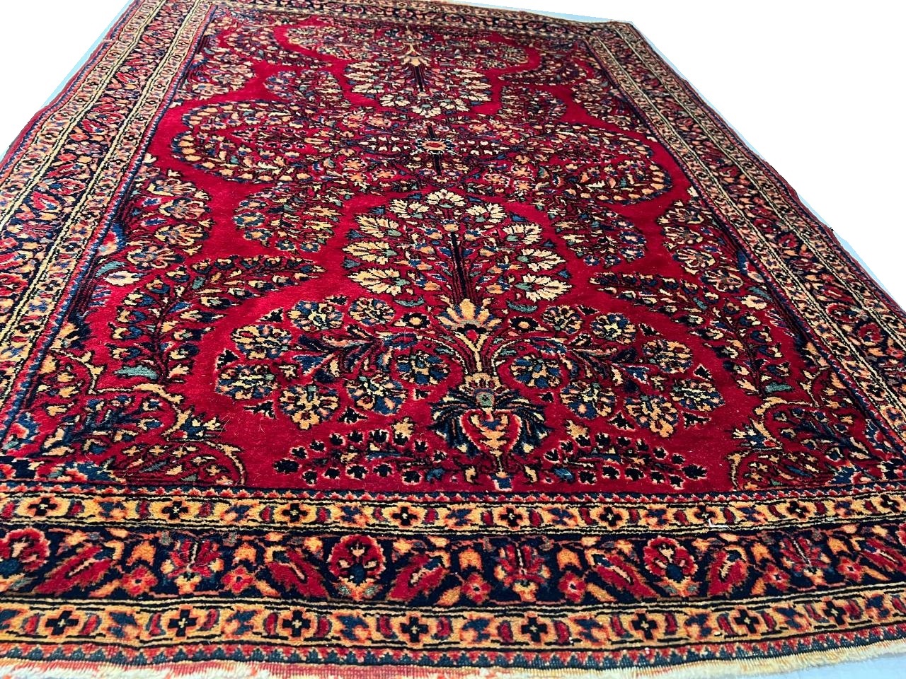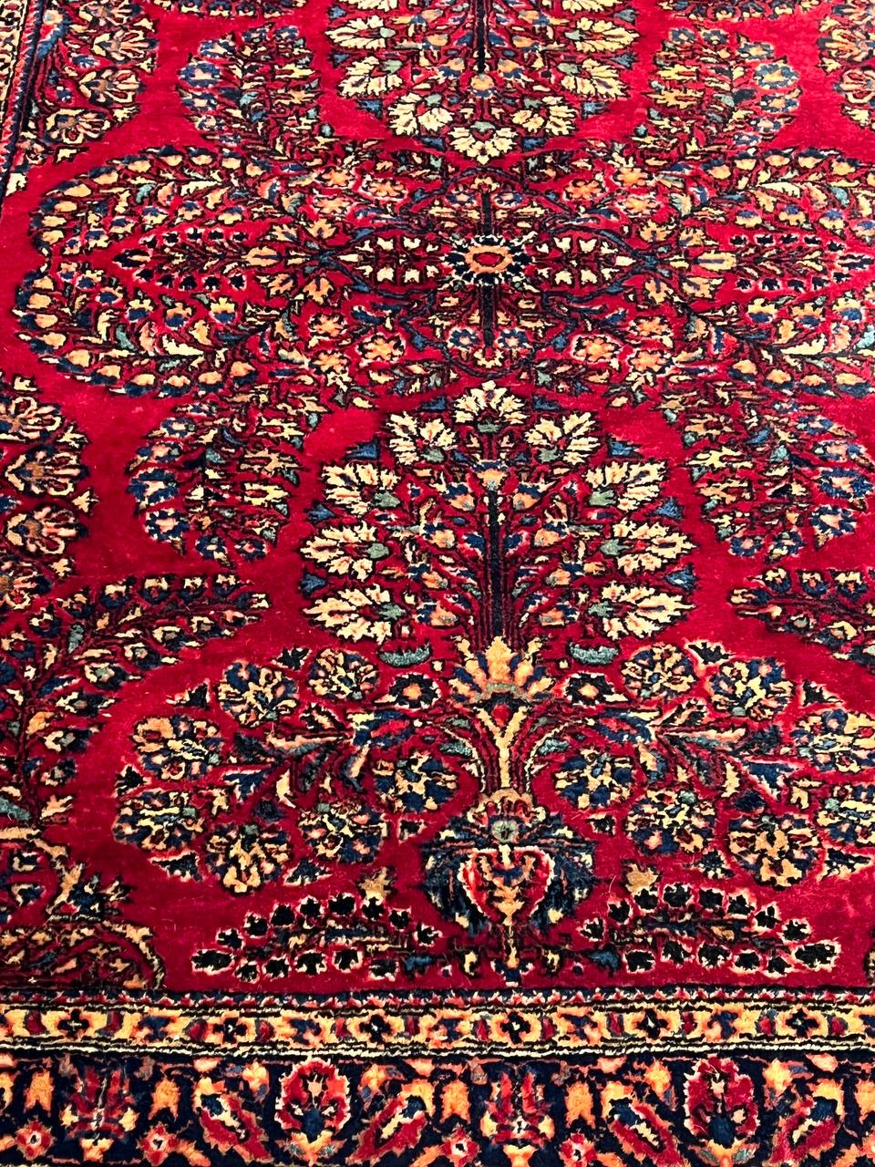 Antique Persian Sarouk rug. These vintage rugs bring traditional sophistication to your home. These rugs feature 100% premium lamb's wool pile hand-knotted into elegant designs, perfect for your elegant decor. Circa 1920.