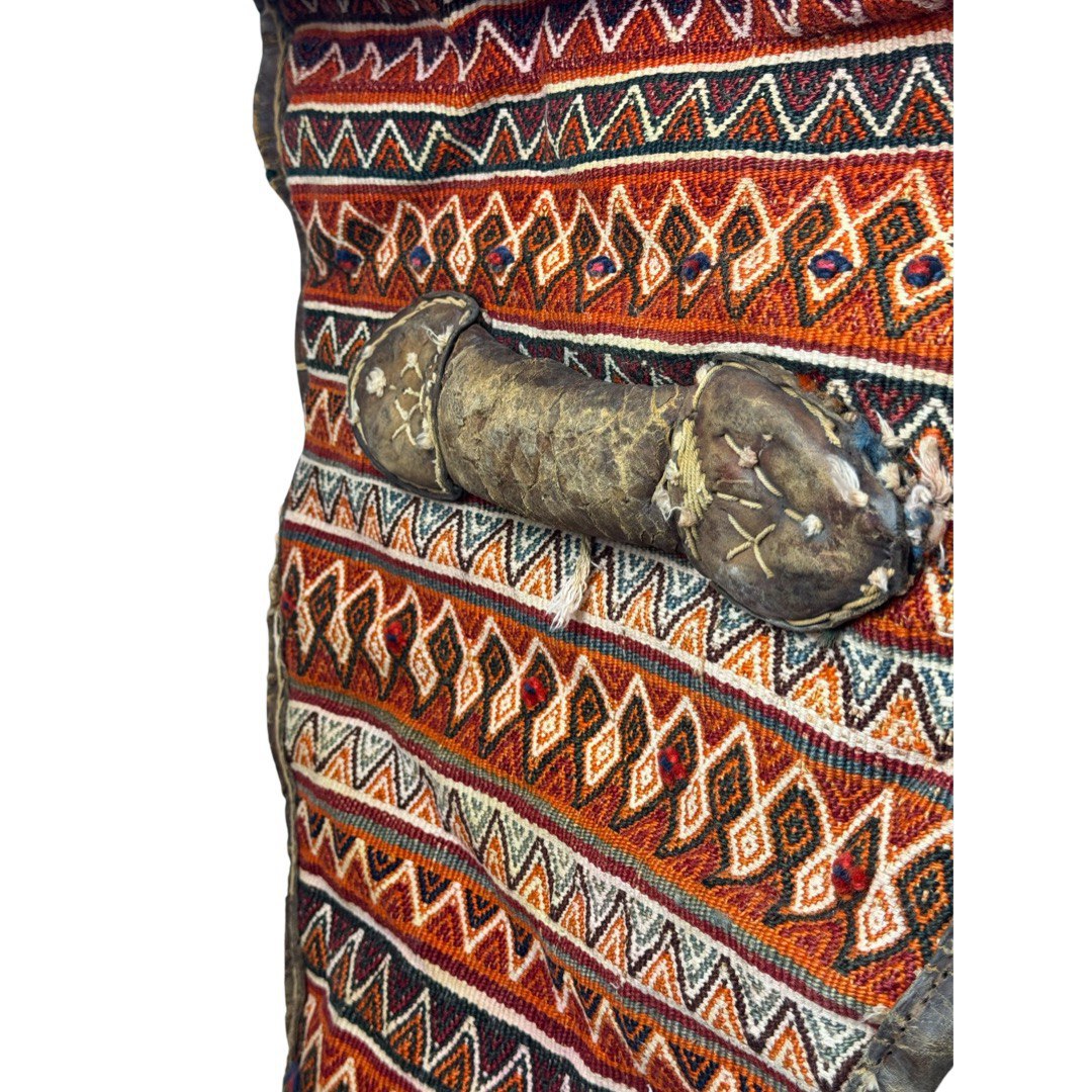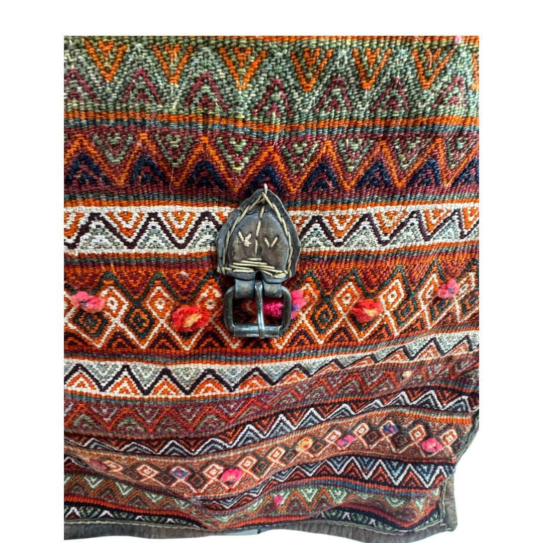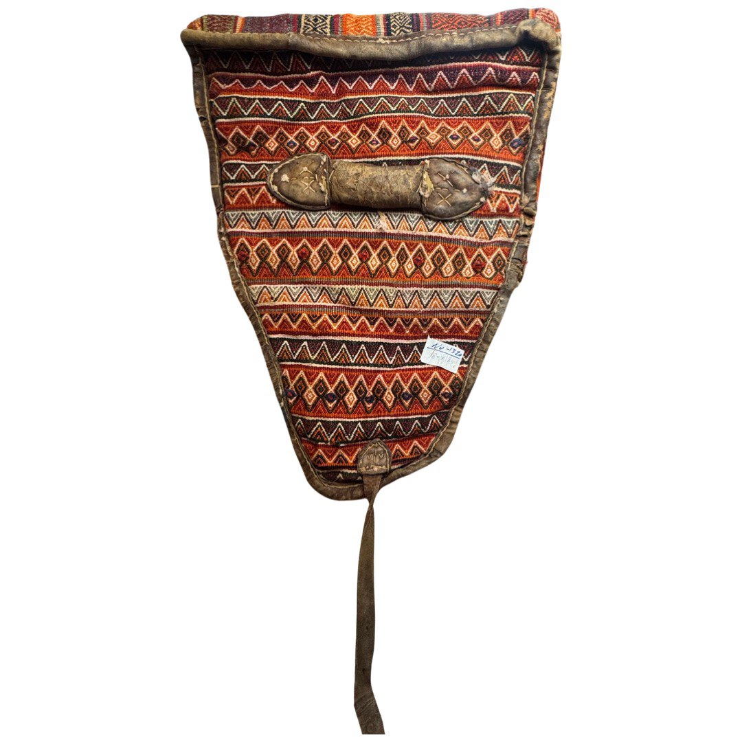The materials are from vegetable dyes wool pile over cotton foundation with leather accierisse . The pattern is geometric style.