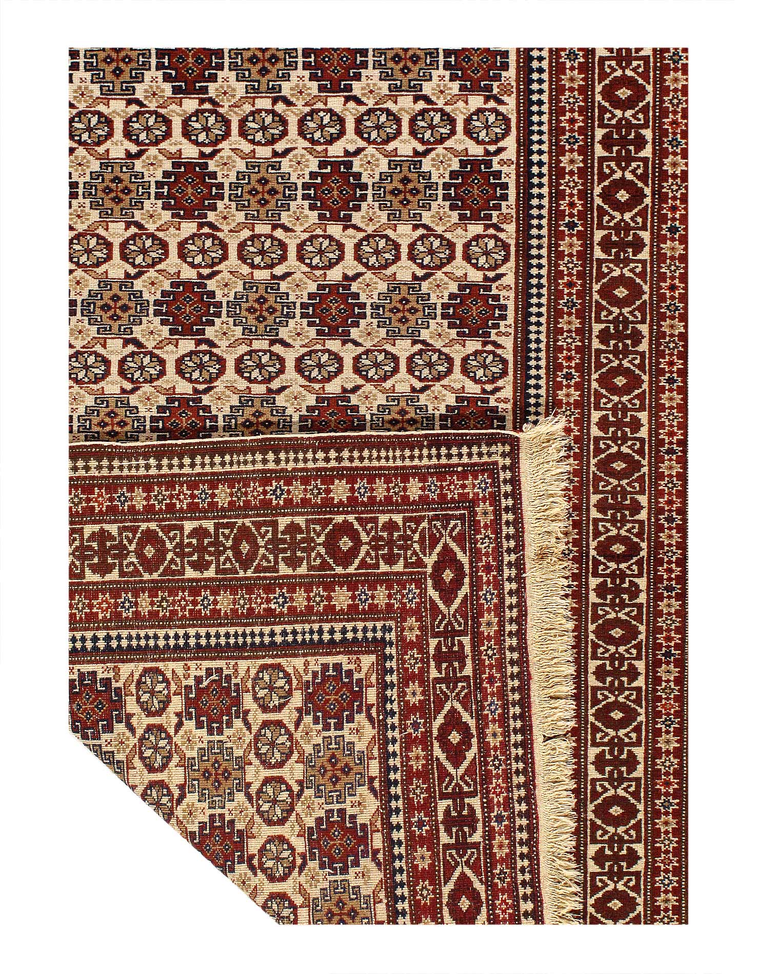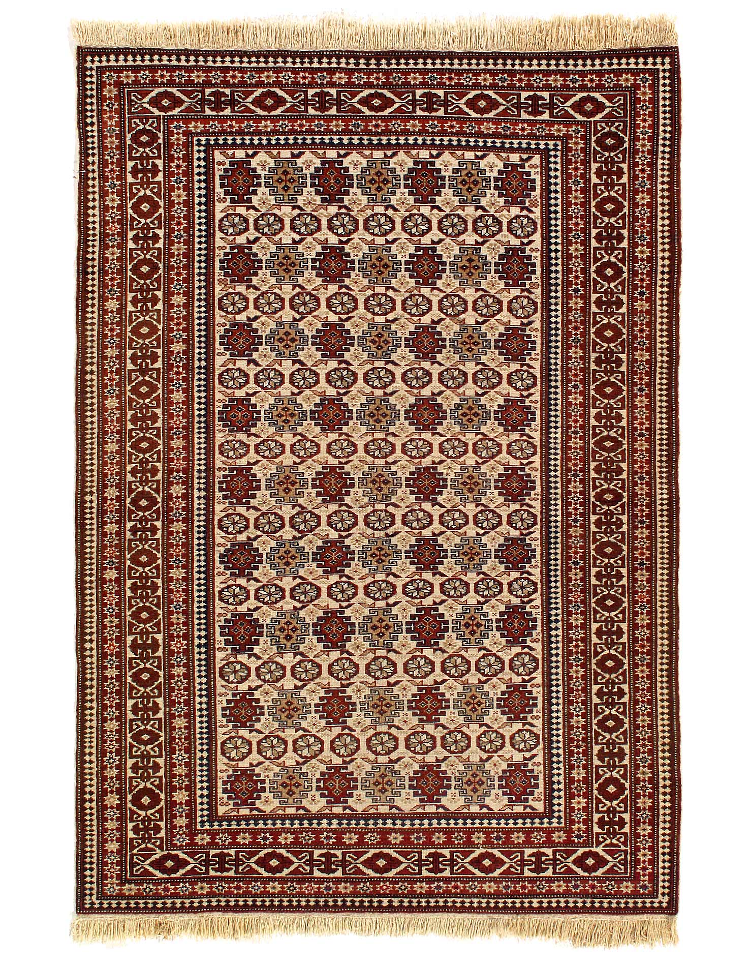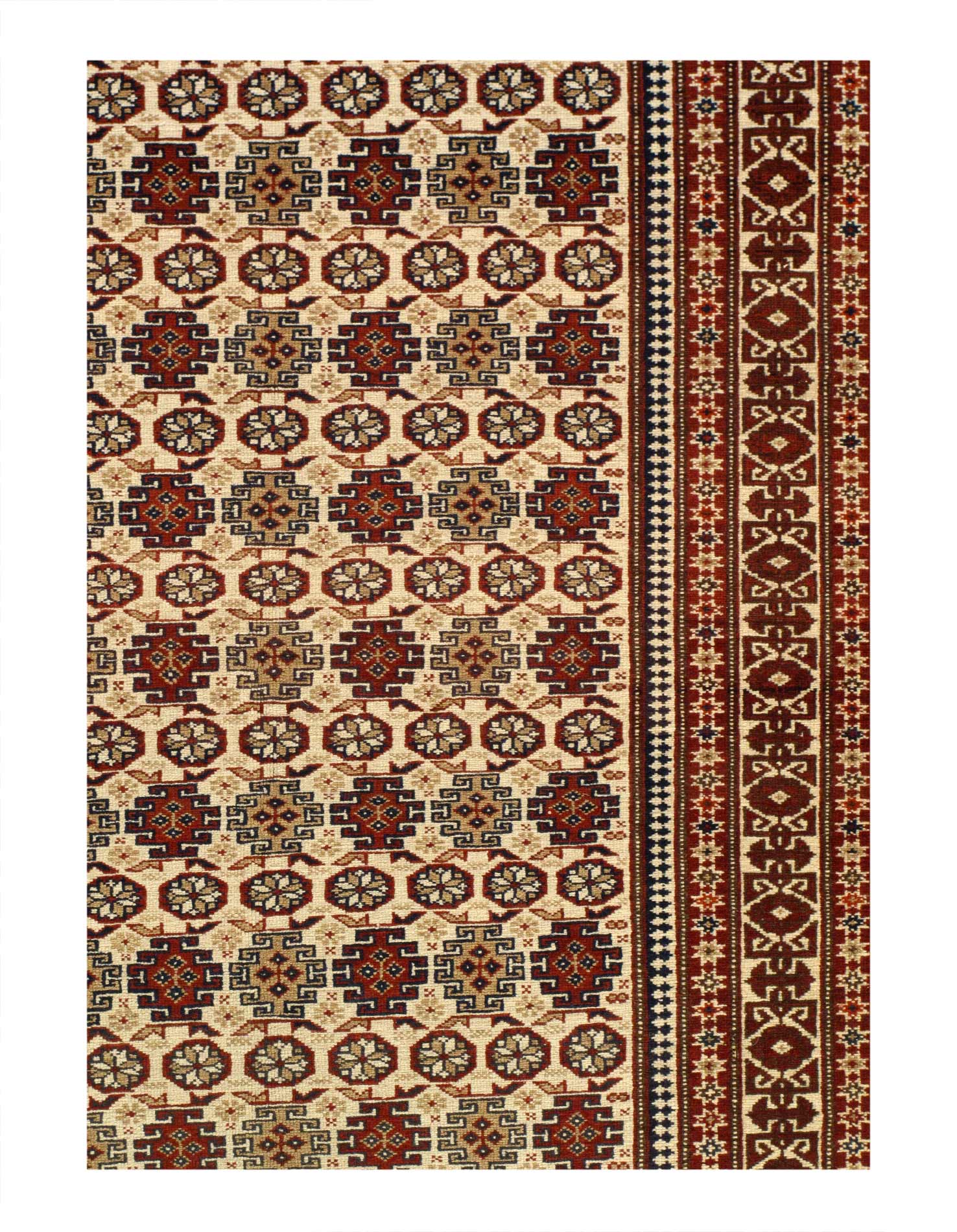 A meditative complexity gives this antique Turkish rug an irresistible visual appeal, depicting a branching network anchored within a stylized pitcher vase. A series of red, gold and black bar enclose this floral display. Above this pointed field, more ivory poppies throng, stippling the red space. A series of borders encloses the piece, alternating ivory and rose. Each bears a unique floral decoration, with the most ornate pieces in the widest band