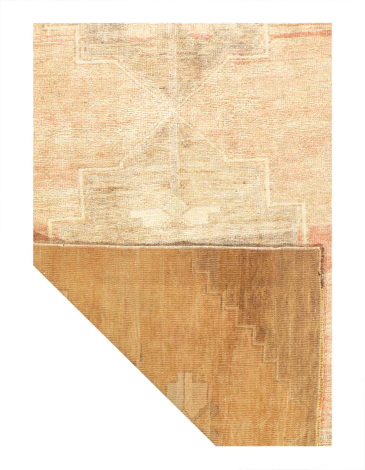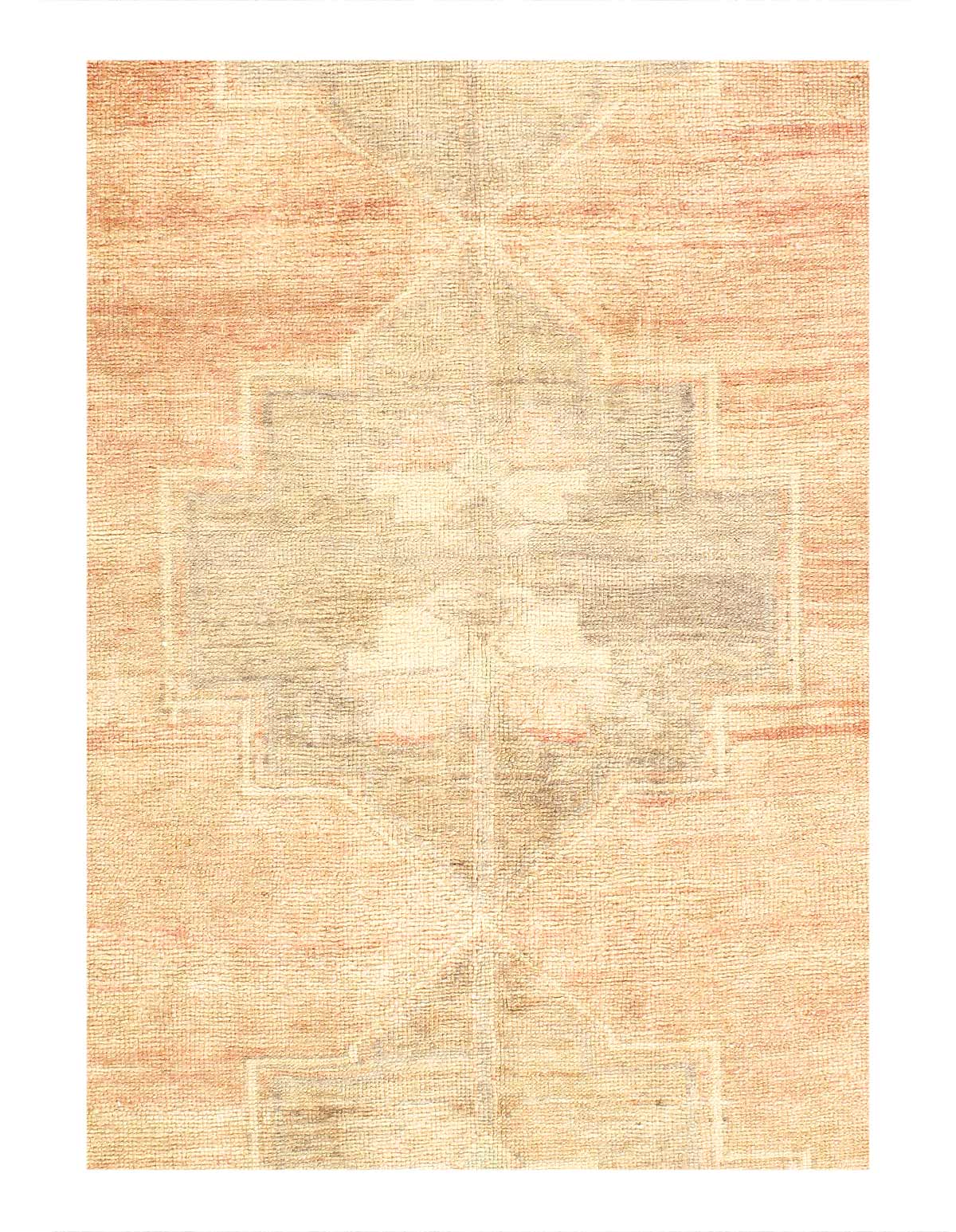 This low pile carpet has a color palette in muted blush beige, blush pink, cream, beige and tan. It has a yellowish tone to it.