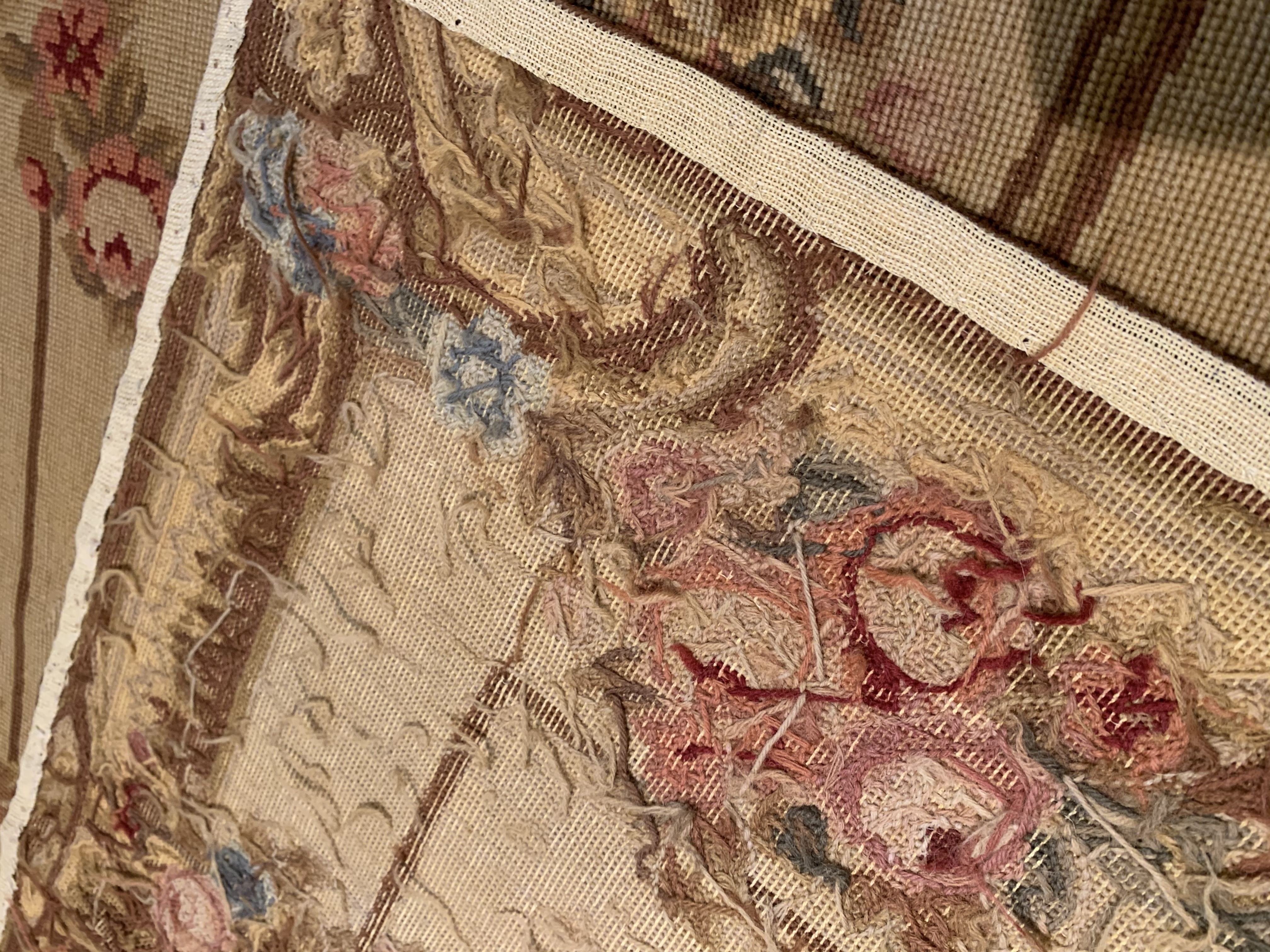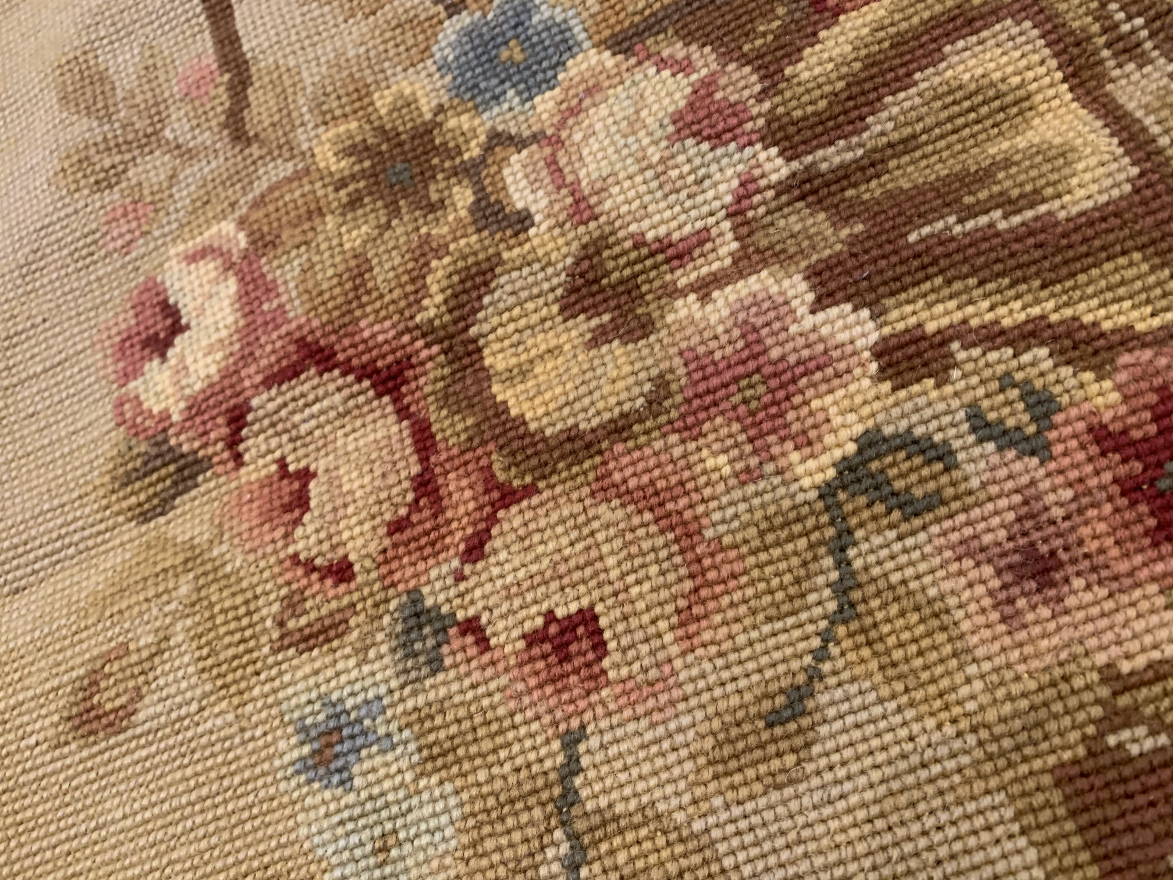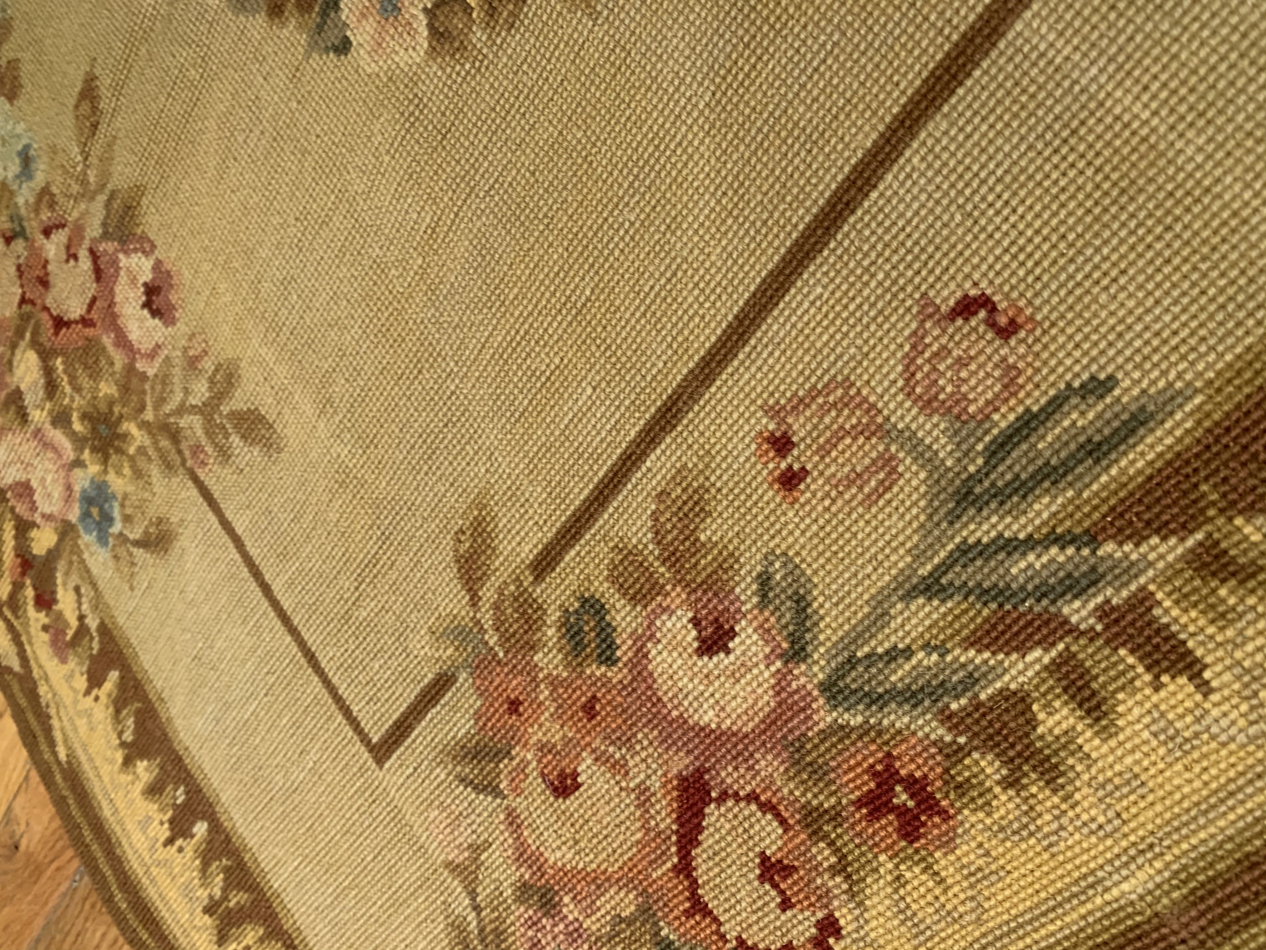 Needlepoint is one of the oldest weaving techniques, where design is created by stitching various colors of yarn on a canvas. Needlepoint designs are mostly floral with occasional birds and butterflies. French Aubusson - as well as a variety of European designs are also used on needlepoint rugs frequently.