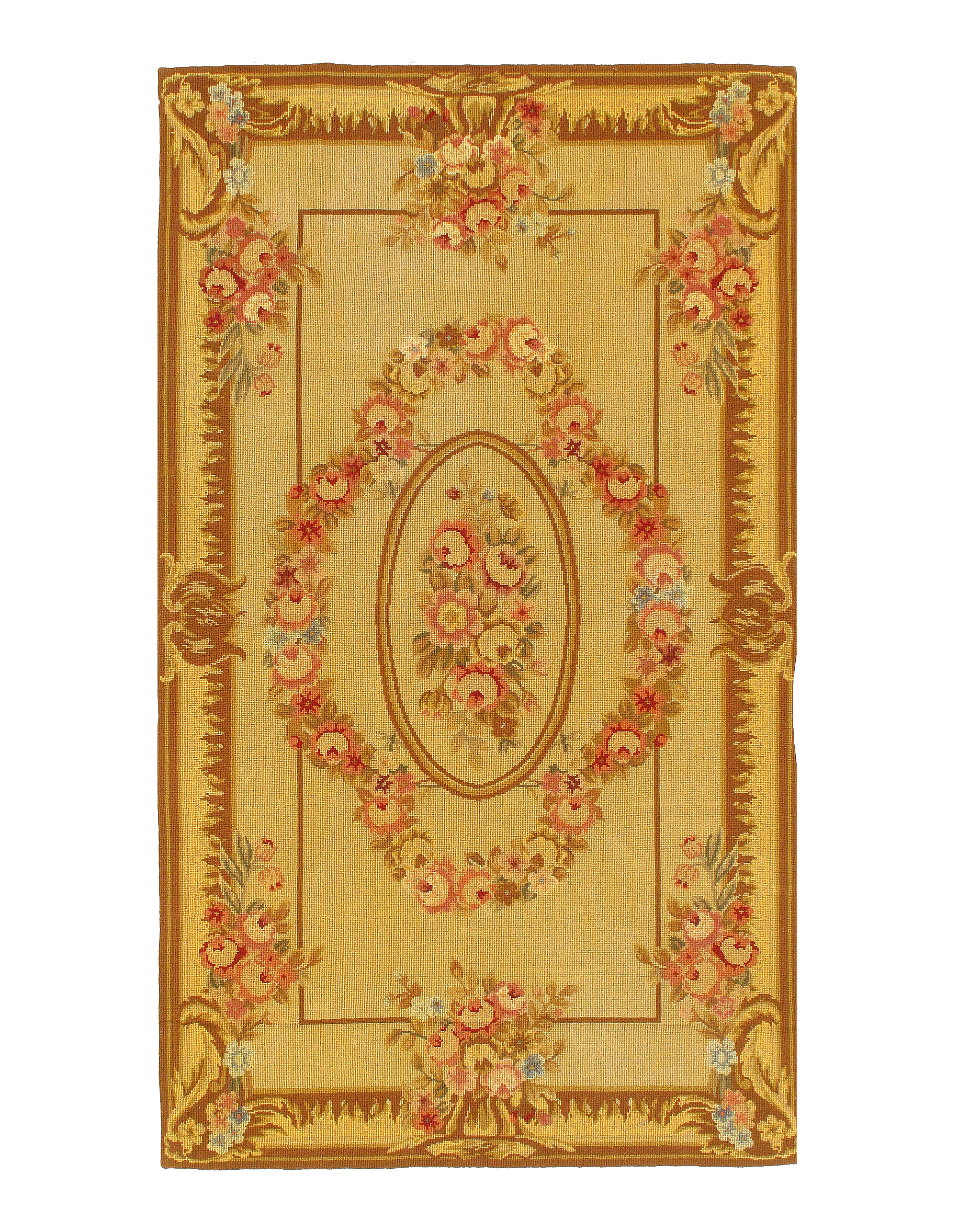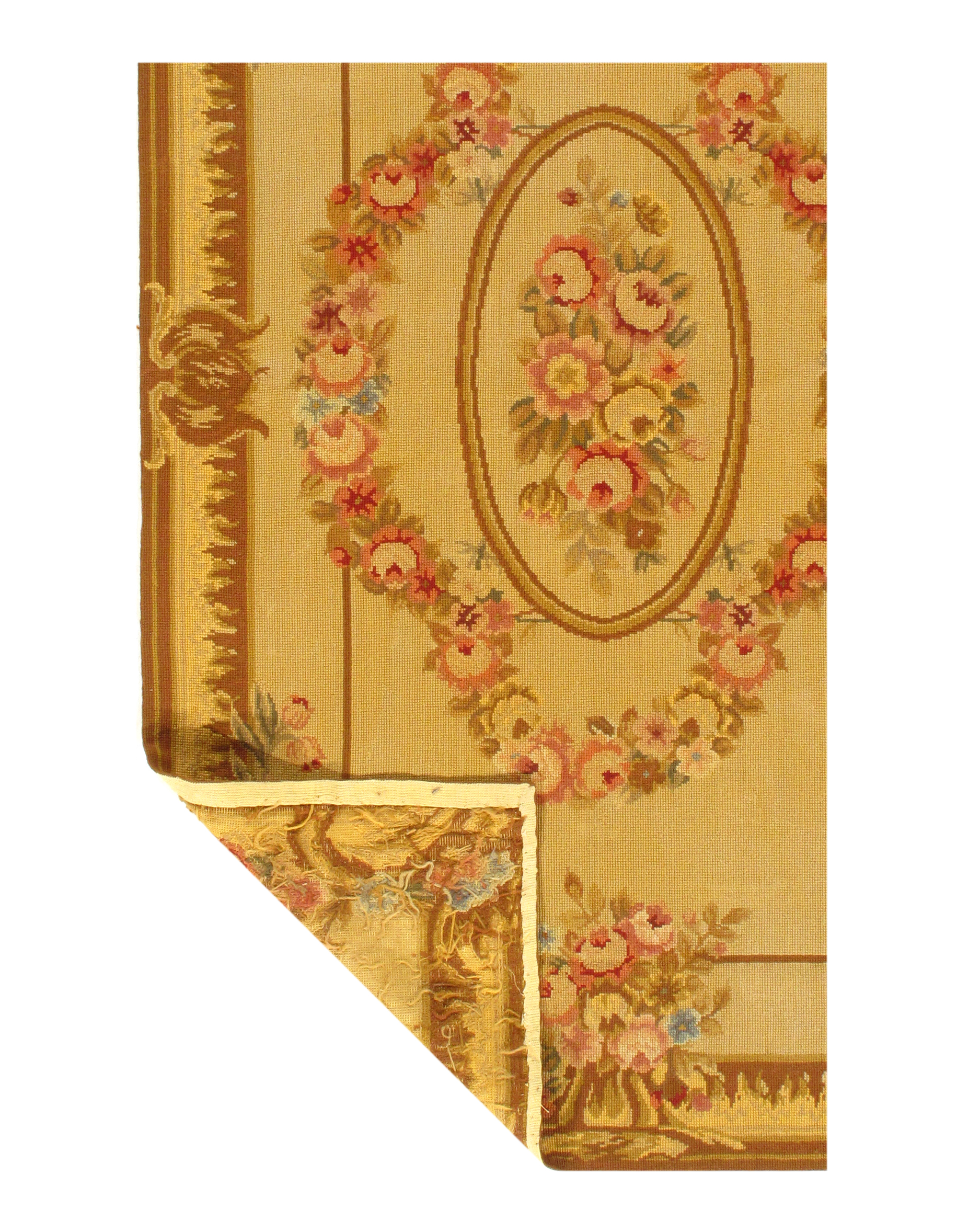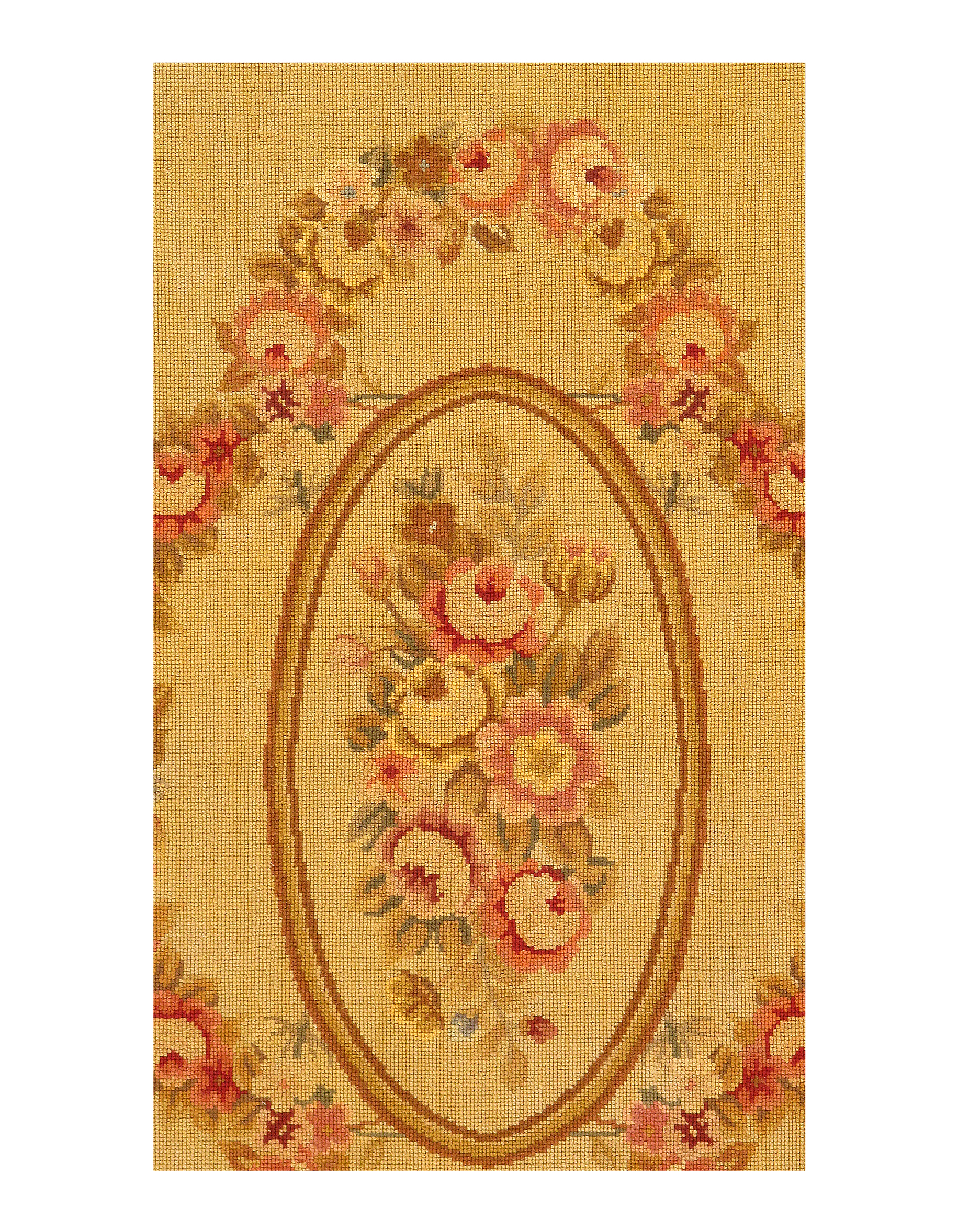 Needlepoint is one of the oldest weaving techniques, where design is created by stitching various colors of yarn on a canvas. Needlepoint designs are mostly floral with occasional birds and butterflies. French Aubusson - as well as a variety of European designs are also used on needlepoint rugs frequently.