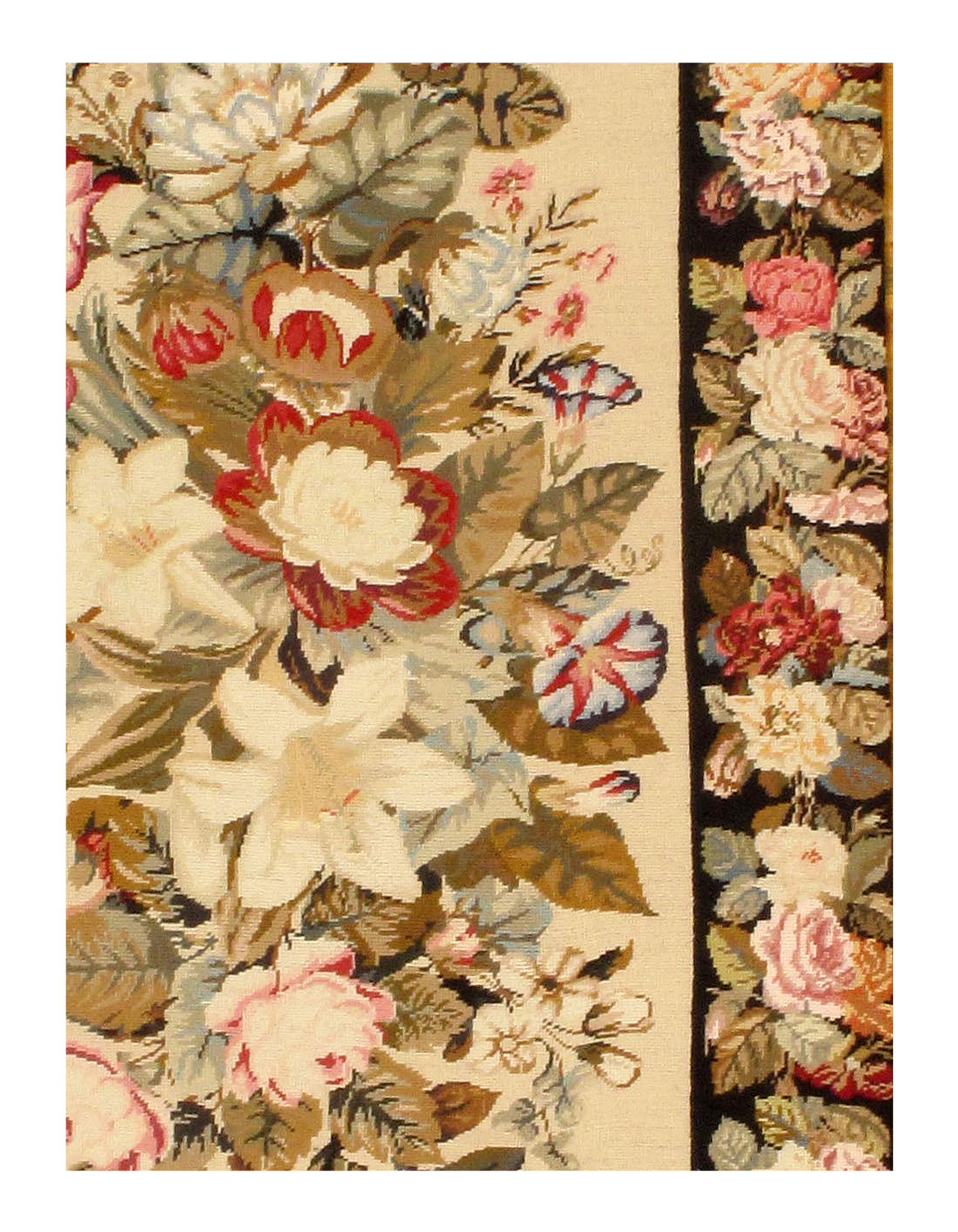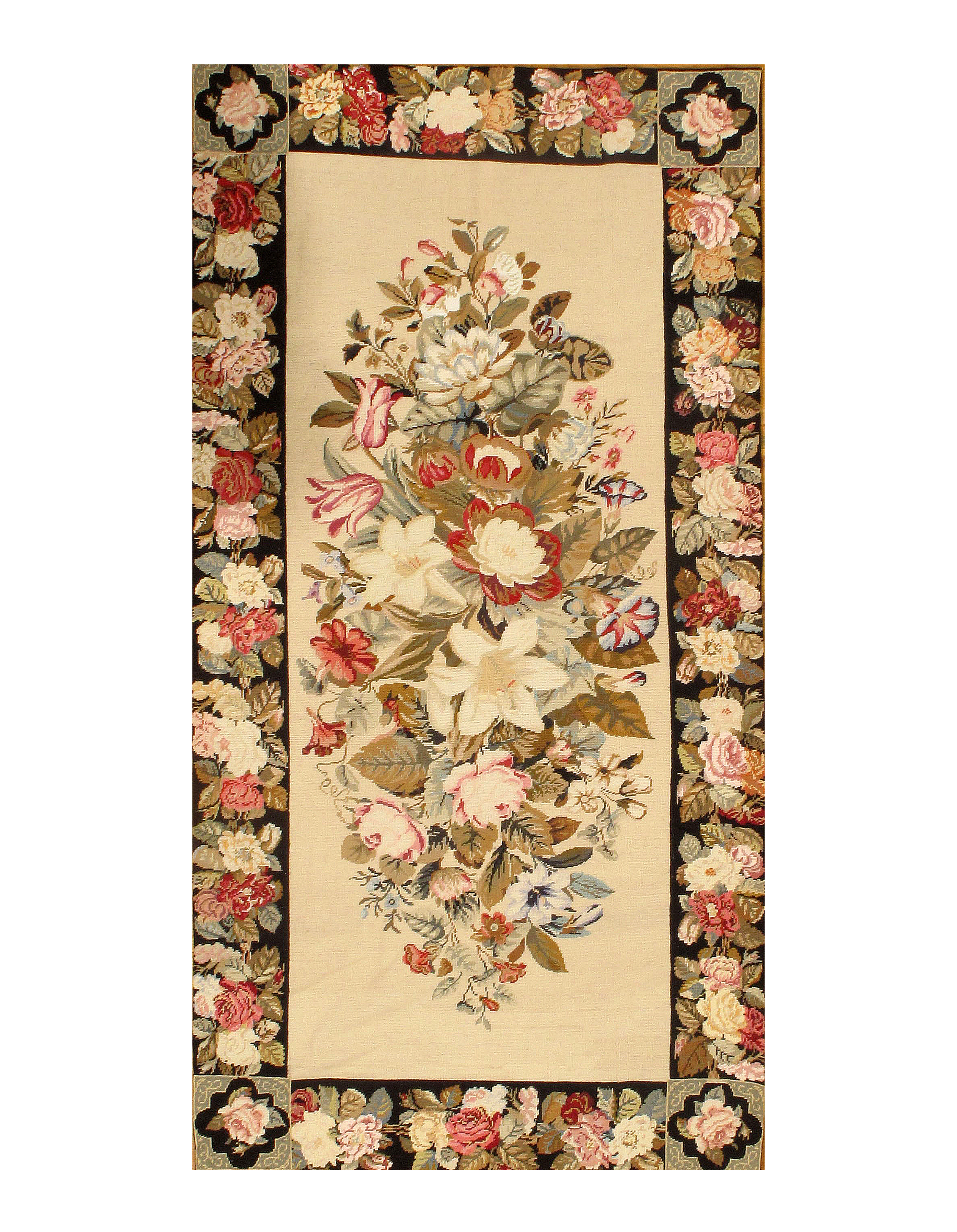 Needlepoint designs are mostly floral with occasional birds and butterflies. French Aubusson - as well as a variety of European designs are also used on needlepoint rugs frequently.
