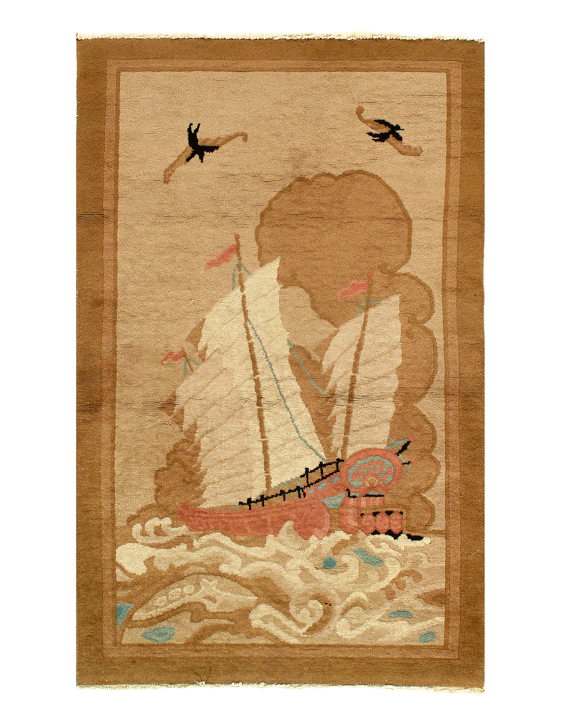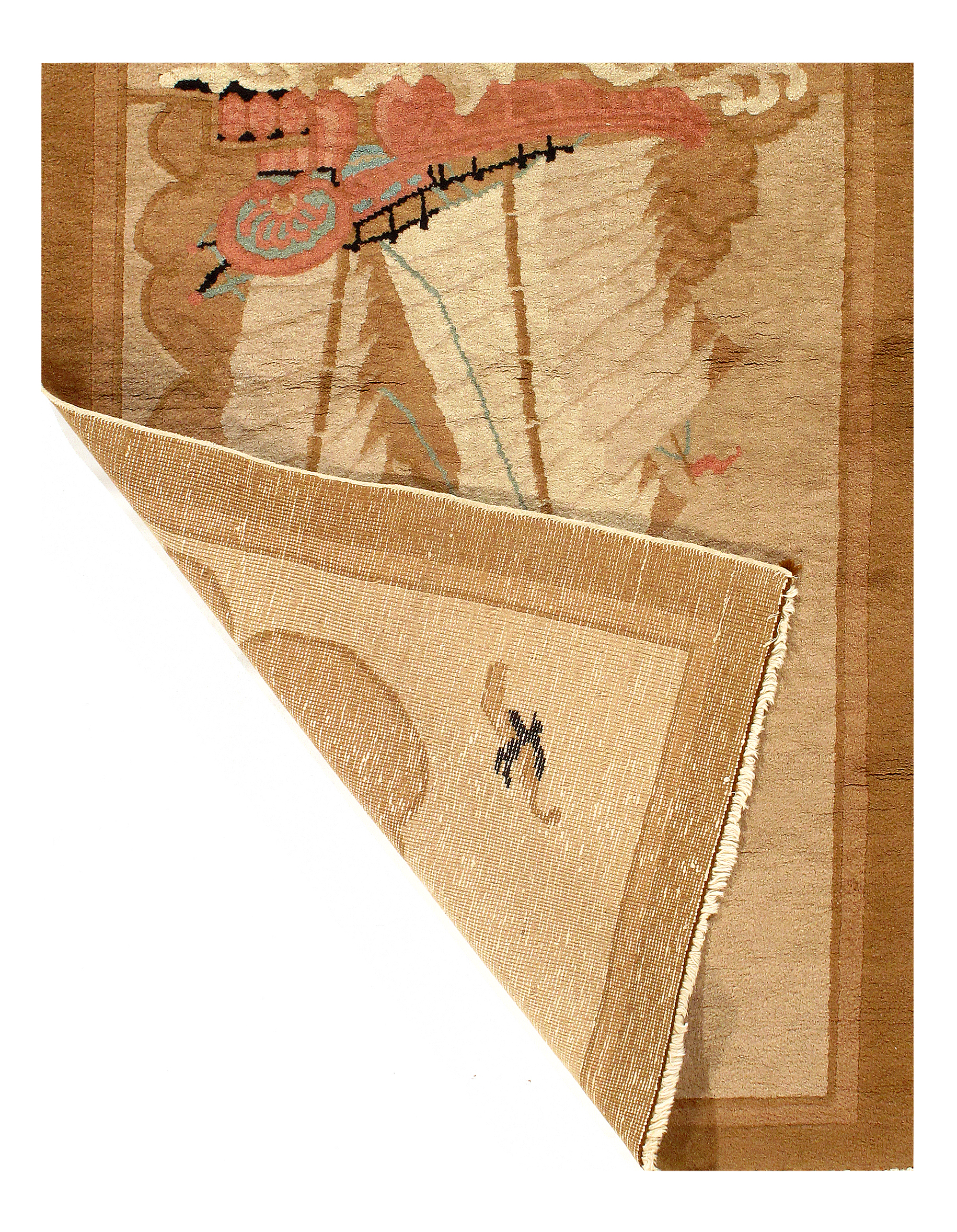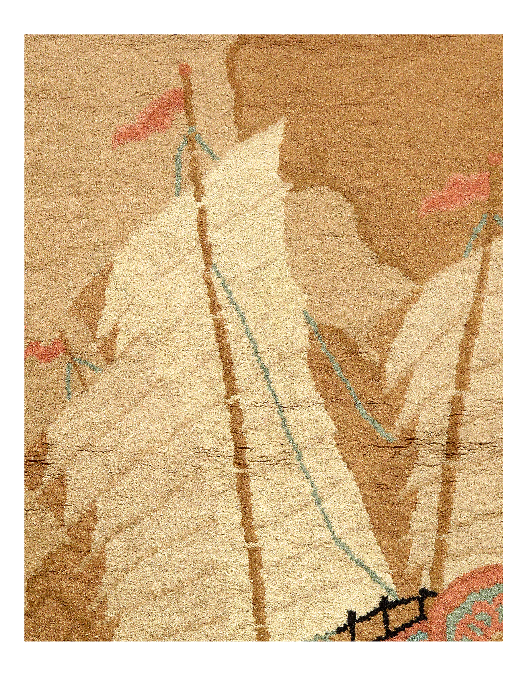 Beautiful Beige Background Antique Art Deco Carpet, Country of Origin: England, Circa Date: 1930 – This antique English rug, which features a breathtaking Art Deco carpet design is elegant in its simplicity, establishing an understated charm that only adds to its visual value. It is comprised of earthy colors, made even more inviting and comfortable by the presence of several warm elements throughout the rug. A single deep ivory border surrounds the elements within, creating a grounding frame that conveys luxury and style. Within this frame are several rectangular shapes, light in color and arranged irregularly around a darker centerpiece. This antique rug is a Light Brown that connects with the outermost layer, reminiscent of a forest canopy overlooking the loamy earth. Three arrangements of horizontal stripes are present in the composition, one at the upper left corner, one at the center and one at the lower right corner, Beige in color, themselves further broken up by a brown streak of color running vertically at different points.