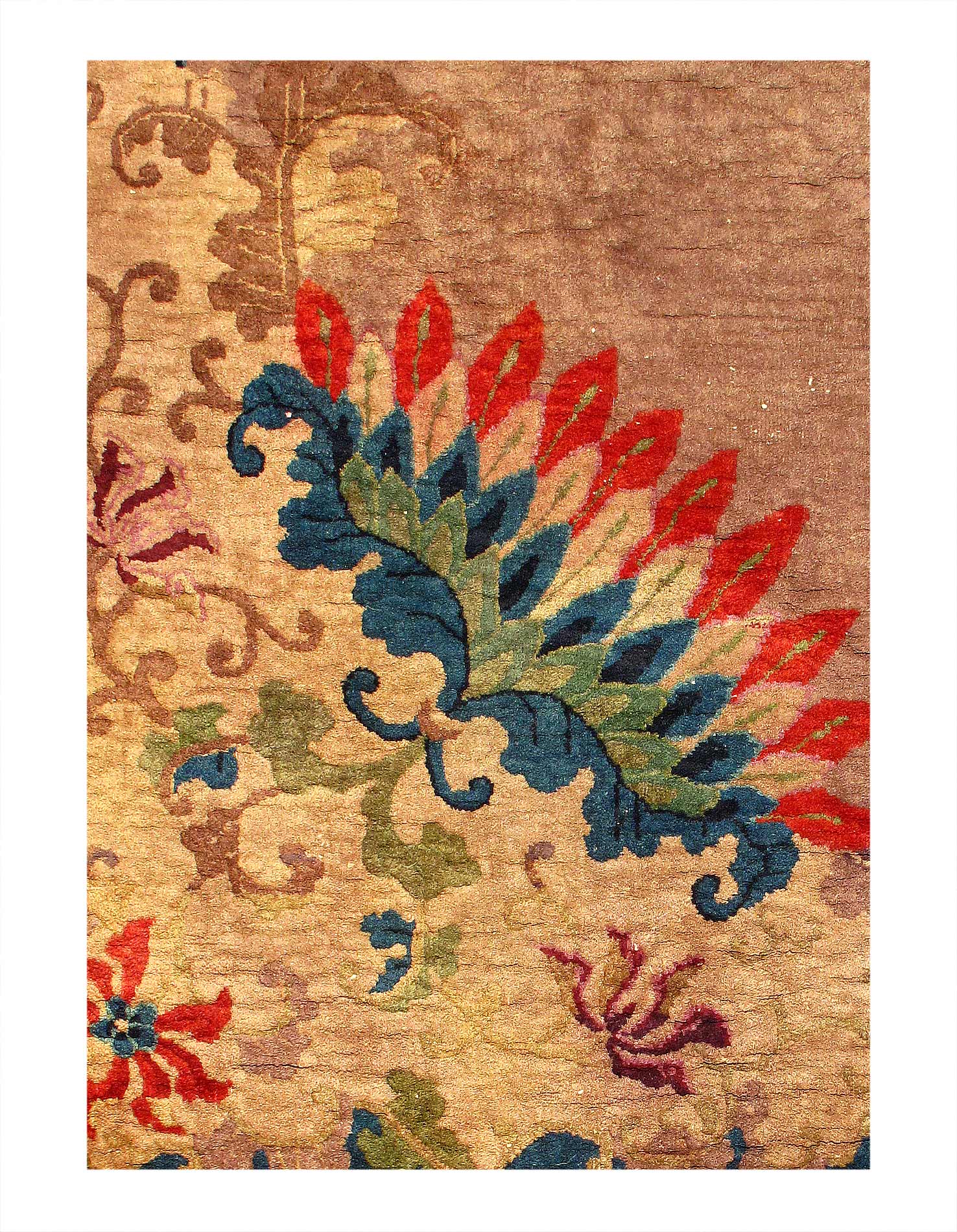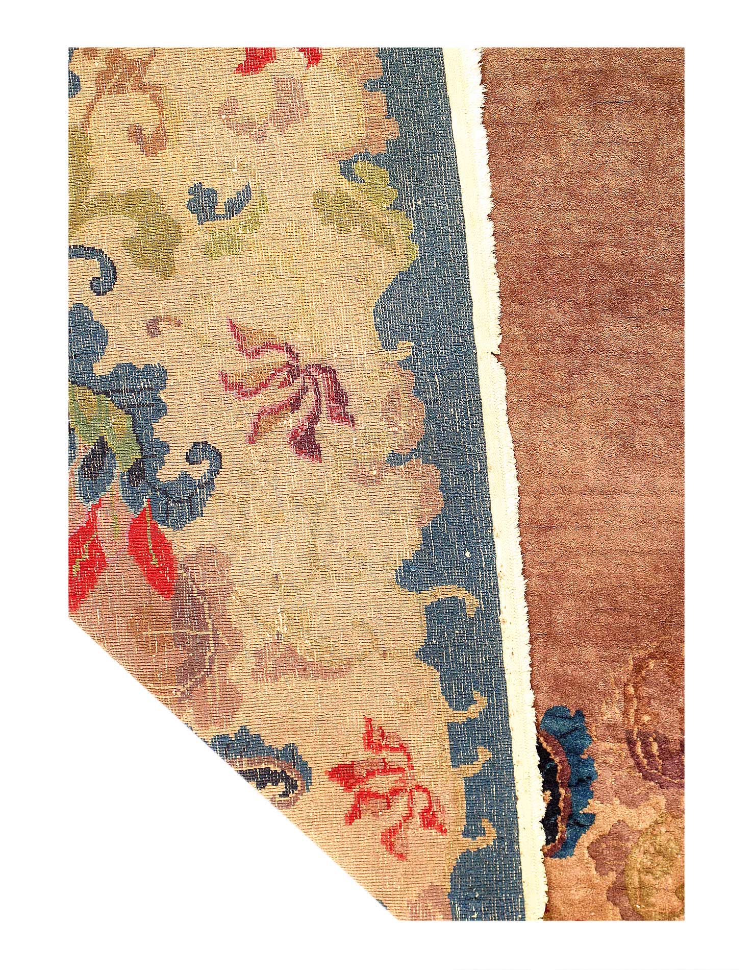 Chinese Deco Rug, Origin: China, Circa: Early 20th Century – Here is an exciting and appealing antique Oriental carpet – an antique Art Deco rug that was designed and woven in China during the early years of the twentieth century. Heavily informed by the aesthetic inclinations of the Art Deco period, this unique carpet is a compelling and thought-provoking example. A scalloped border of Blue encloses a Rose / Rust sand field on this exquisitely subtle and restrained antique Chinese Art Deco. At first the field appears empty or open, but it is actually covered by a tone-on-tone design of scrolls and cloud-bands emanating inward from the outer edges. In their sinuous rhythms they echo the scalloped forms of the border and continue its visual effects across the carpet in a more subdued manner. This carpet testifies to the masterful design sensibilities of Chinese weavers as they made the transition into the modern world. The Art Deco movement had an outside influence on the world of art and design, and some of the most important qualities and characteristics of that movement may be found in this fine rug.