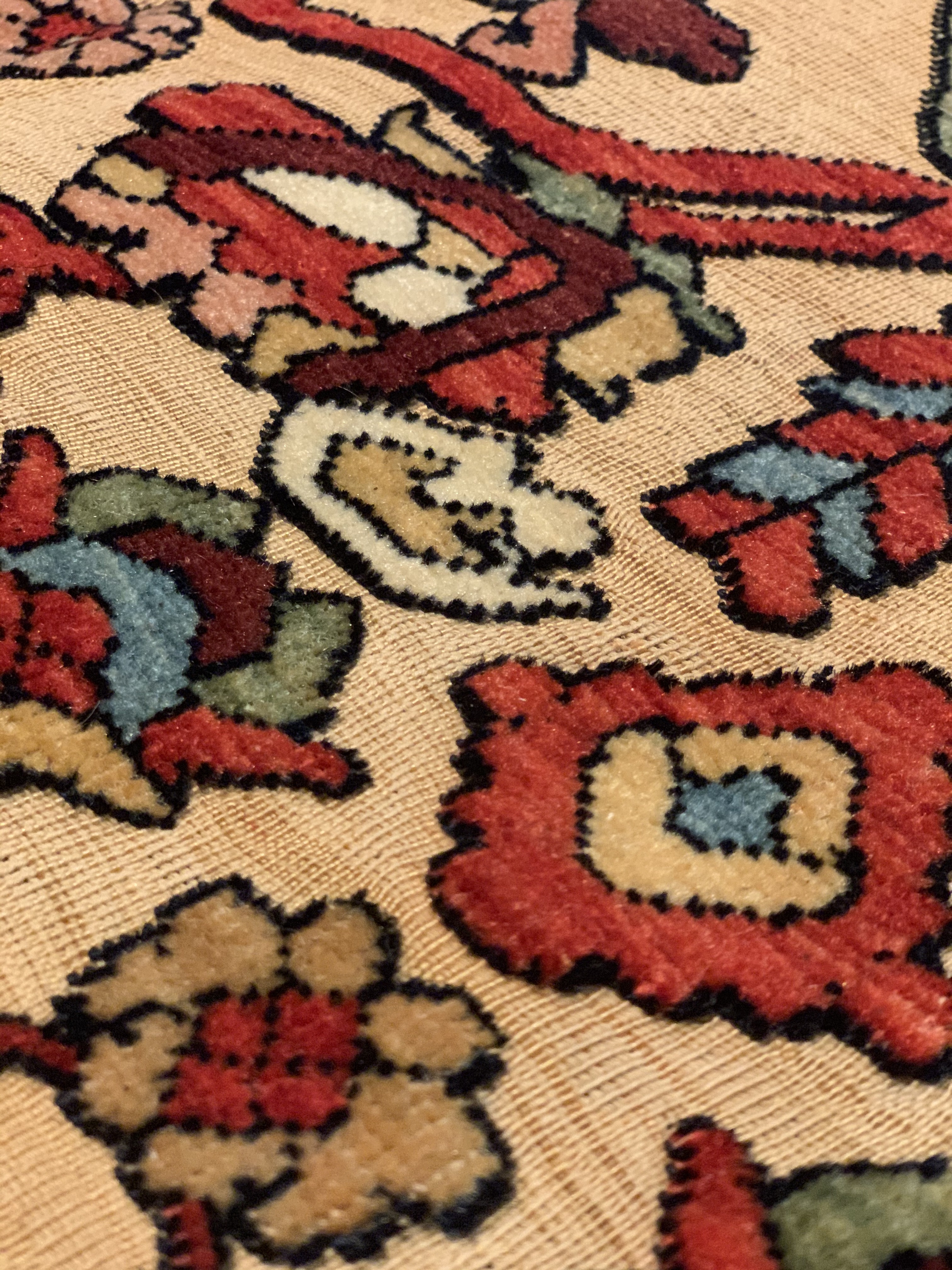 Souf rugs are very rare technique found as they have a raised low and high pile technique. They are popular in Iran and little understood elsewhere except by Persians and people who really know Fine carpets. Thy have a 3-d dimensionality that you can’t find in other carpets. Additionally a Souf is art it is not meant to be walked upon. A Souf is a rug that combines flat-weave and pile. Typically the ground is done in flat-weave and the design is executed in pile. Metal wrapped thread is often used. Kashan is traditionally the home of Souf rugs but we also see them from Qum. There are also tribal Soufs which I believe come from Khorasan.
