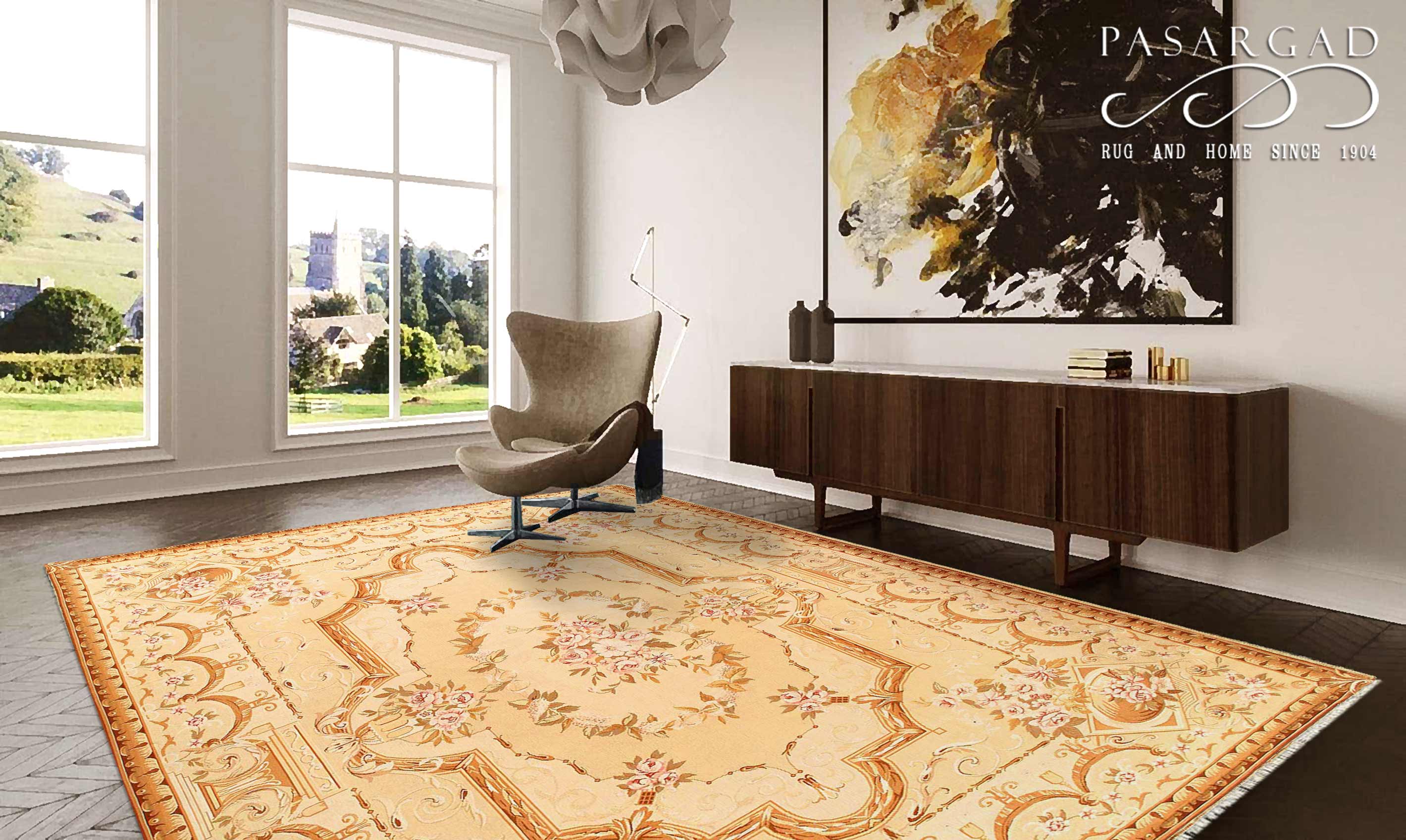 Aubusson rugs get there name from the village of Aubusson France, located on the banks of the Creuse river, just 200 miles from Paris.