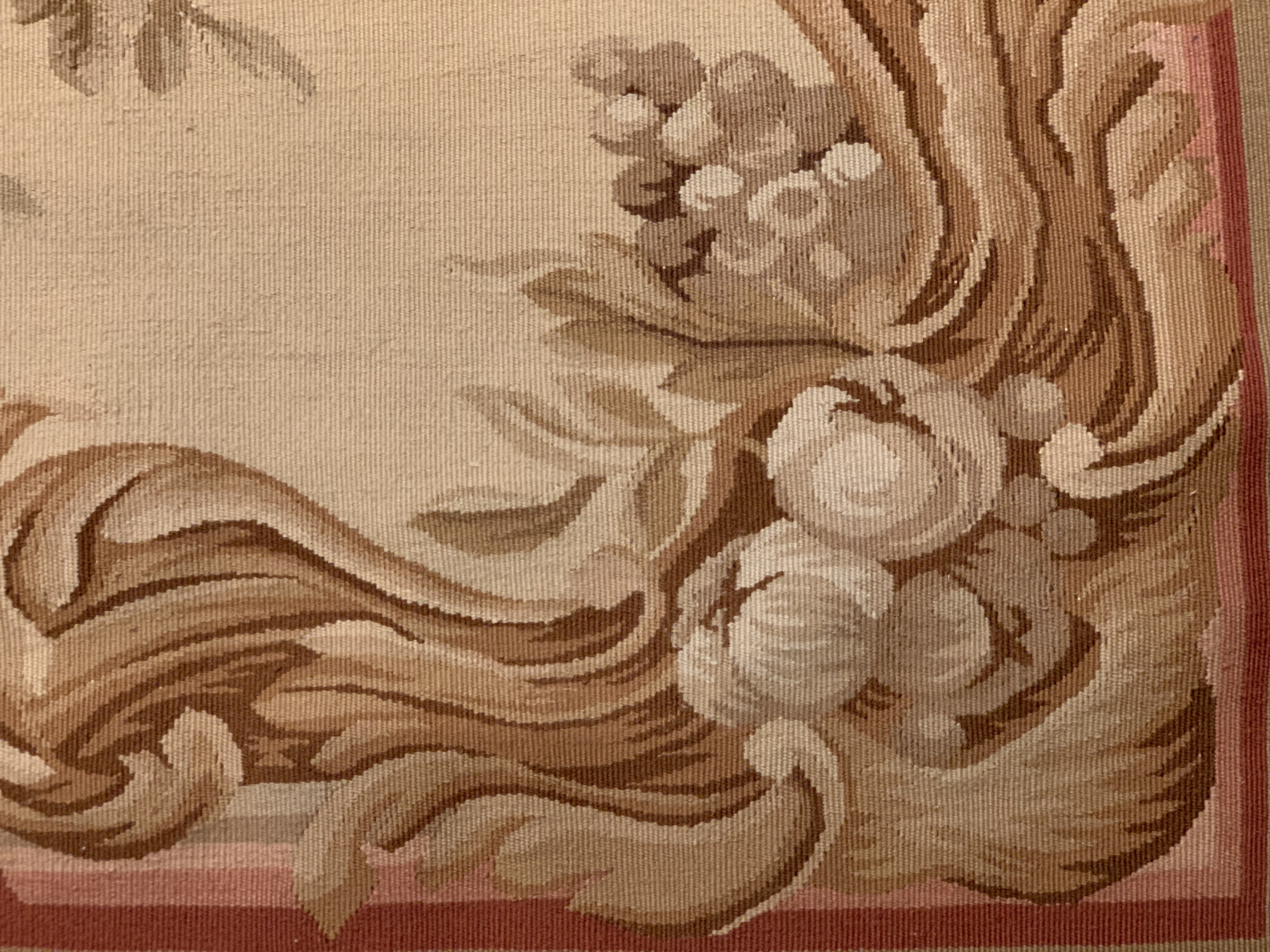 This is a beautiful reproduction Aubusson flat weave rug. Handcrafted using 100% New Zealand wool. It was done exactly as it was centuries ago in France. Use with a thick pad on the floor in any room, or display on a wall. Patterns may vary according to shape and dimension
