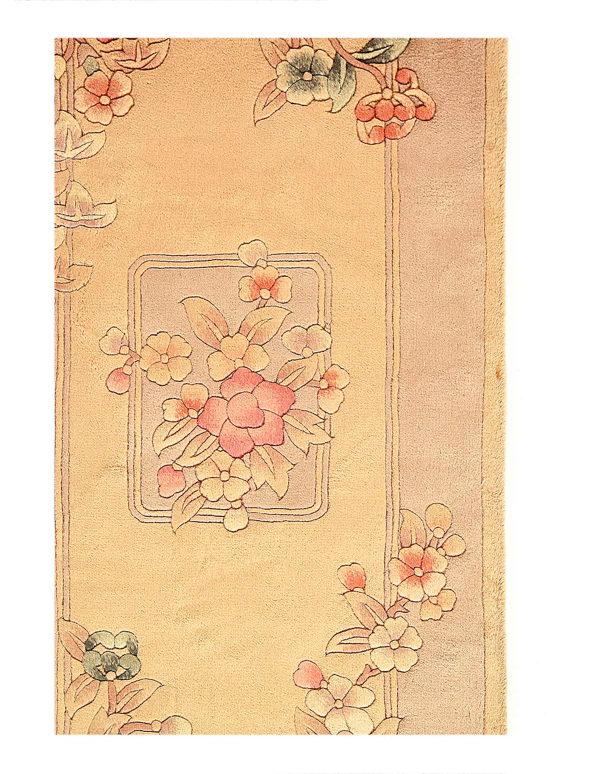 Traditional Chinese rugs and carpets are immediately recognizable by their simple, classic motifs and unusual colors. These rugs often feature a center, circular medallion; familiar objects seen in nature such as animals, flowers, and clouds; stylized Chinese ideographs; and even entire scenes. They're usually framed with a simple, wide border. Chinese rugs are woven with a 5-ply yarn, in contrast with the 2-ply yarns used in Persian rugs and carpets. Many Chinese rugs and carpets are sculpted where contrasting colors meet to provide interest and texture to the simple patterns. These rugs are usually of high quality and extremely durable.