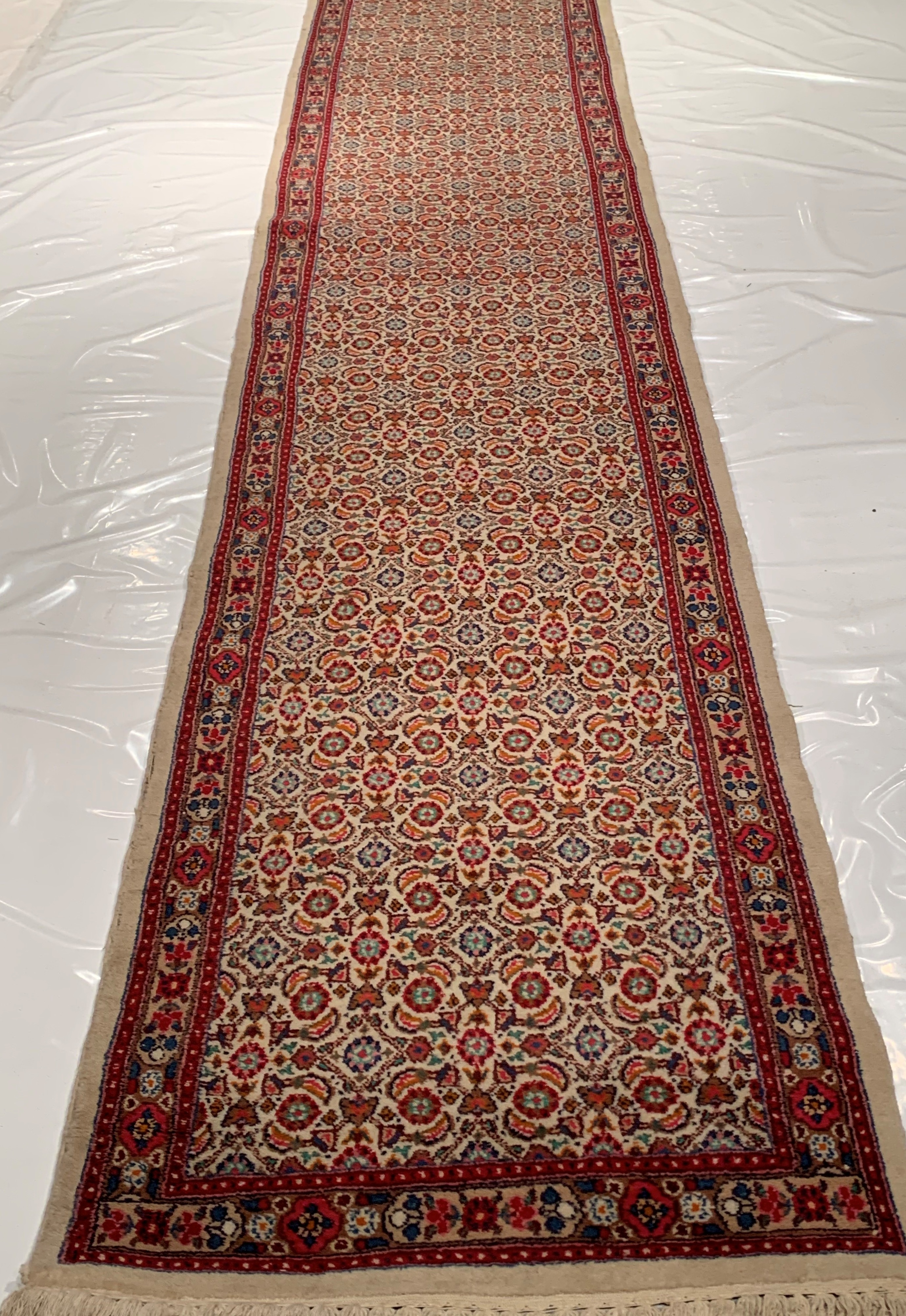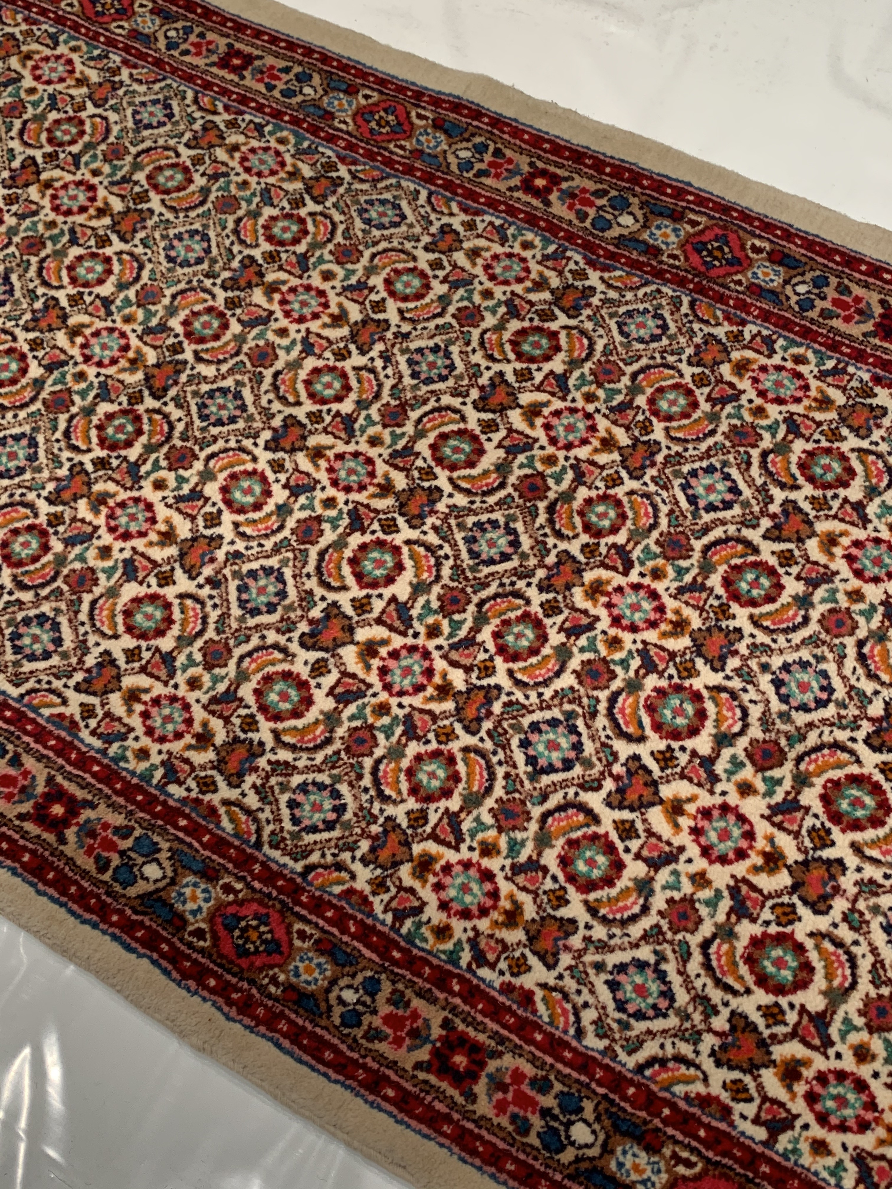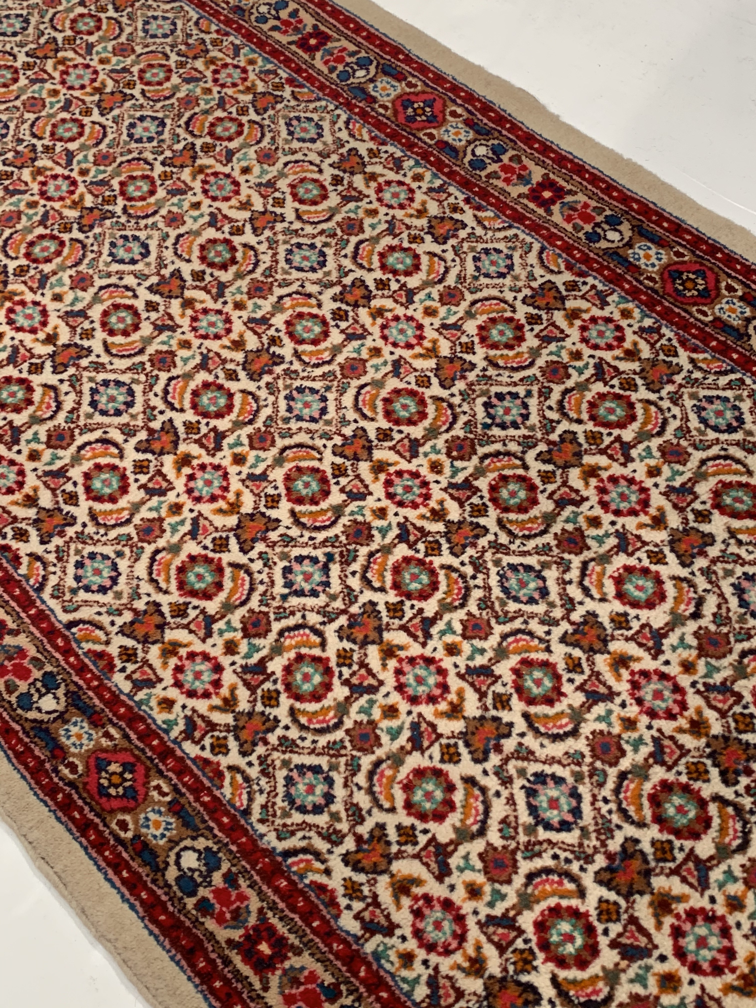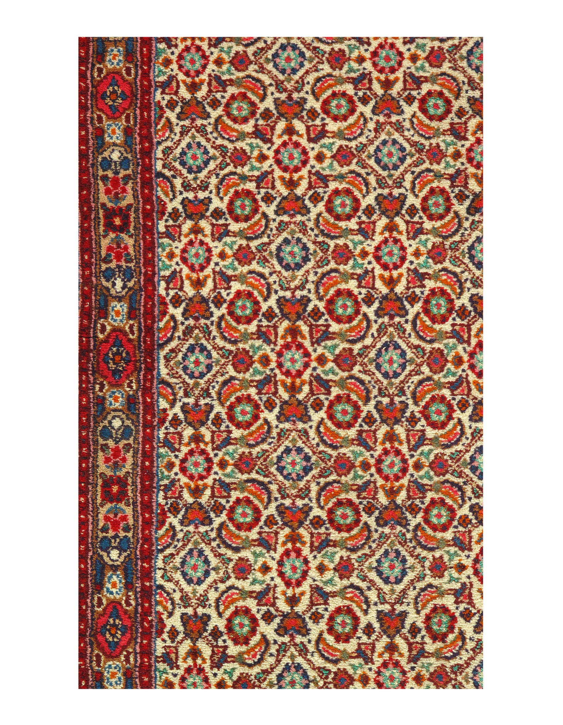 Hand-knotted wool / cotton Persian Moud Mood rug features an all-over design representing the Four Seasons surrounded by a complementary border. Rendered in variegated shades of , beige, cream, red Bring a sophisticated yet cozy formal ambiance to your room with this vintage Persian Mood rug. Hand-knotted wool. Made in Iran (Persia).