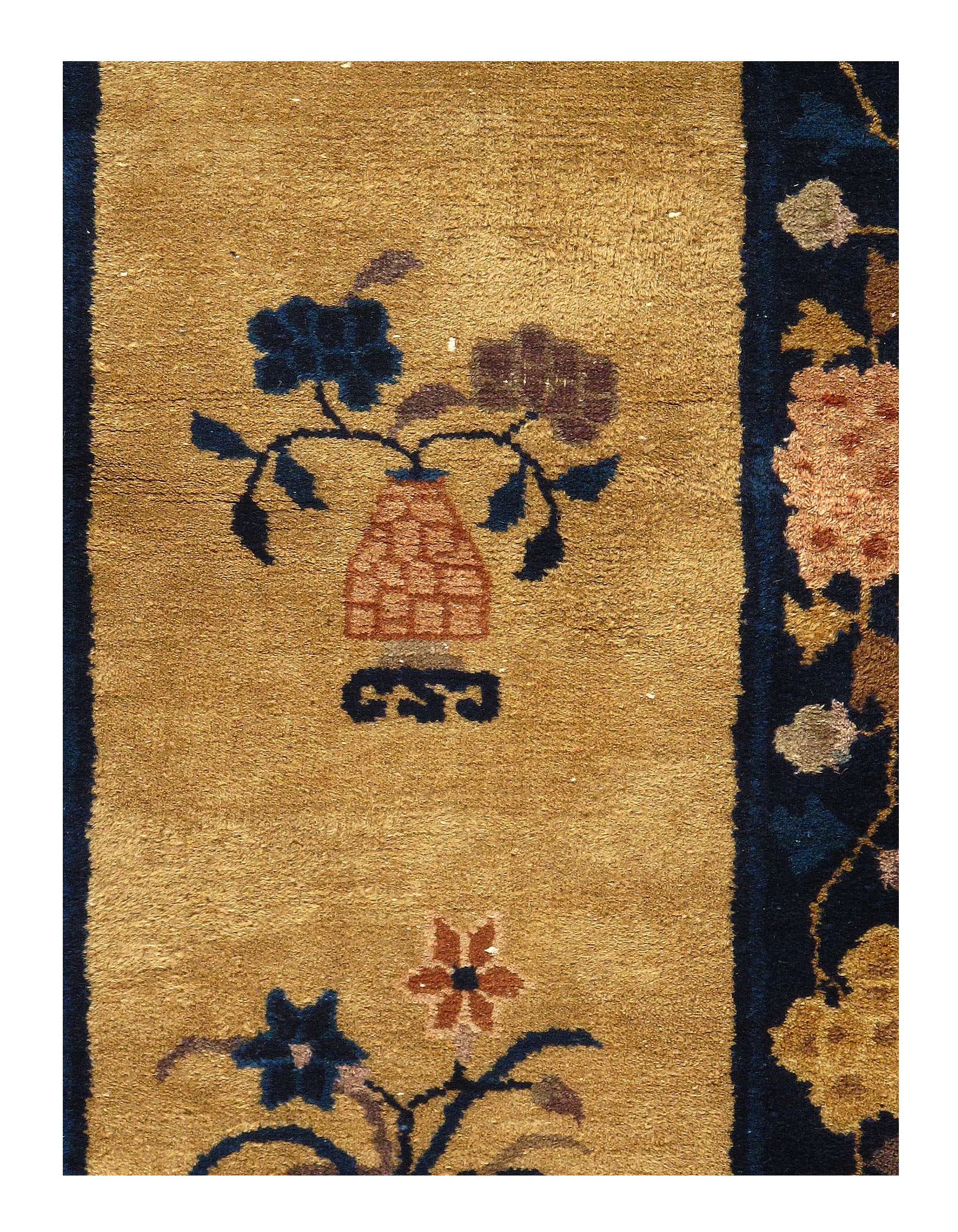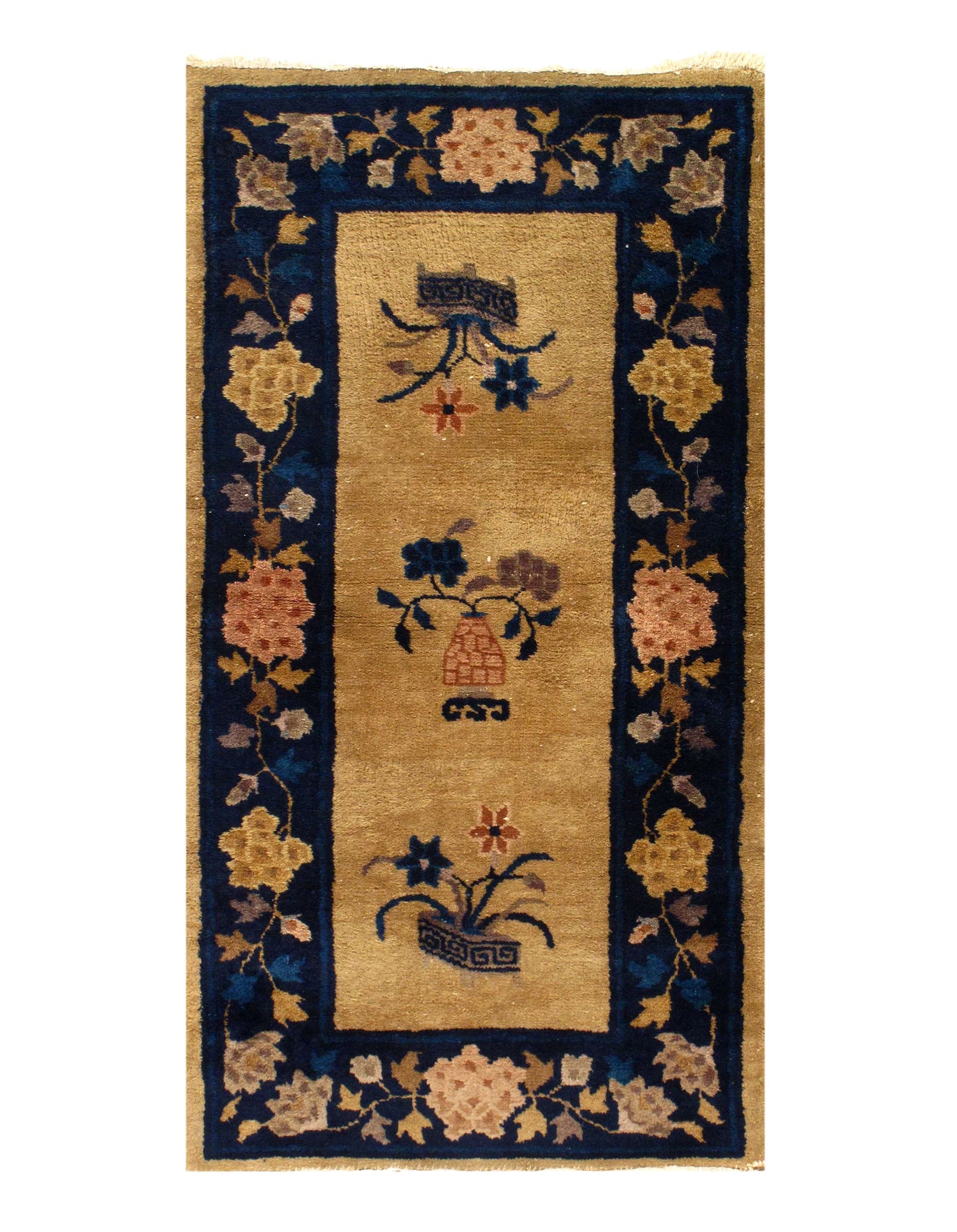 Vintage Chinese Peking, Origin: China, Circa: Early 20th Century – Here is an exciting and appealing antique Oriental carpet – an antique Peking rug that was designed and woven in China during the early years of the twentieth century. Heavily informed by the aesthetic inclinations of the Peking period, this unique carpet is a compelling and thought-provoking example. A scalloped ivory encloses a blue/ sand field on this exquisitely subtle and restrained antique Chinese Peking. At first the field appears empty or open, but it is actually covered by a tone-on-tone design of scrolls and emanating inward from the outer edges. In their sinuous rhythms they echo the scalloped forms of the border and continue its visual effects across the carpet in a more subdued manner. This carpet testifies to the masterful design sensibilities of Chinese weavers as they made the transition into the modern world. The peking movement had an outside influence on the world of art and design, and some of the most important qualities and characteristics of that movement may be found in this fine small rug.