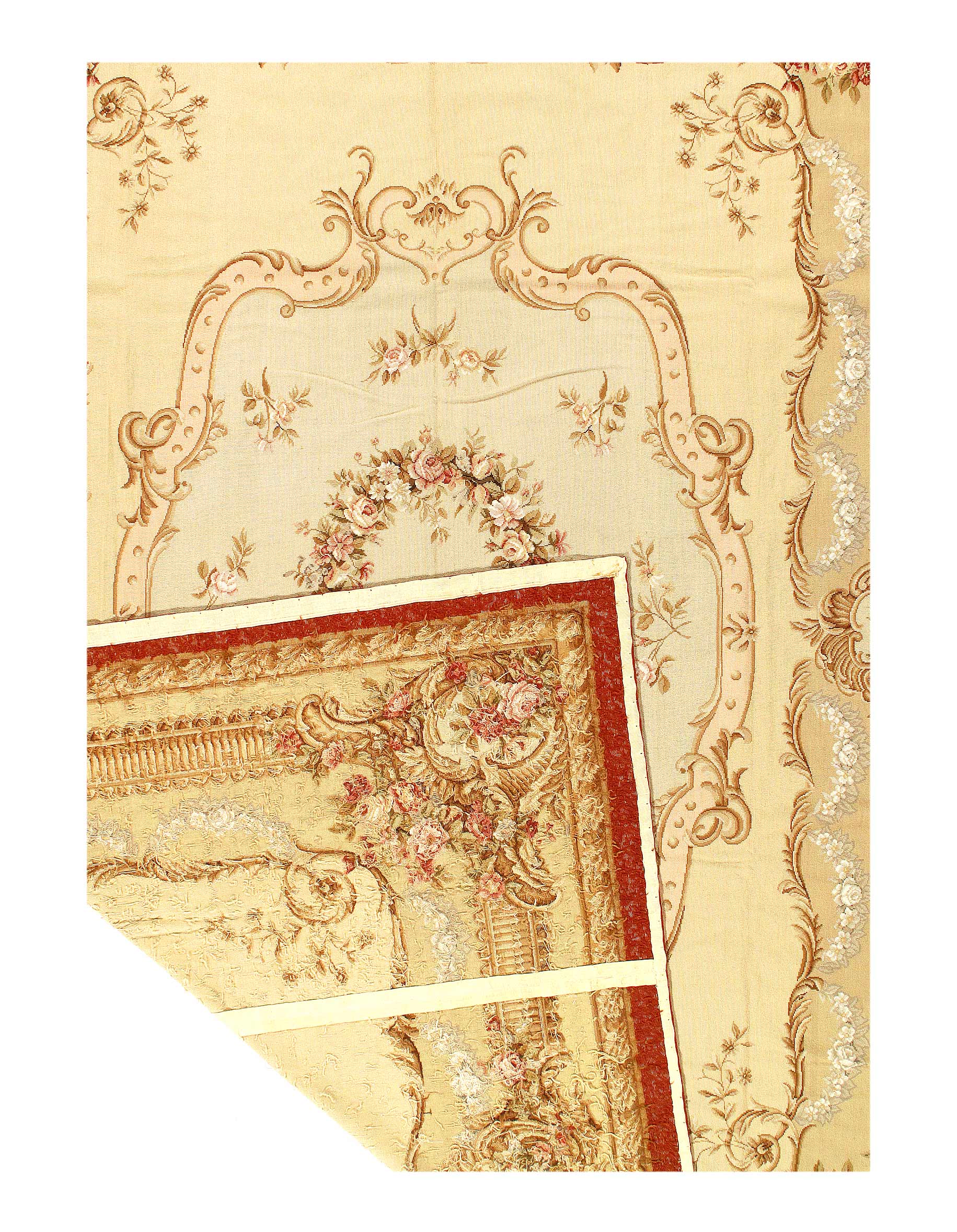 This is a beautiful reproduction Aubusson flat weave rug. Handcrafted using 100% New Zealand wool. It was done exactly as it was centuries ago in France. Use with a thick pad on the floor in any room, or display on a wall. Patterns may vary according to shape and dimension