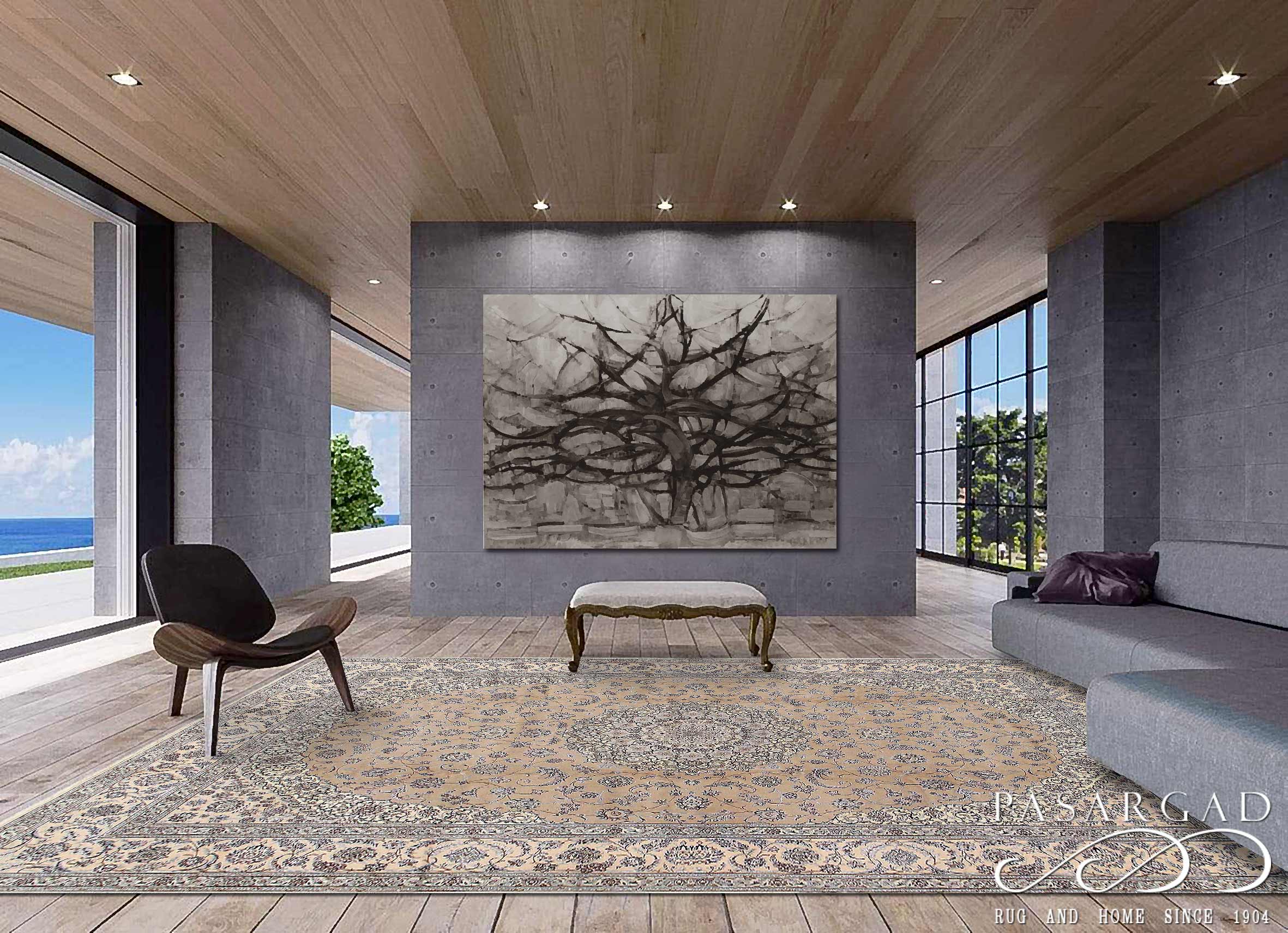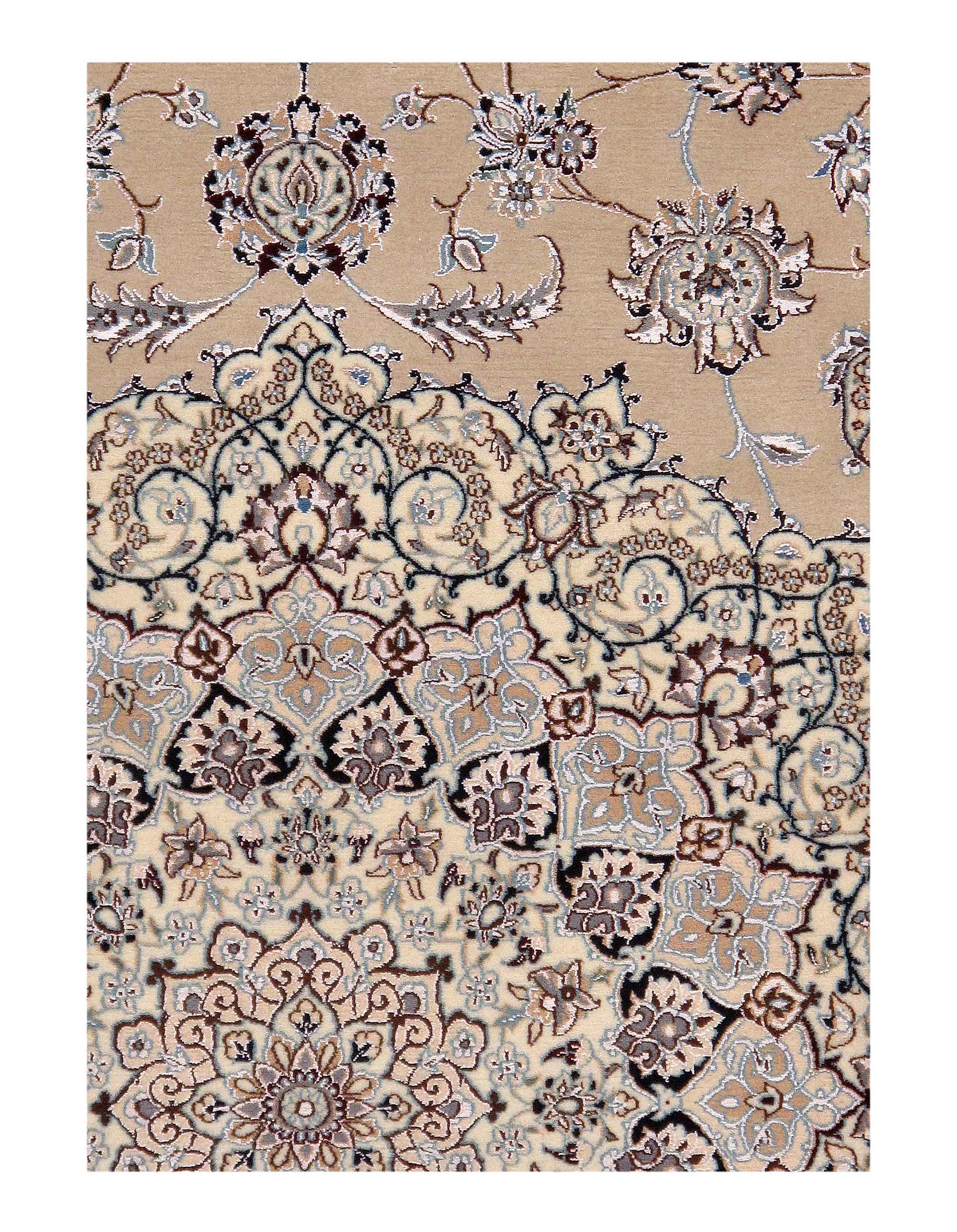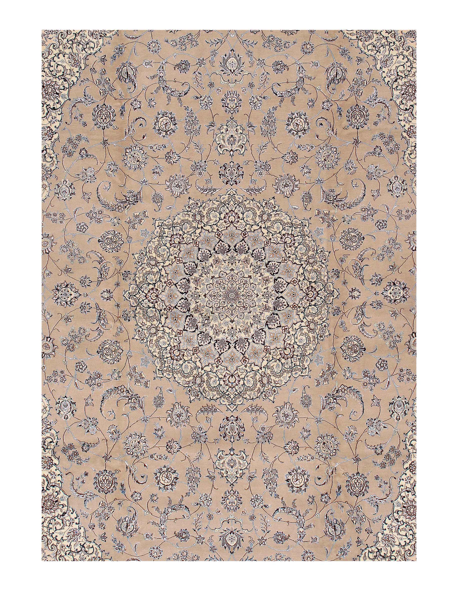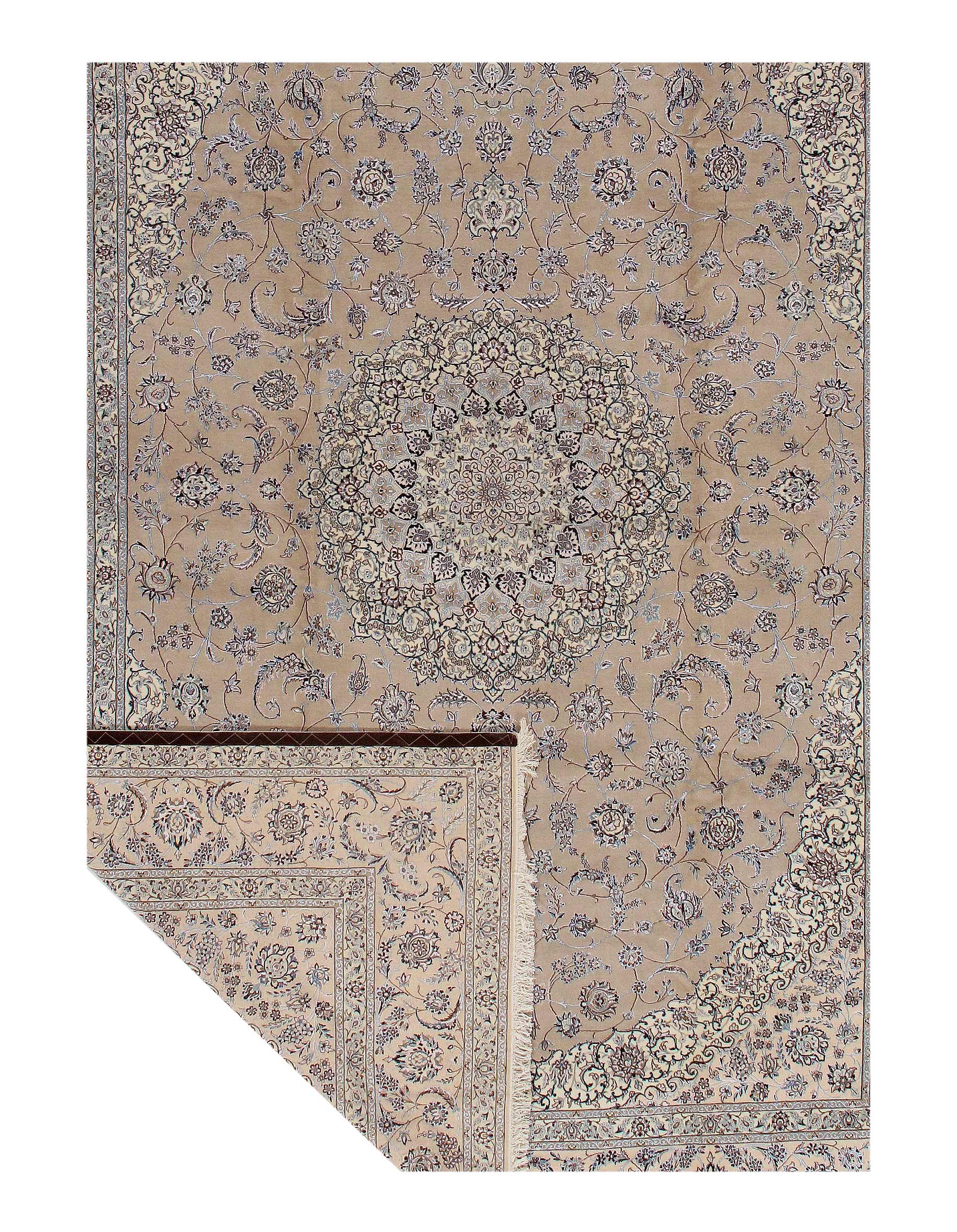 All Nain rugs are knotted by hand using asymmetrical Persian knots and wool pile on a cotton warp. The rugs are then clipped closely so that the design stands out more sharply in focus.
