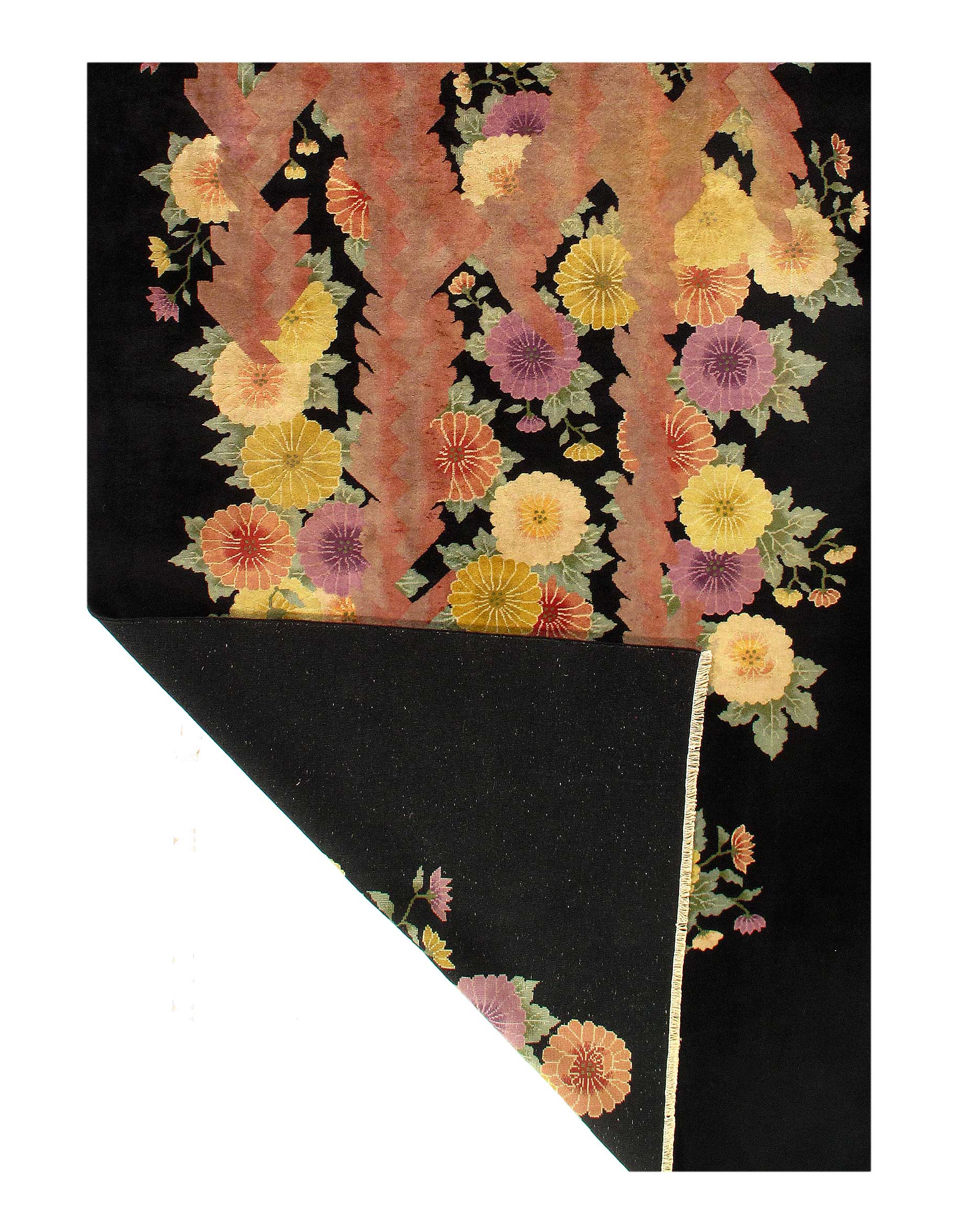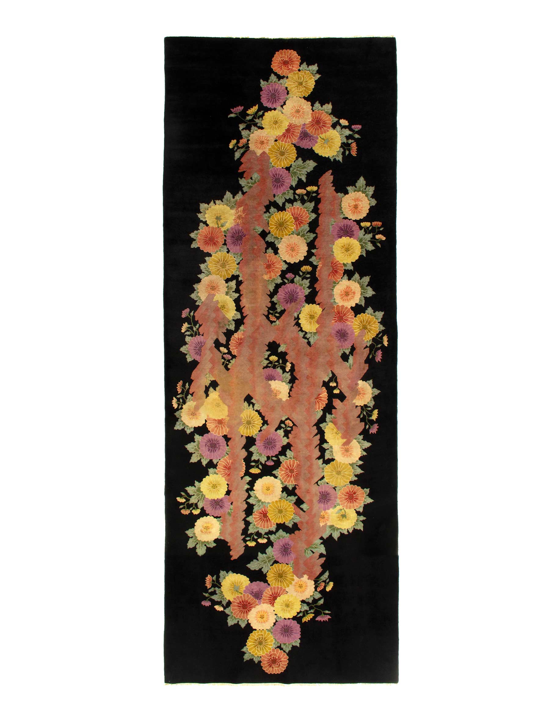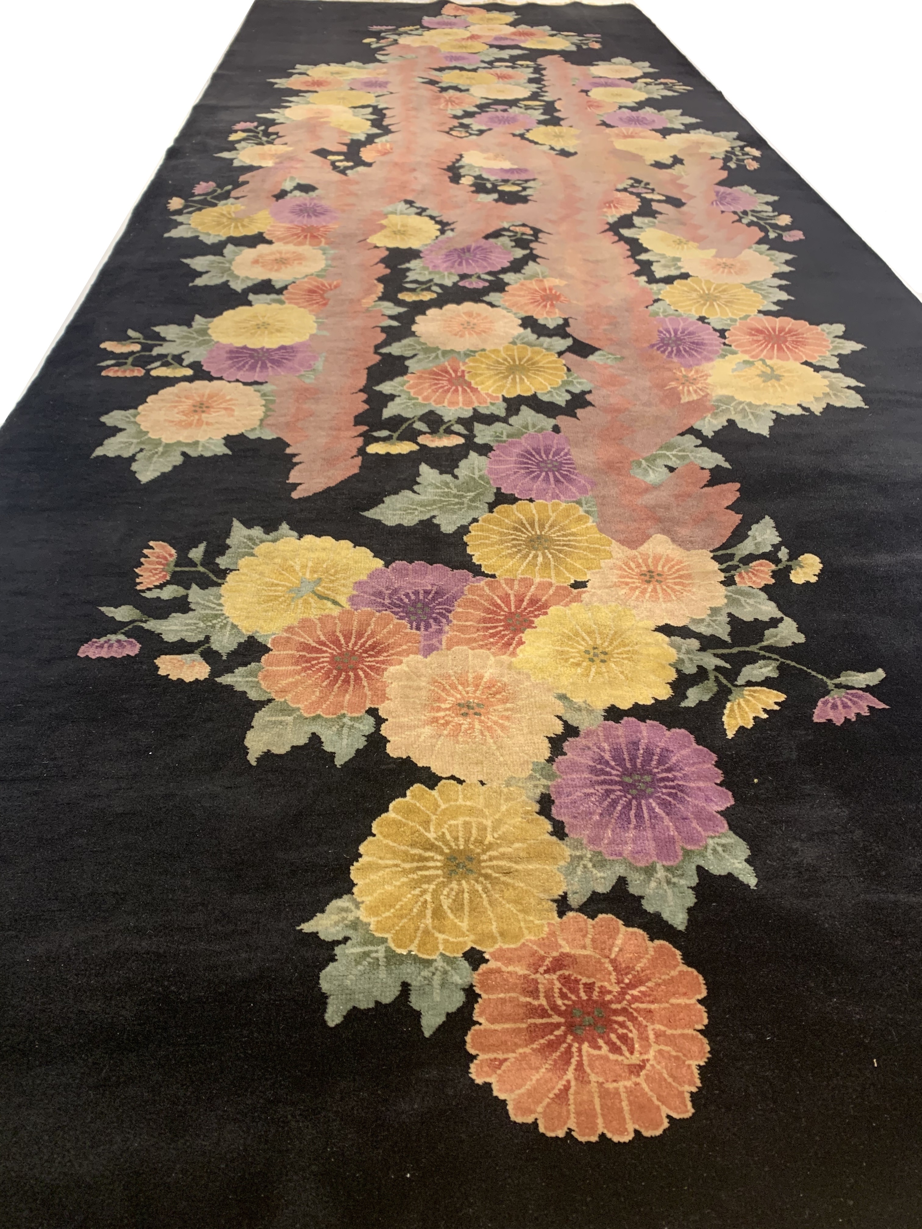 Antique Chinese Deco Rug, Origin: China, Circa: Early 20th Century – Here is an exciting and appealing antique Oriental carpet – an antique Art Deco rug that was designed and woven in China during the early years of the twentieth century. Heavily informed by the aesthetic inclinations of the Art Deco period, this unique carpet is a compelling and thought-provoking example. A scalloped Purple encloses a black sand field on this exquisitely subtle and restrained antique Chinese Art Deco. At first the field appears empty or open, but it is actually covered by a tone-on-tone design of scrolls and cloud-bands emanating inward from the outer edges. In their sinuous rhythms they echo the scalloped forms of the border and continue its visual effects across the carpet in a more subdued manner. This carpet testifies to the masterful design sensibilities of Chinese weavers as they made the transition into the modern world. The Art Deco movement had an outside influence on the world of art and design, and some of the most important qualities and characteristics of that movement may be found in this fine runner .