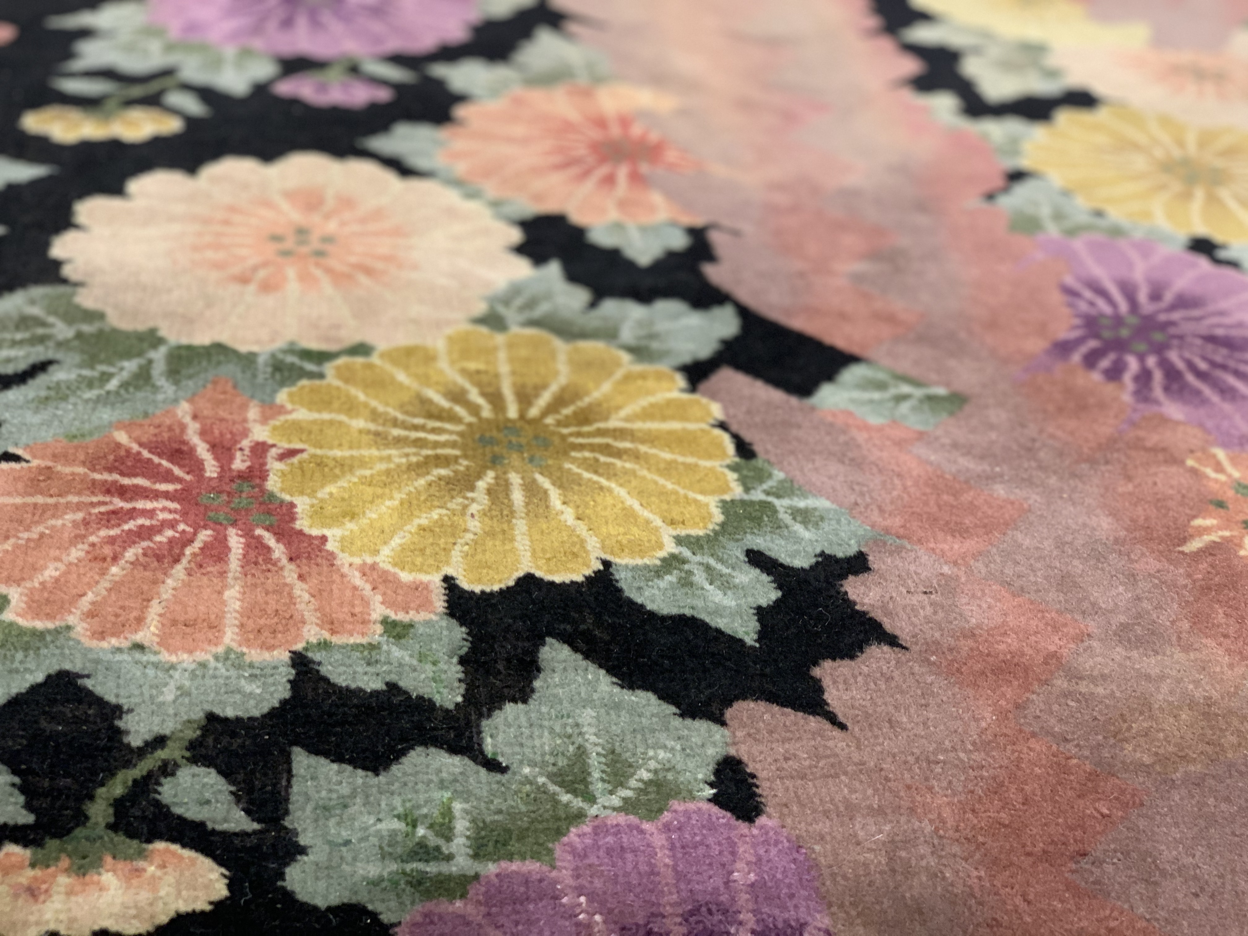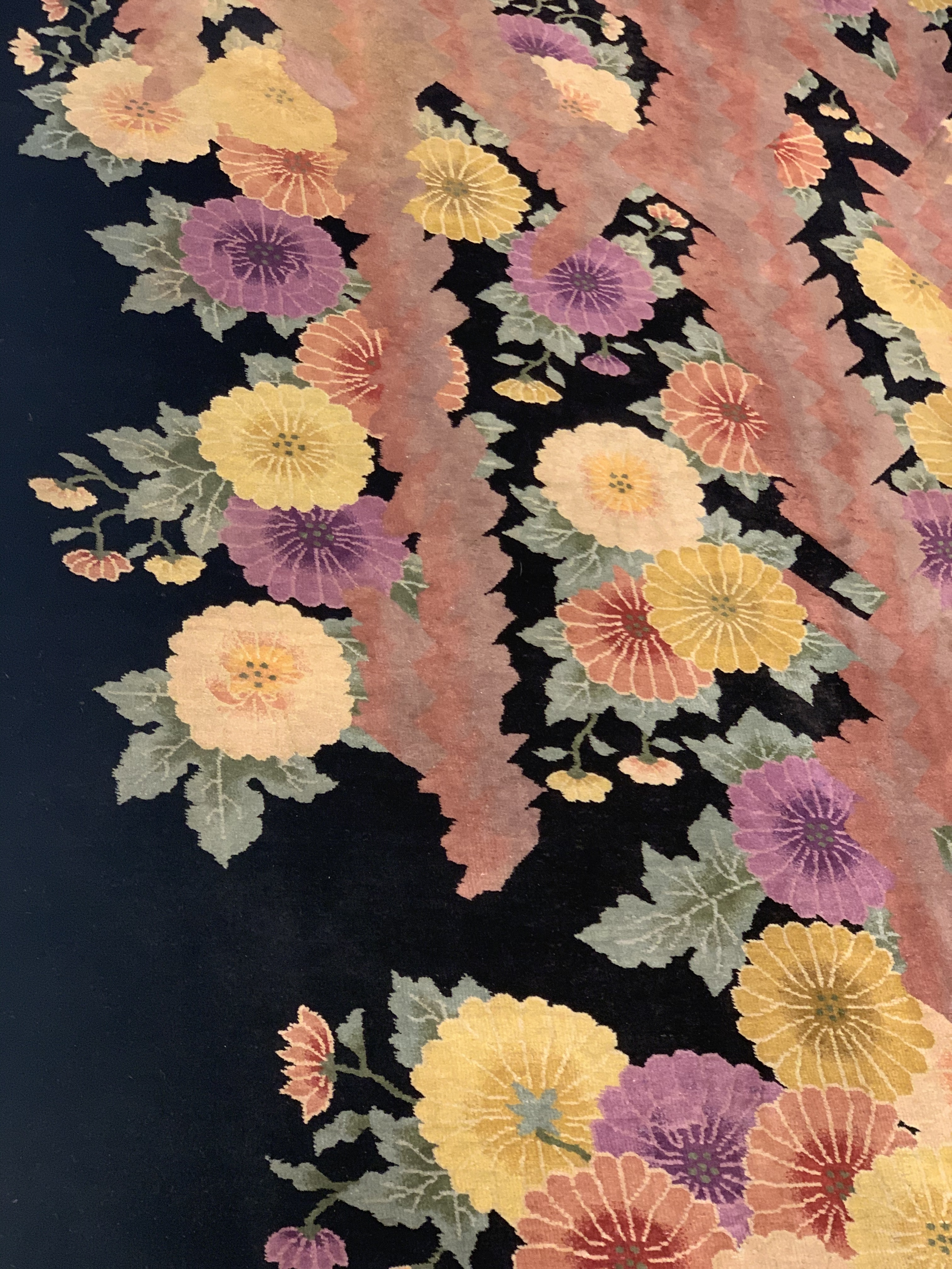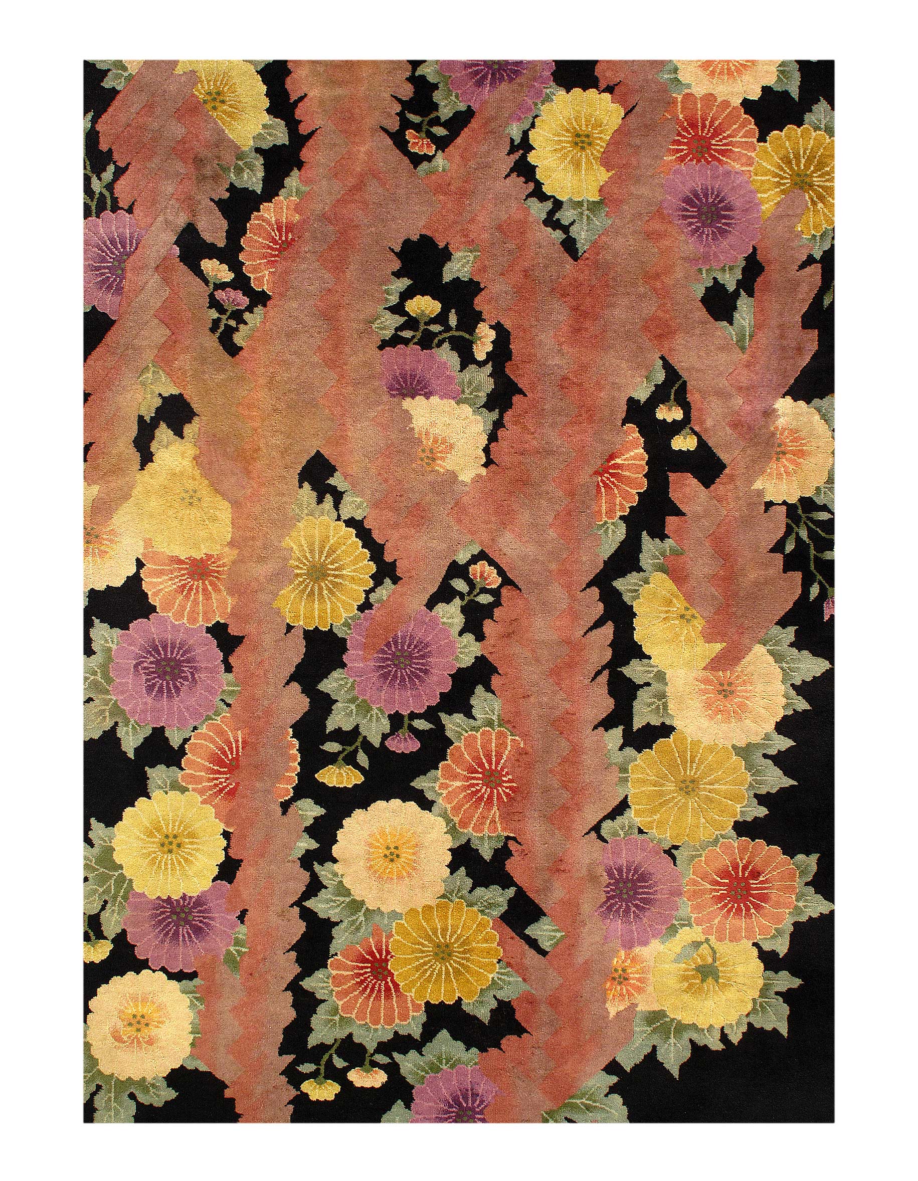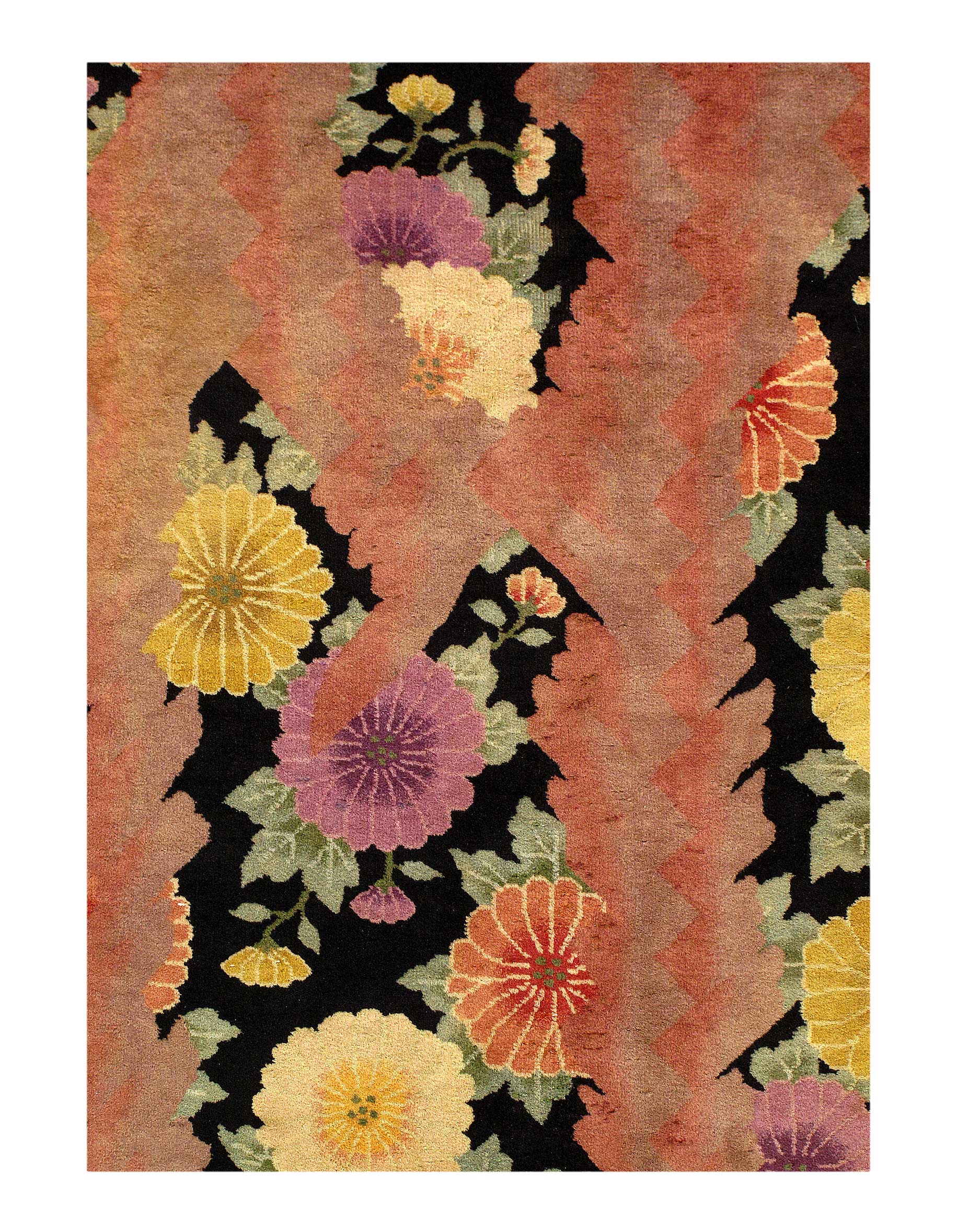 Antique Chinese Deco Rug, Origin: China, Circa: Early 20th Century – Here is an exciting and appealing antique Oriental carpet – an antique Art Deco rug that was designed and woven in China during the early years of the twentieth century. Heavily informed by the aesthetic inclinations of the Art Deco period, this unique carpet is a compelling and thought-provoking example. A scalloped Purple encloses a black sand field on this exquisitely subtle and restrained antique Chinese Art Deco. At first the field appears empty or open, but it is actually covered by a tone-on-tone design of scrolls and cloud-bands emanating inward from the outer edges. In their sinuous rhythms they echo the scalloped forms of the border and continue its visual effects across the carpet in a more subdued manner. This carpet testifies to the masterful design sensibilities of Chinese weavers as they made the transition into the modern world. The Art Deco movement had an outside influence on the world of art and design, and some of the most important qualities and characteristics of that movement may be found in this fine runner .