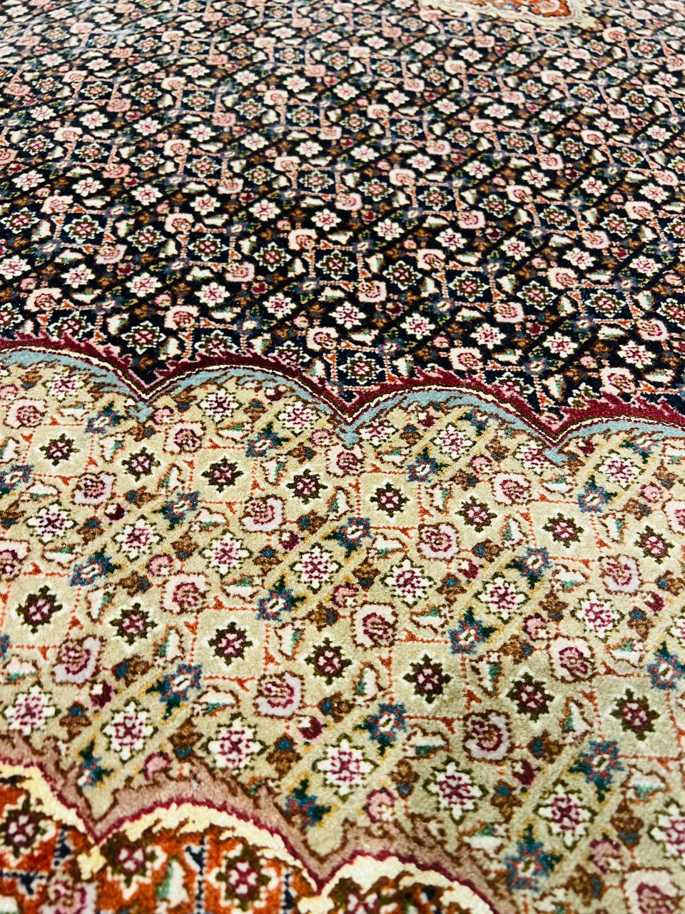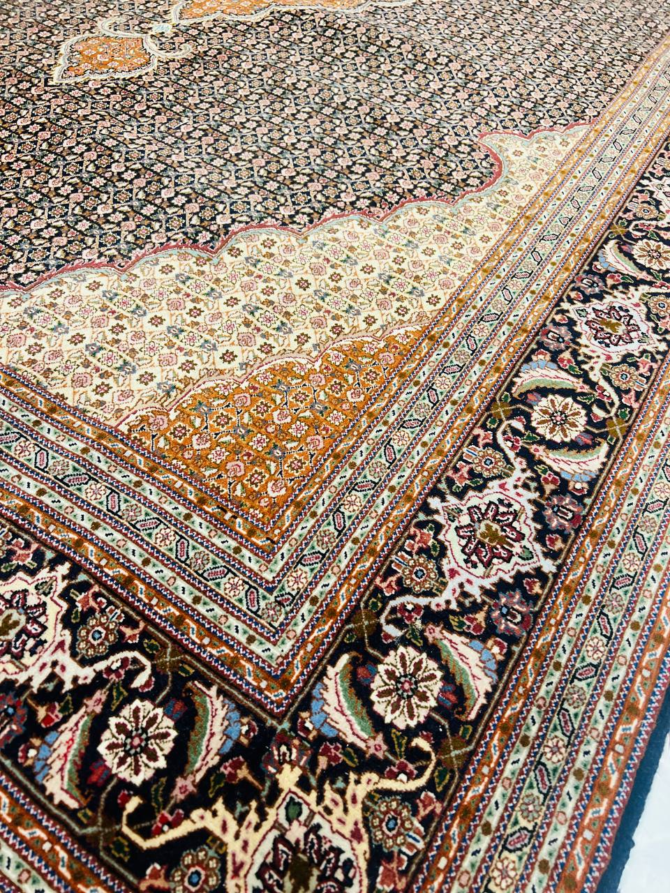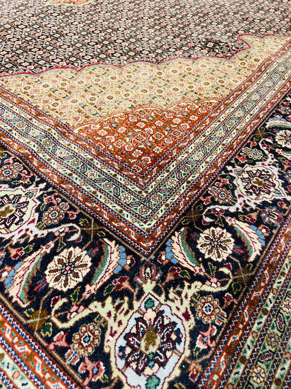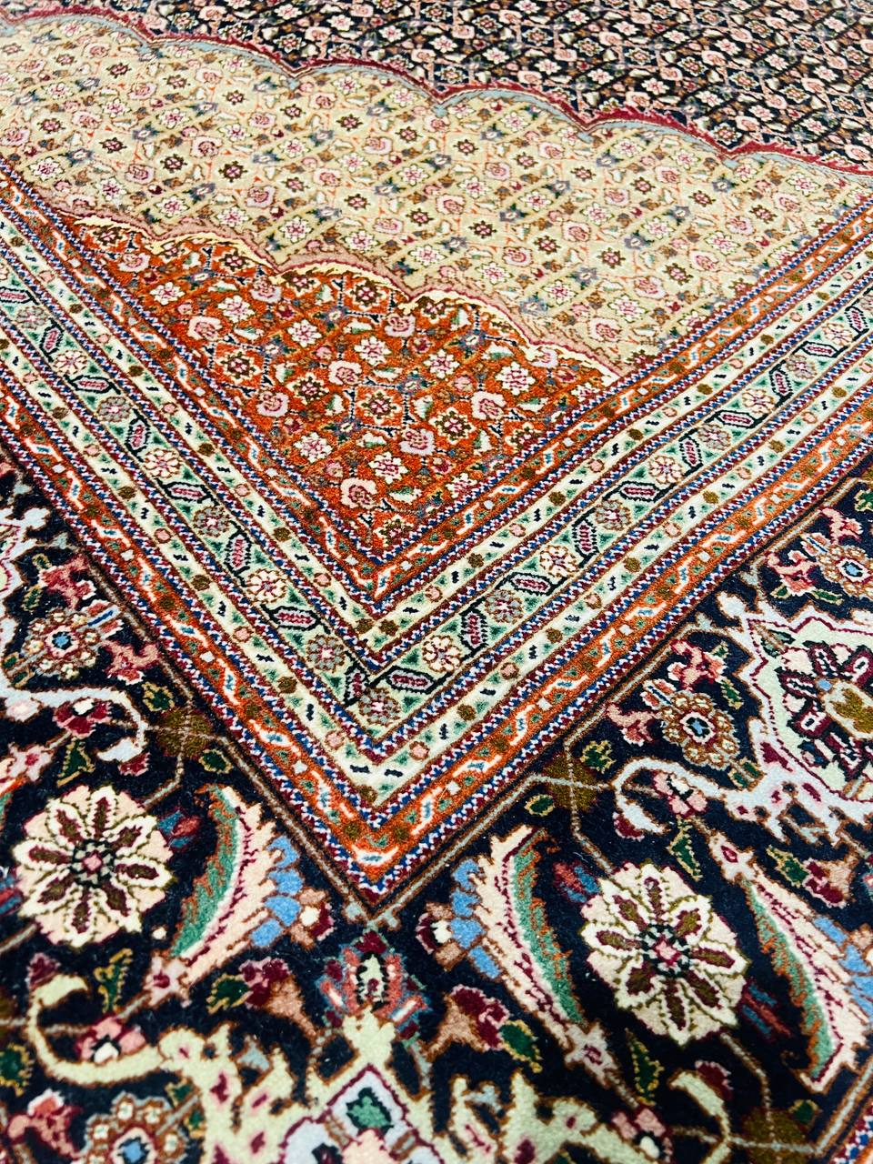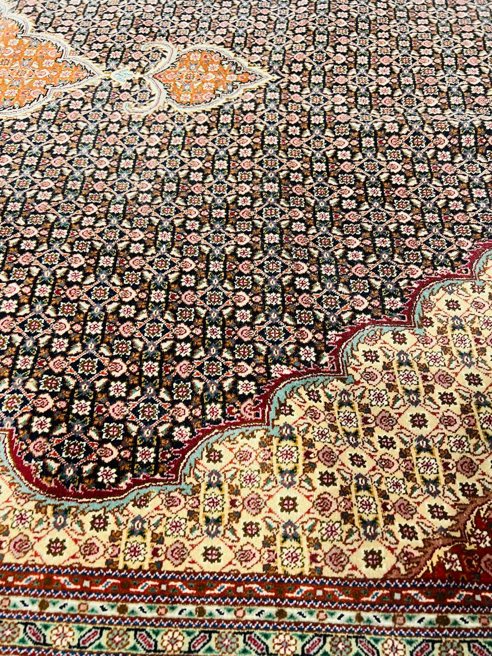 Amongst the most classic and popular pattern in Tabriz rugs is the Mahi design, which is also known as the Fish design. The Tabriz Mahi rugs are very common and are typically found in most Persian rug stores. In fact, this design is so popular that it is also very common to find it in imitation rugs from China and India. Most Mahi pieces are standard sized Tabriz rugs with a large center medallion and the main colors are typically Black, , and 4 shades of Red ,Brown,Black,Beige....