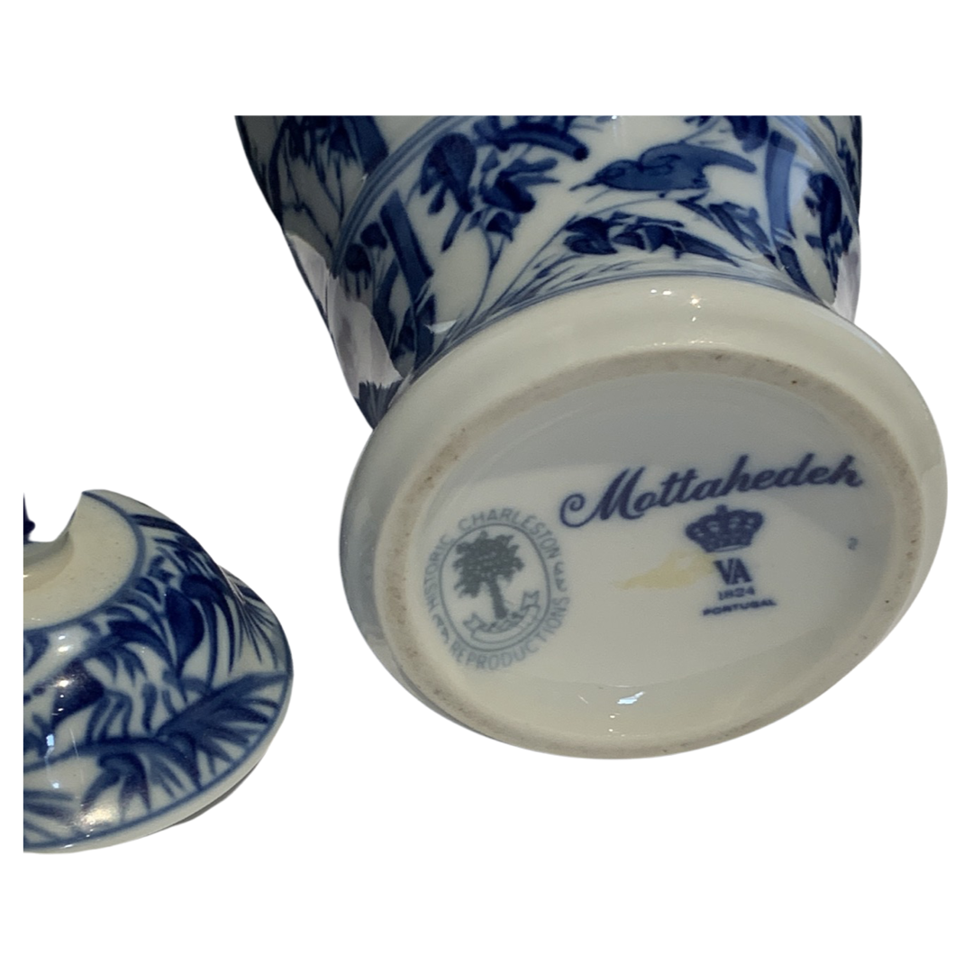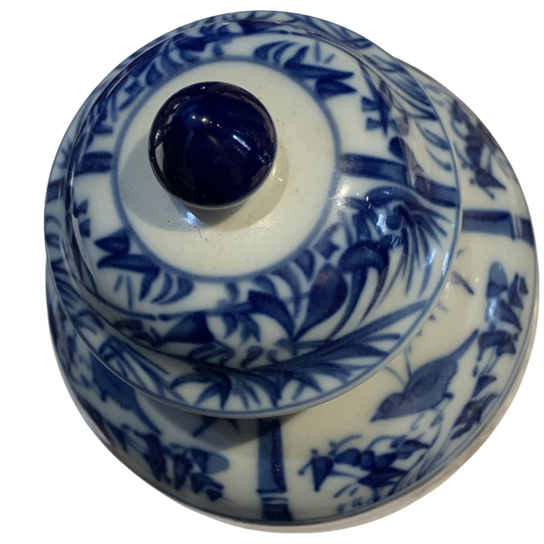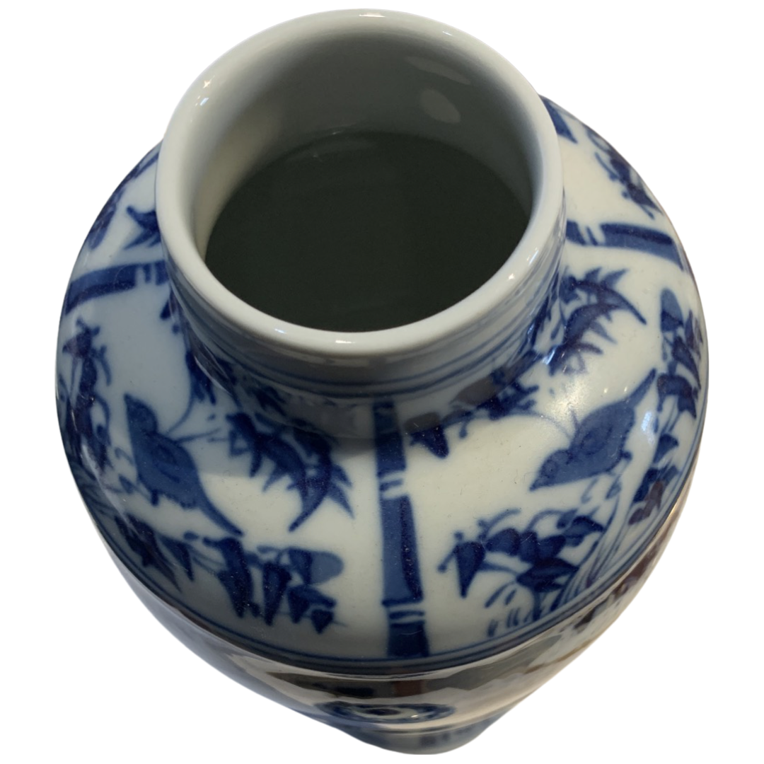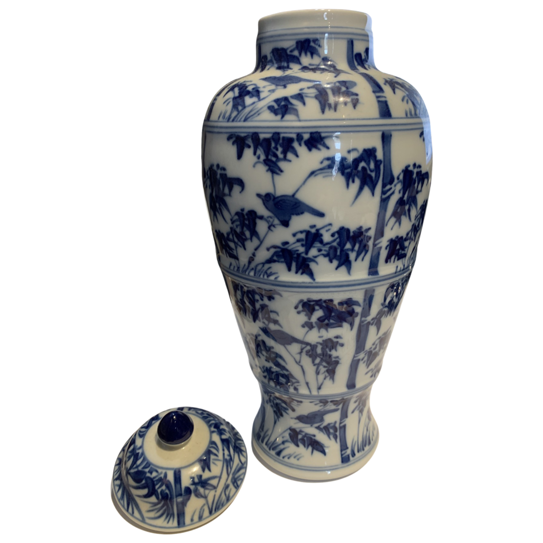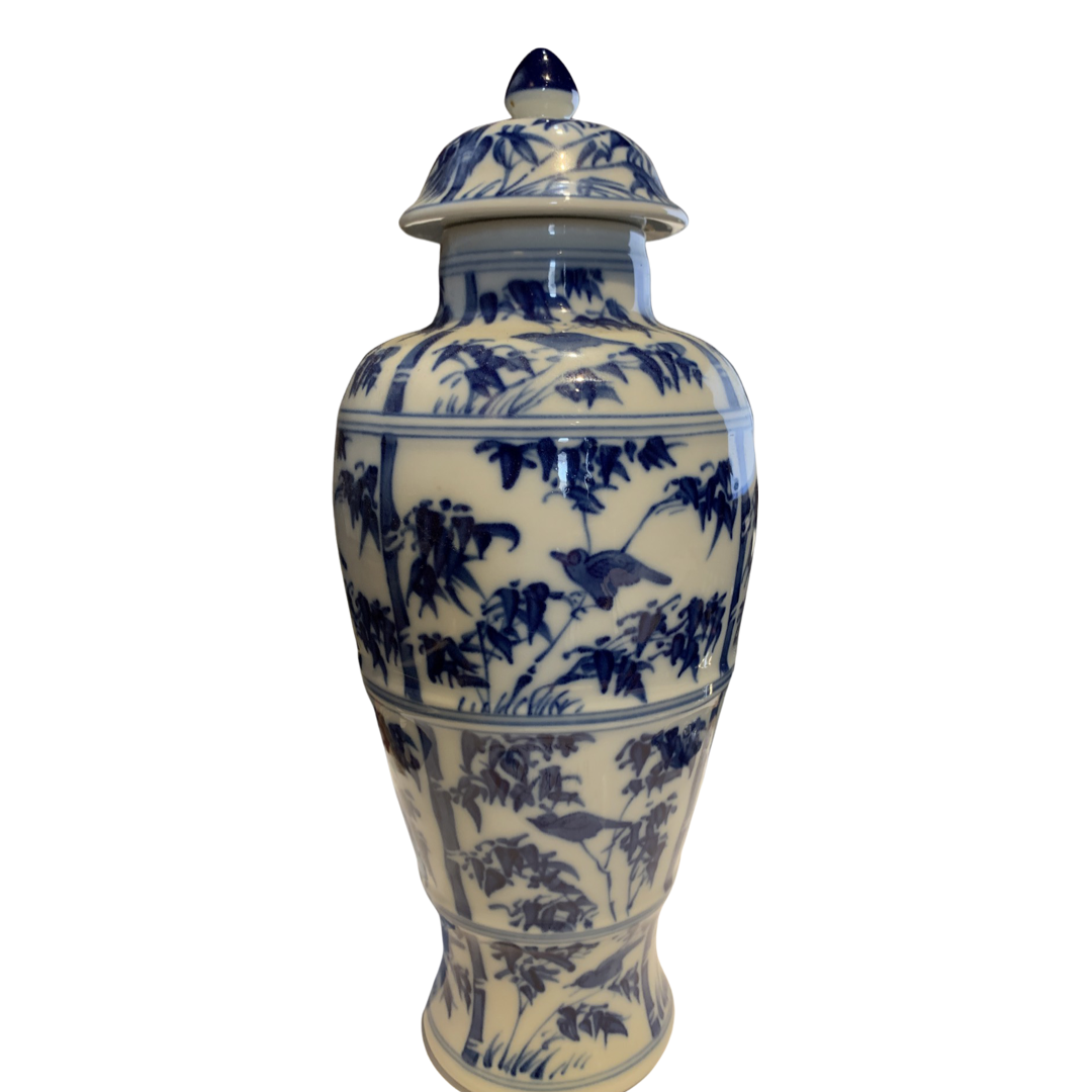 This blue and white porcelain jar is adorned with hand painted beautiful flowers and lovely flying birds.