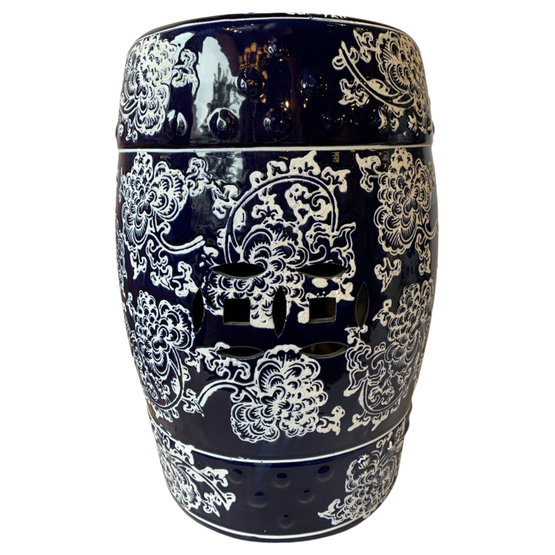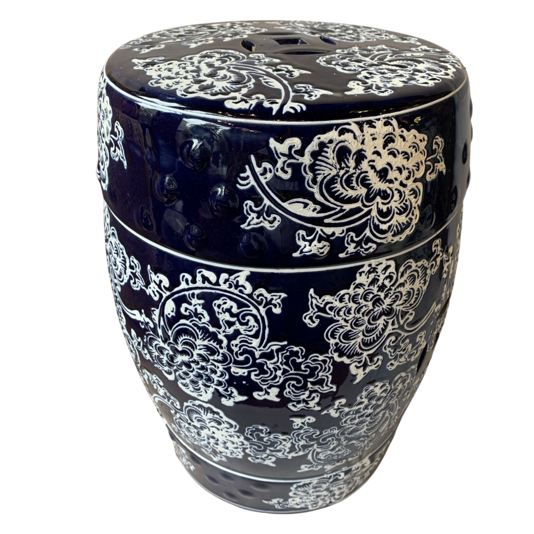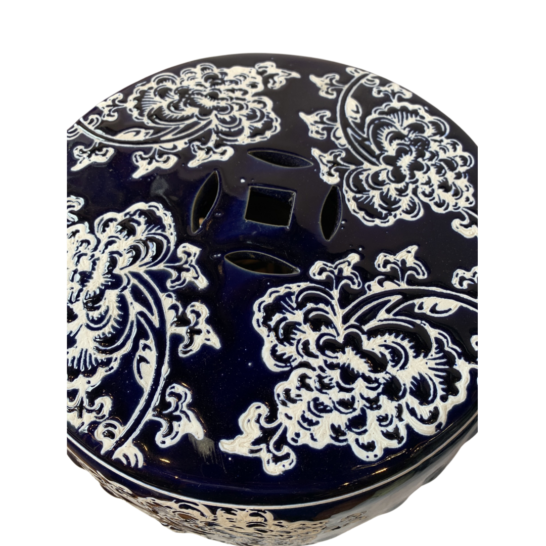 A deep blue wash is cut with white streaks across a hexagonal base. Floral leaf designs are etched through the white paint, twisting and turning outward against the shaded blue. Butterflies can be seen randomly floating across the face of this stool, each a slightly off-color shade of blue and white, beautifully contrasted against the underlying patterns. This modern Asian coin Garden Stool is entirely handmade and hand painted, featuring coin carvings set into the sides and top of the piece.