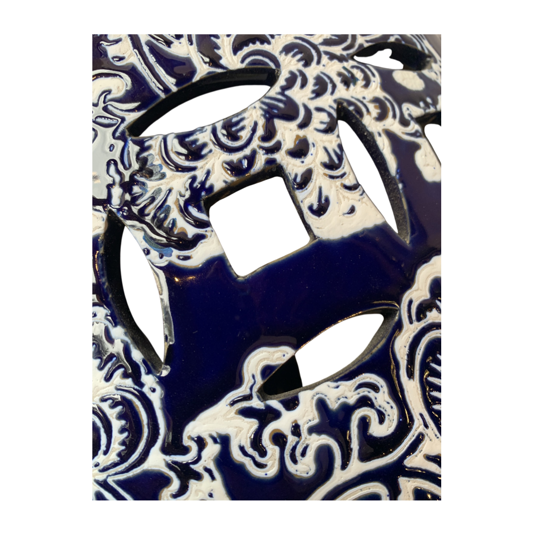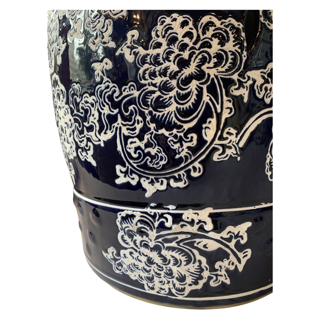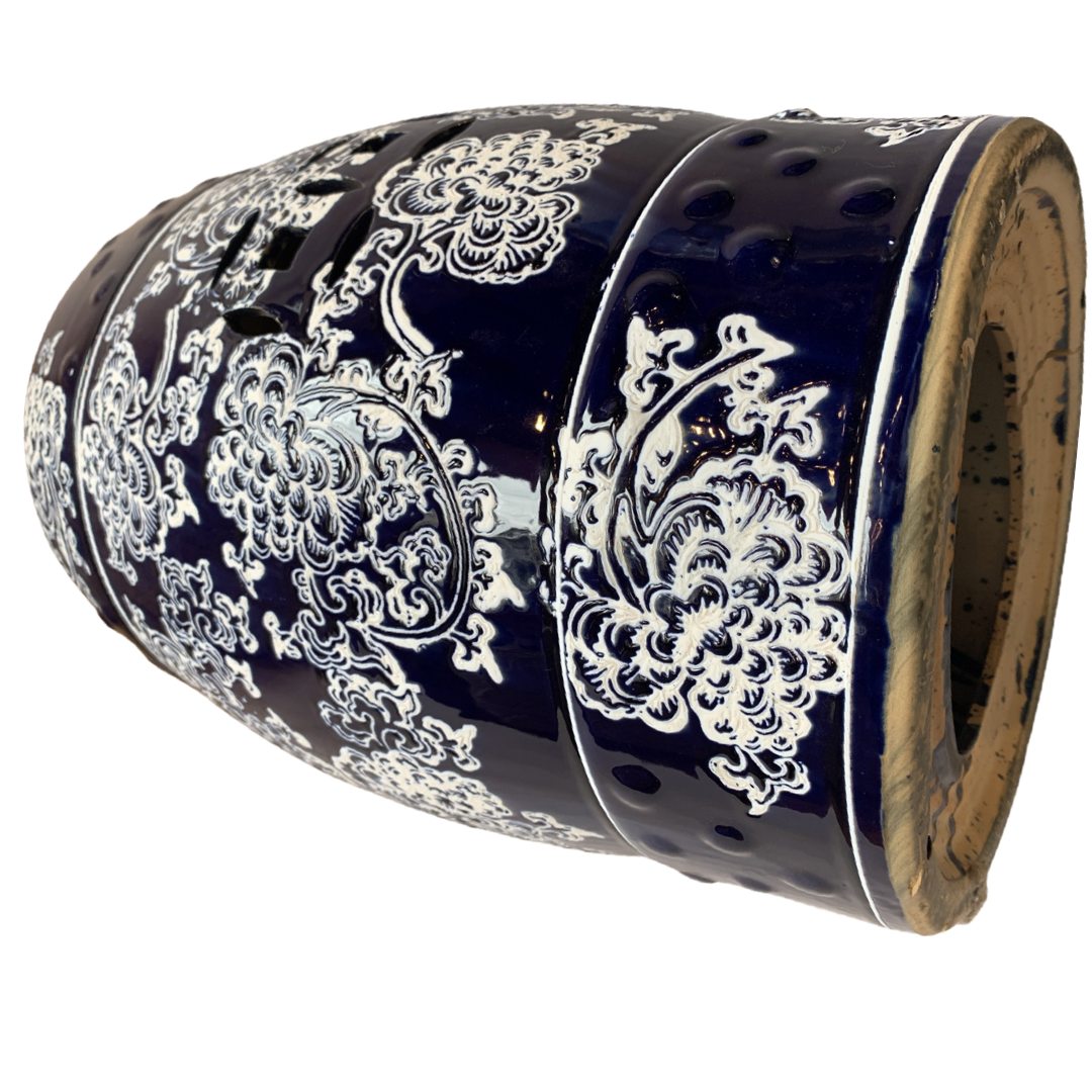A deep blue wash is cut with white streaks across a hexagonal base. Floral leaf designs are etched through the white paint, twisting and turning outward against the shaded blue. Butterflies can be seen randomly floating across the face of this stool, each a slightly off-color shade of blue and white, beautifully contrasted against the underlying patterns. This modern Asian coin Garden Stool is entirely handmade and hand painted, featuring coin carvings set into the sides and top of the piece.