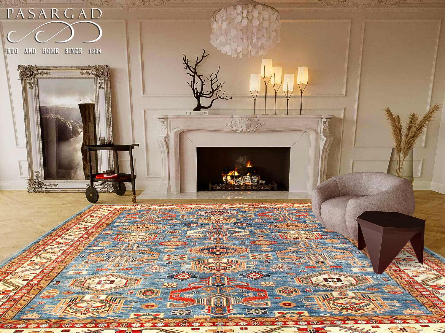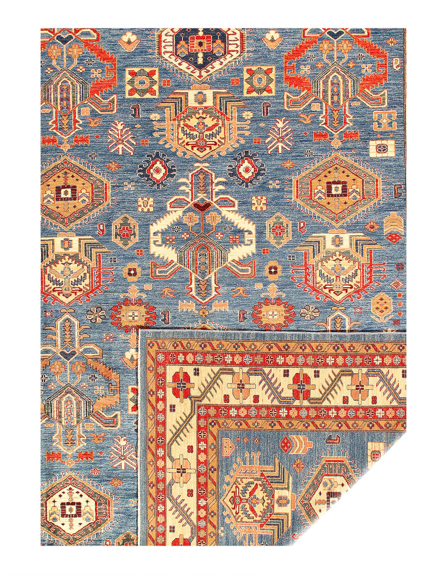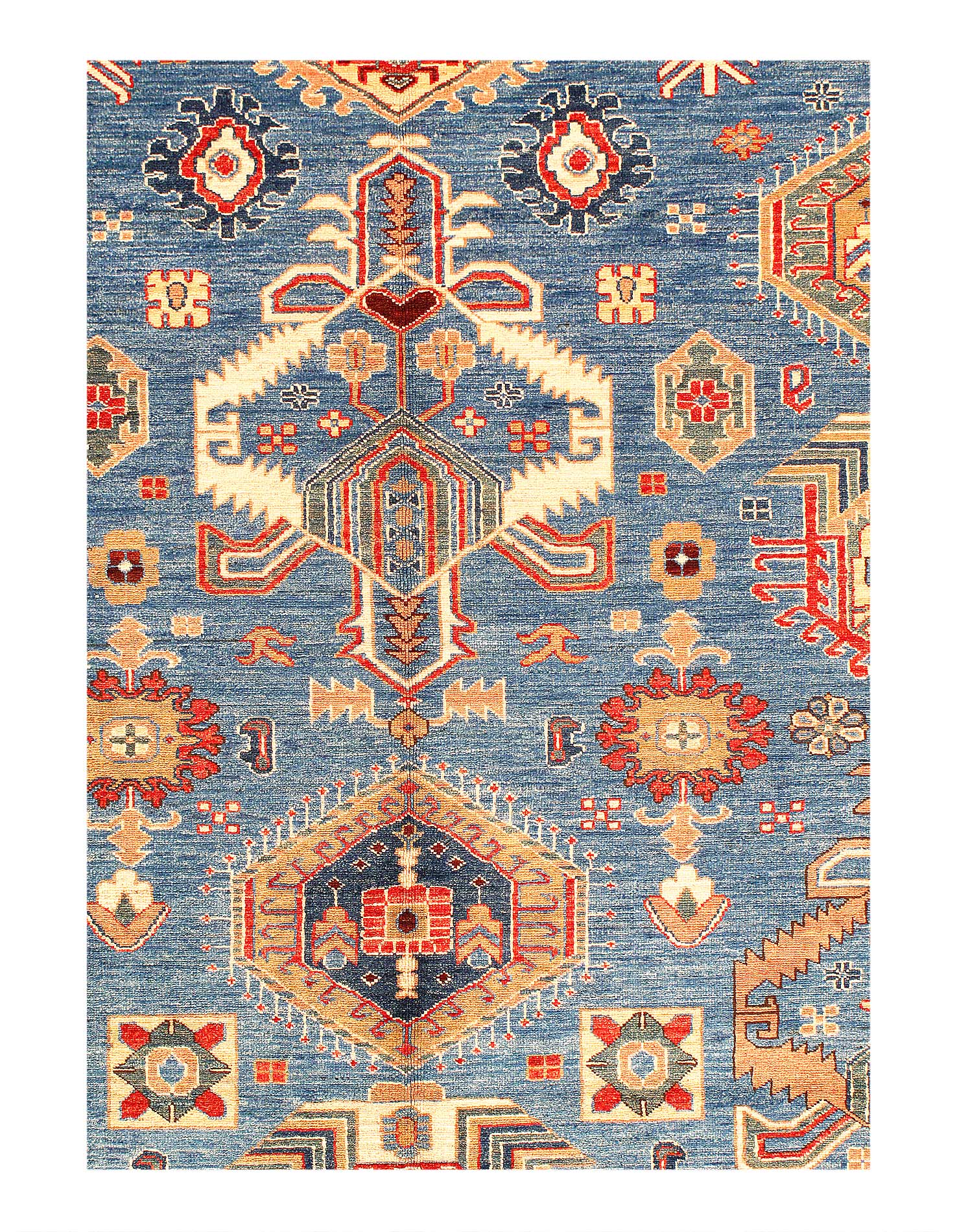Kazak is a modern shape of old Caucasian rugs which strictly adheres to traditional design elements of the Caucasus. It has elements such as the stepped hooked polygons, geometrical medallions and rosettes, presented in more stylized manner and with a new dimension. Natural dyes produce soft luminous shades and abrashes causing a beautiful sheen. Handspun wool yarn is normally used in the variety of vibrant warm colors. Kazaks rugs in our collection are all fine quality pieces from Pakistan made with Ghazni handspun wool and natural dyes.