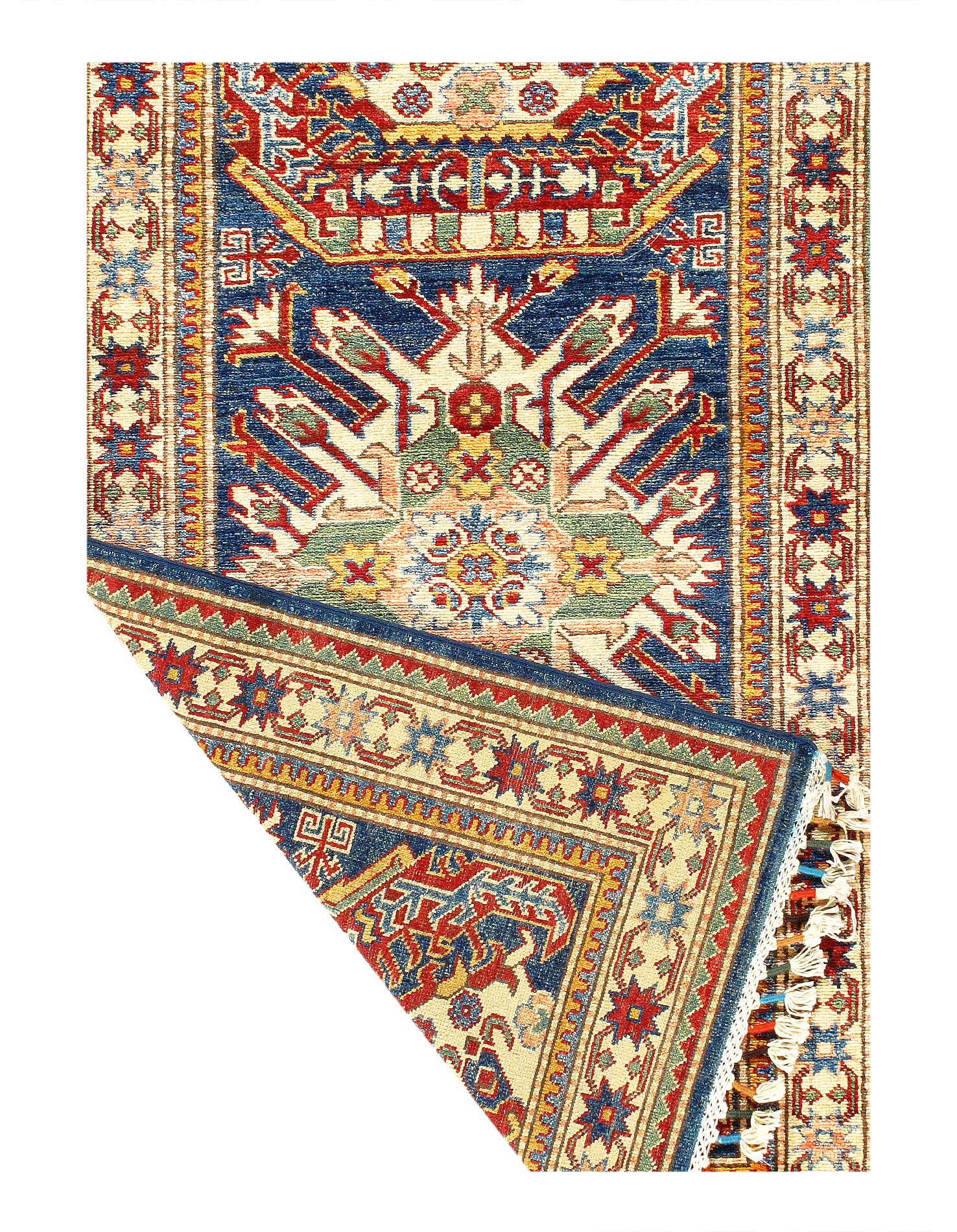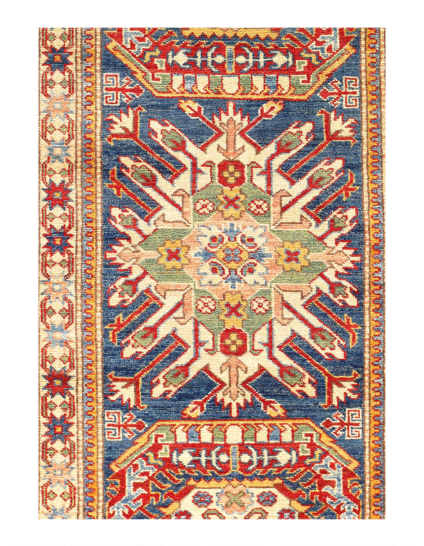 Kazak is a modern shape of old Caucasian rugs which strictly adheres to traditional design elements of the Caucasus. It has elements such as the stepped hooked polygons, geometrical medallions and rosettes, presented in more stylized manner and with a new dimension. Natural dyes produce soft luminous shades and abrashes causing a beautiful sheen. Hand spun wool yarn is normally used in the variety of vibrant warm colors. Kazaks rugs in our collection are all fine quality pieces from Pakistan made with Ghazni handspun wool and natural dyes.
