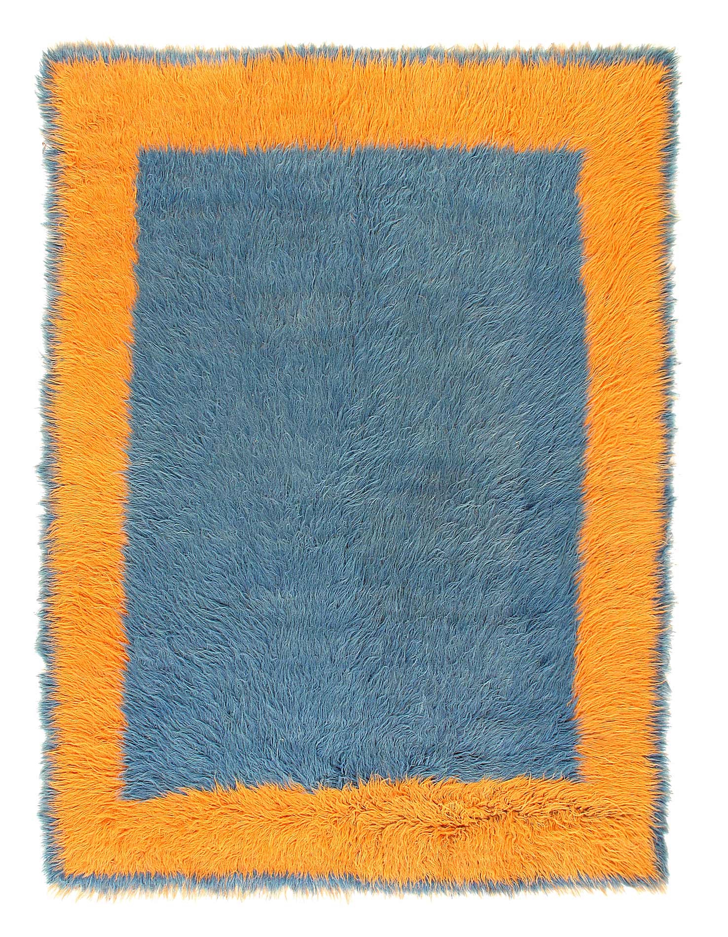 Vintage tulu rug hand-woven in 1960's in Turkey and in excellent condition. Tulu is basically a kilim or a plainweave with tufts of wool or goat-hair yarn interwoven using the Turkish knot to form tuft patterns on the underlying design. Tulu is the English pronunciation for the Turkish word, "tüylü" meaning hairy. The technique used for weaving is very similar to "gabbeh" in Iran, have been produced for functional purposes rather than commercially and in mountainous regions, so they all have thick pile for protection against cold. Their weaving is more coarse so they can be woven faster at home that the sophisticated fine rugs that can only be woven from a pattern in workshops. They mostly had "primitive" designs and used undyed hand-spun wool or few colors.