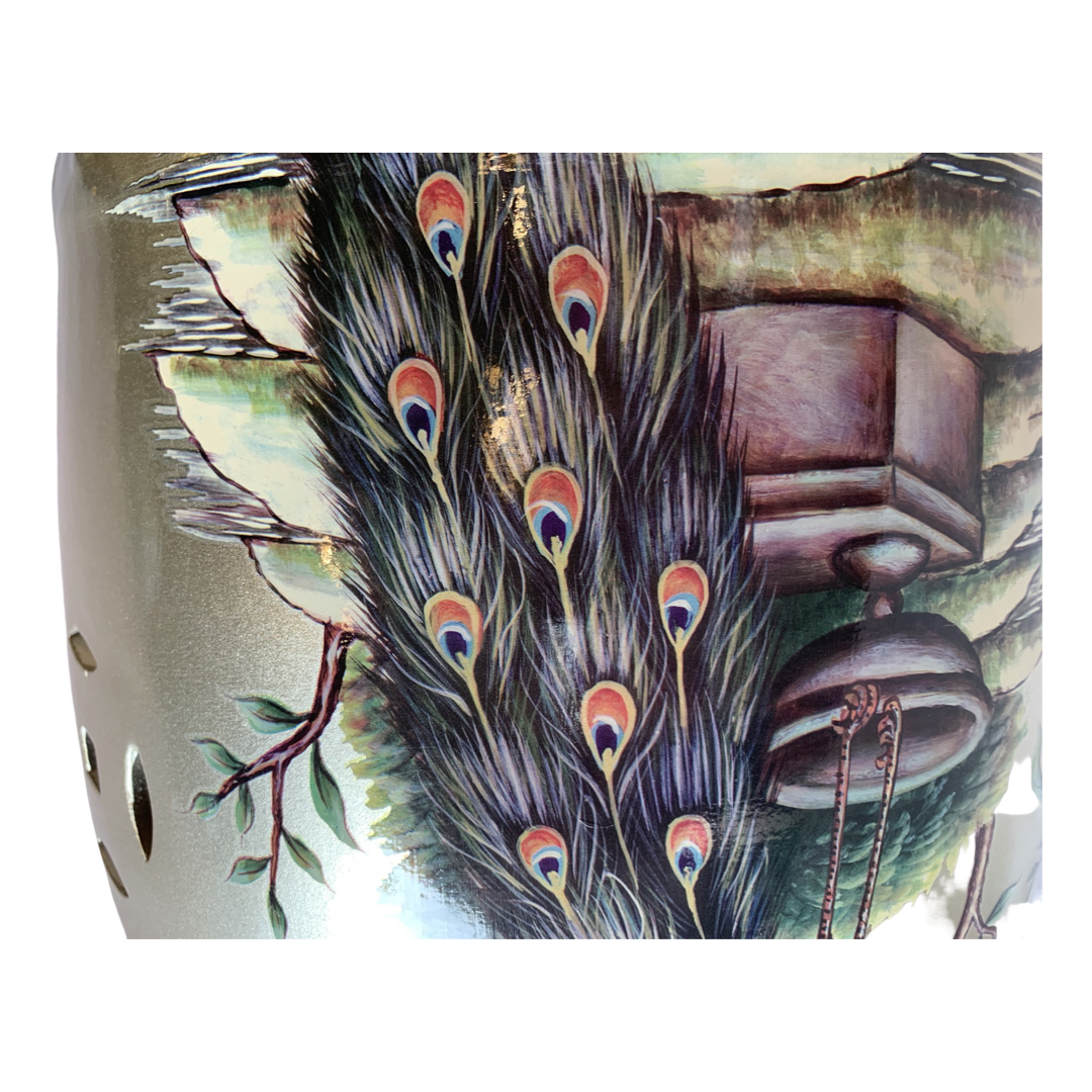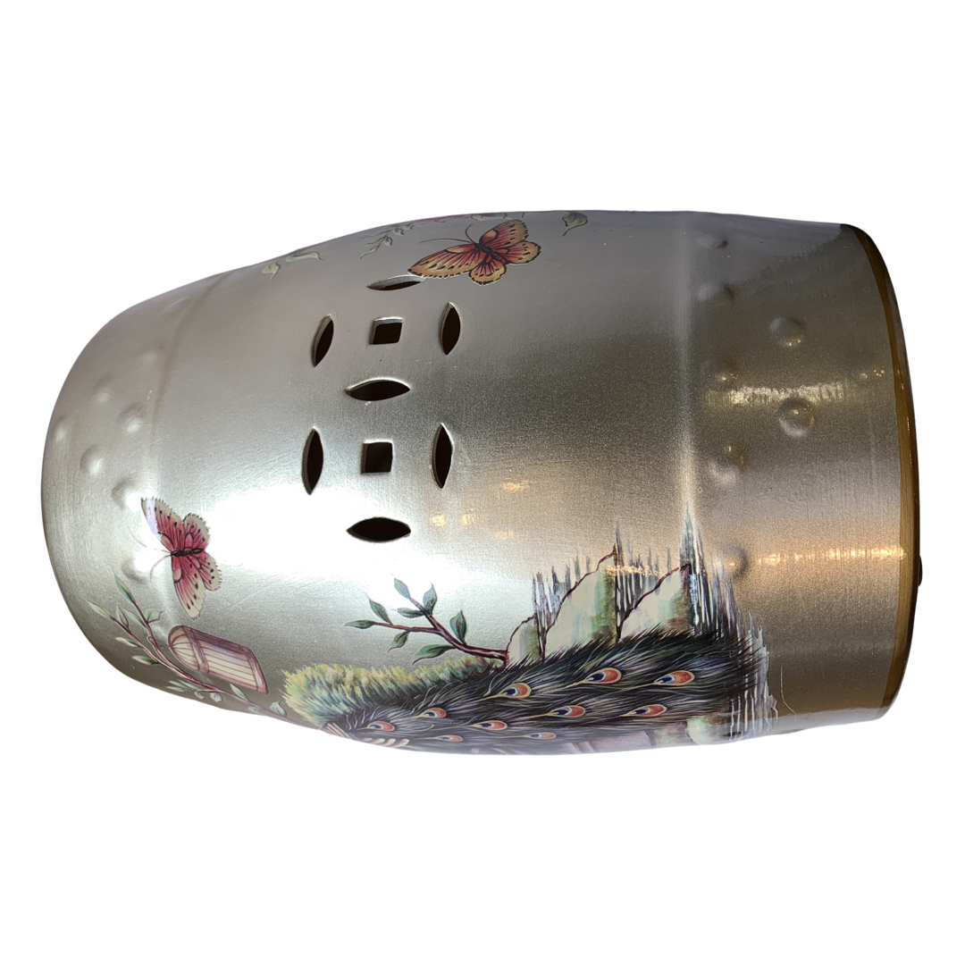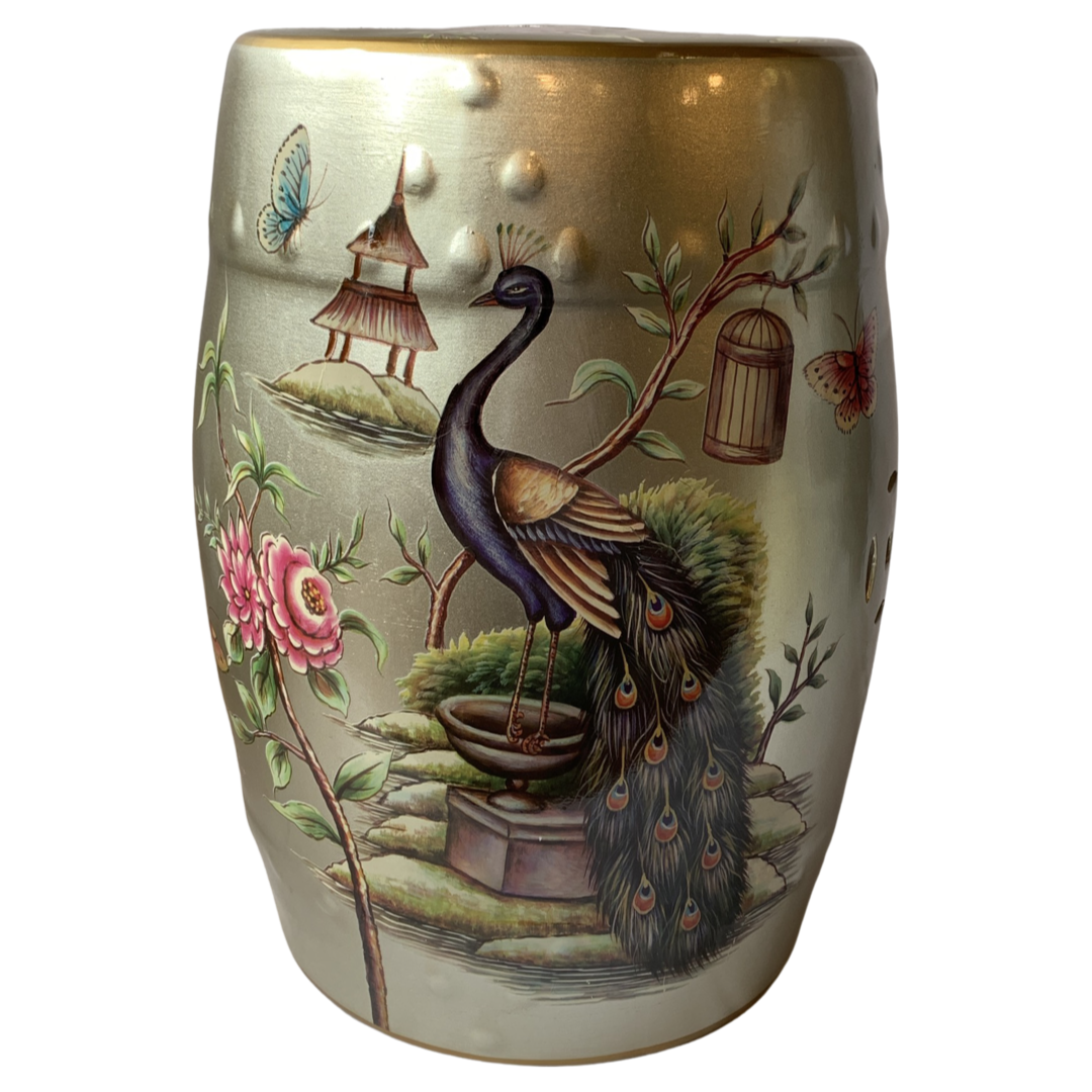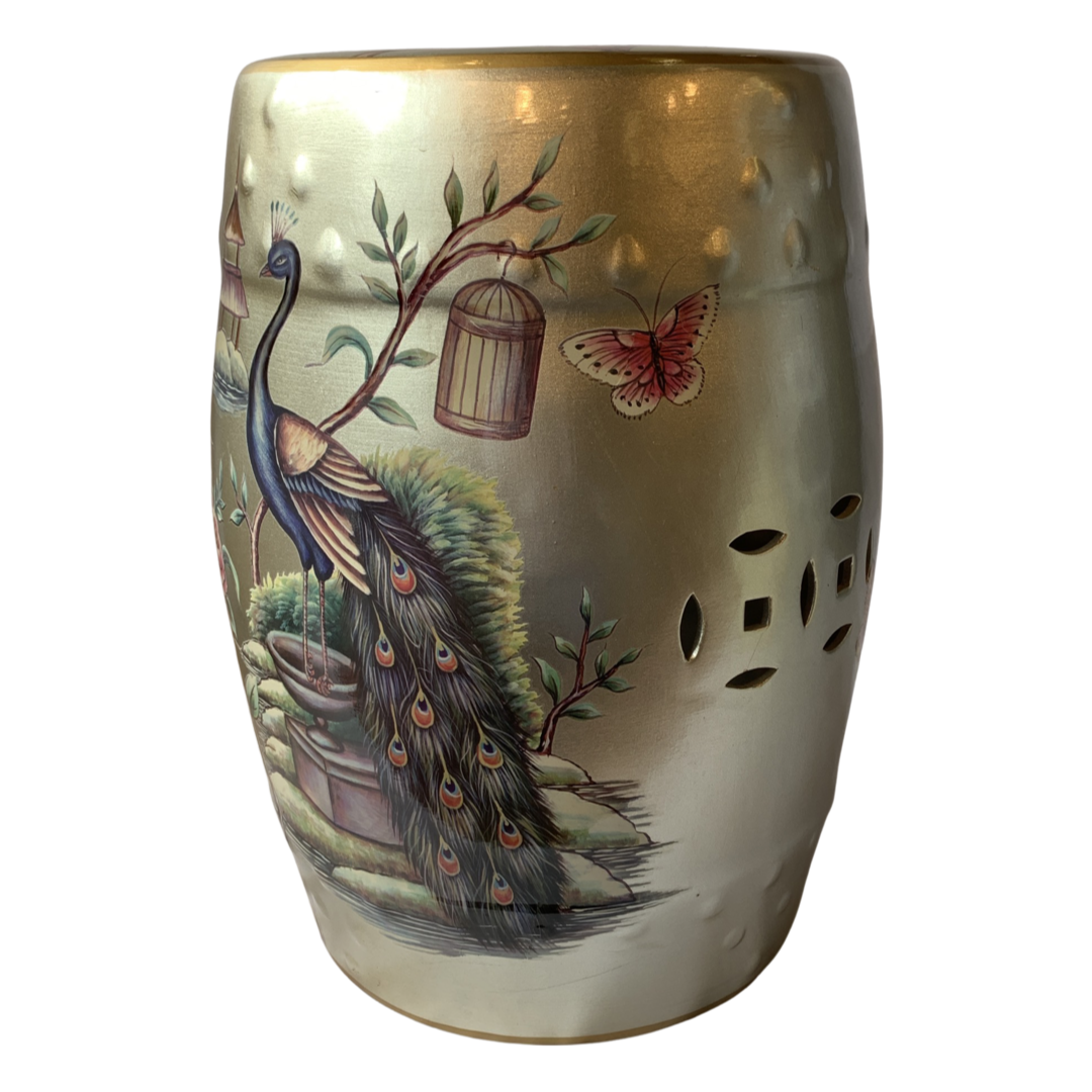 A contemporary Chinese ceramic garden stool. The seat features a rounded barrel shape and colorful peacock and floral motif decoration over Gold , glaze, with pierced designs to the side and top.