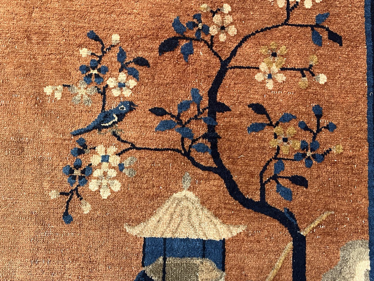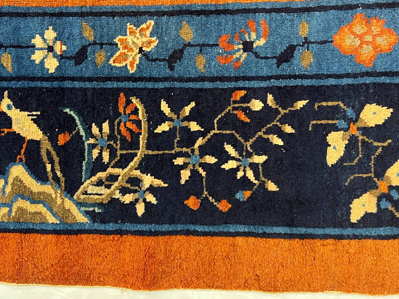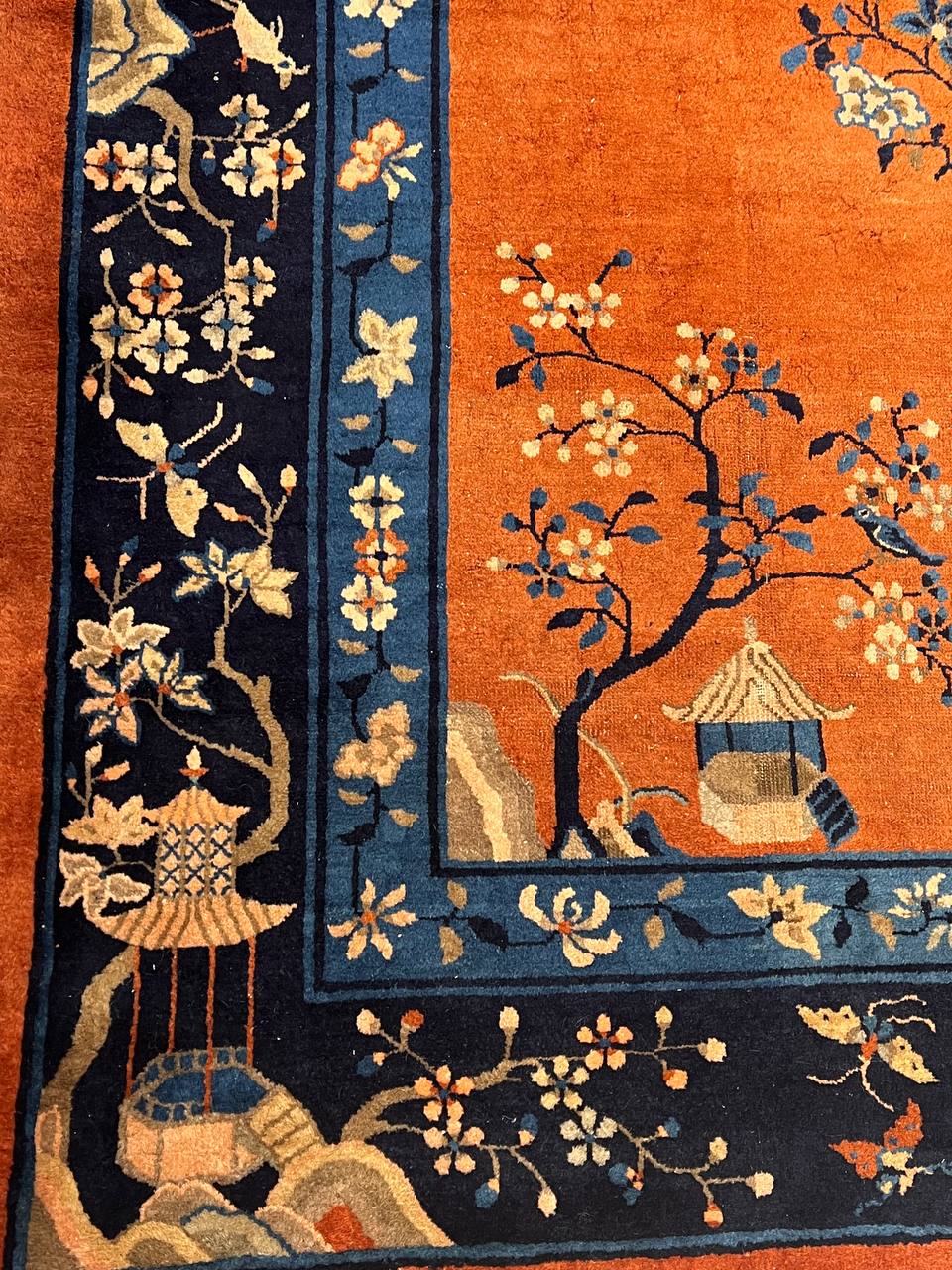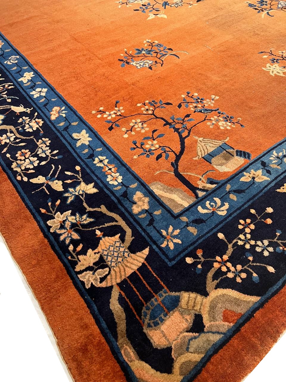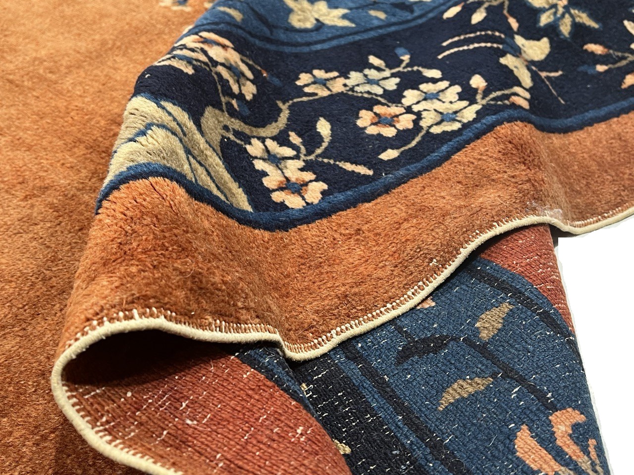 Chinese Deco Rug, Origin: China, Circa: Early 20th Century β Here is an exciting and appealing antique Oriental carpet β an antique Art Deco rug that was designed and woven in China during the early years of the twentieth century. Heavily informed by the aesthetic inclinations of the Art Deco period, this unique carpet is a compelling and thought-provoking example. A scalloped border of Blue encloses a Gold / orange sand field on this exquisitely subtle and restrained antique Chinese Art Deco. At first the field appears empty or open, but it is actually covered by a tone-on-tone design of scrolls and cloud-bands emanating inward from the outer edges. In their sinuous rhythms they echo the scalloped forms of the border and continue its visual effects across the carpet in a more subdued manner. This carpet testifies to the masterful design sensibilities of Chinese weavers as they made the transition into the modern world. The Art Deco movement had an outside influence on the world of art and design, and some of the most important qualities and characteristics of that movement may be found in this fine rug.