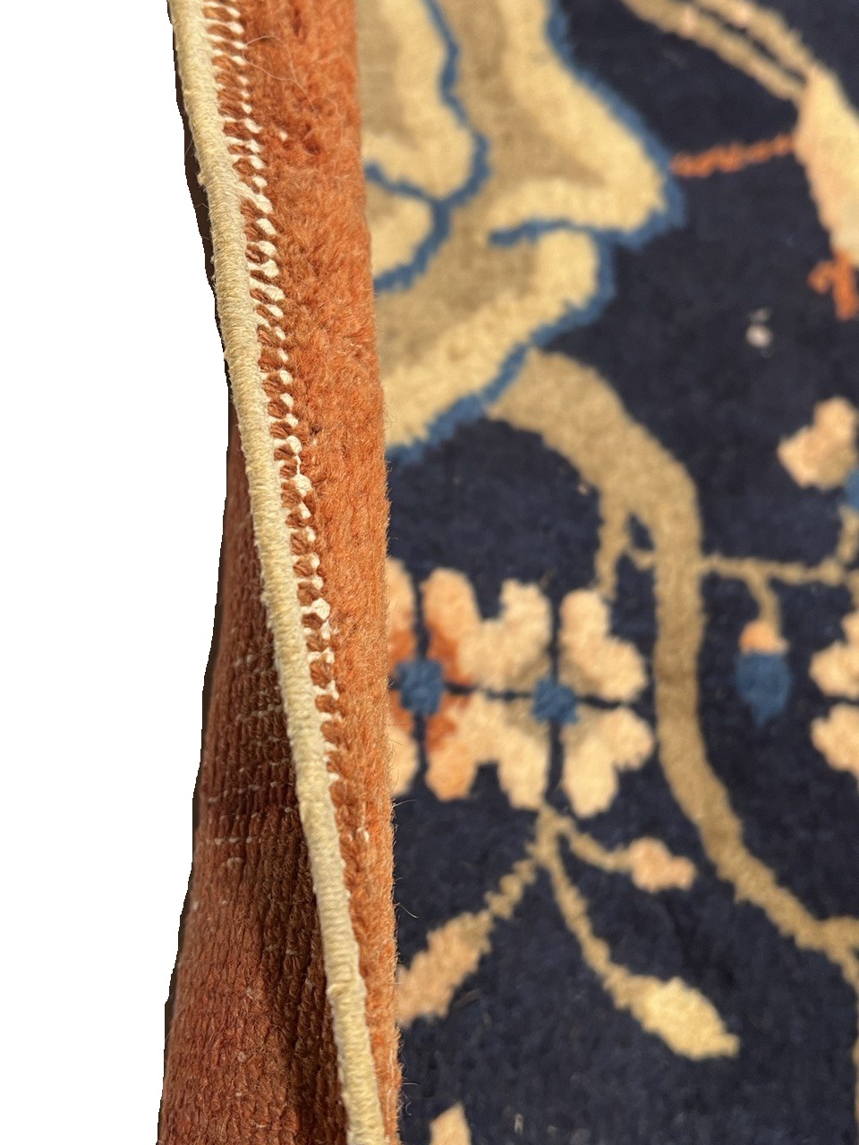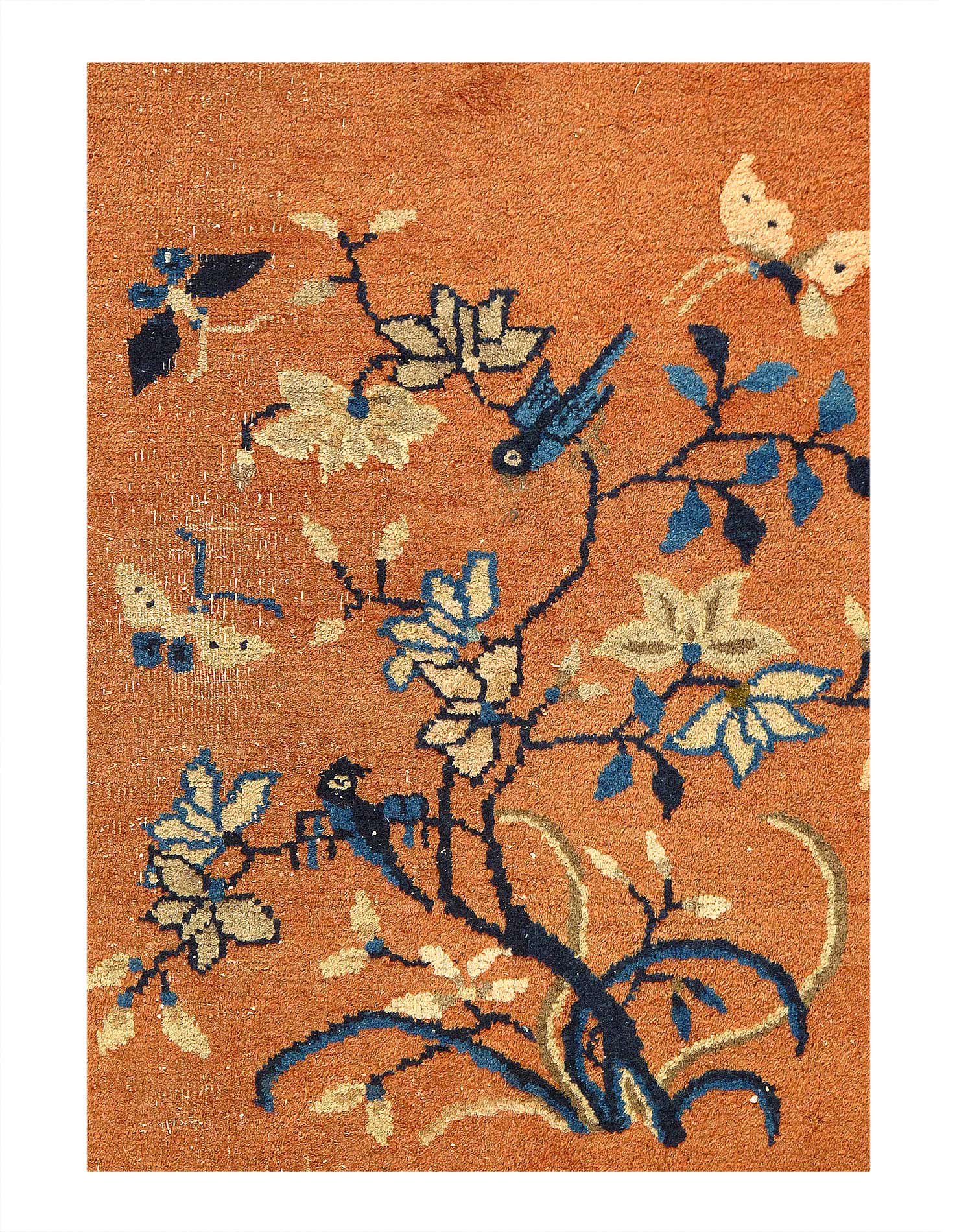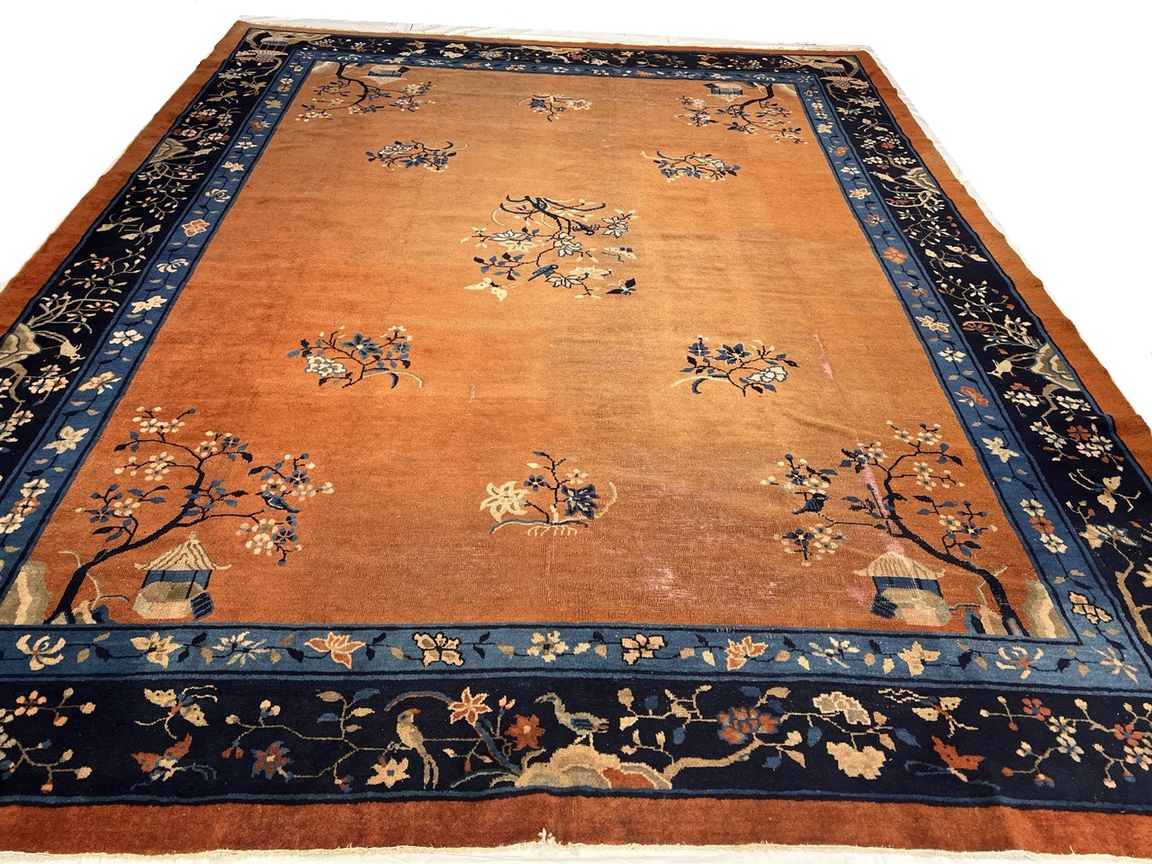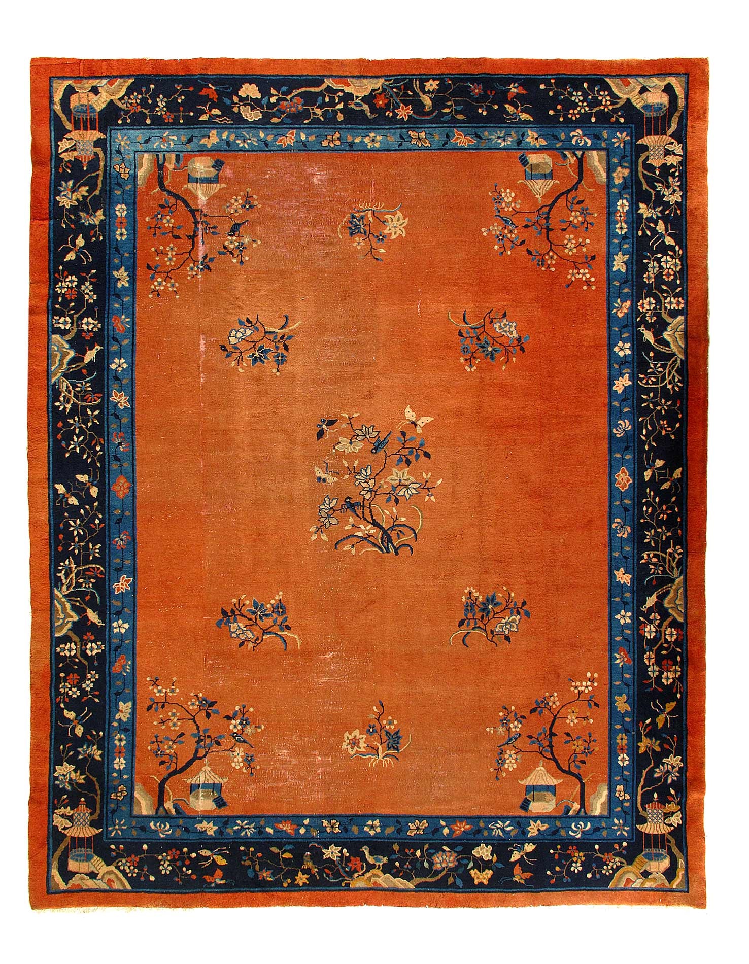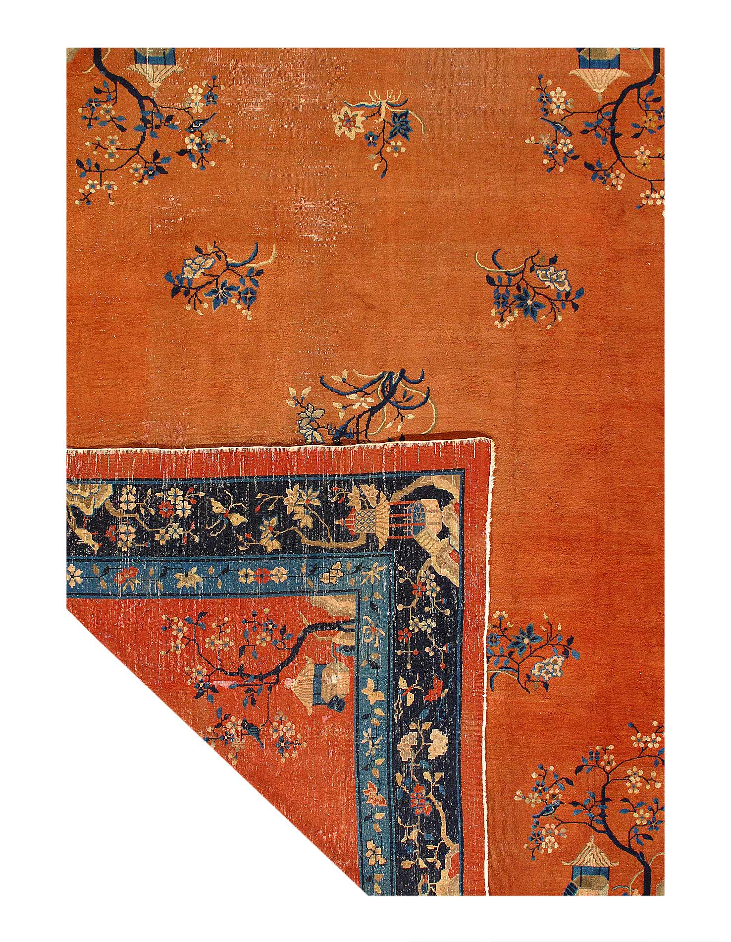 Chinese Deco Rug, Origin: China, Circa: Early 20th Century β Here is an exciting and appealing antique Oriental carpet β an antique Art Deco rug that was designed and woven in China during the early years of the twentieth century. Heavily informed by the aesthetic inclinations of the Art Deco period, this unique carpet is a compelling and thought-provoking example. A scalloped border of Blue encloses a Gold / orange sand field on this exquisitely subtle and restrained antique Chinese Art Deco. At first the field appears empty or open, but it is actually covered by a tone-on-tone design of scrolls and cloud-bands emanating inward from the outer edges. In their sinuous rhythms they echo the scalloped forms of the border and continue its visual effects across the carpet in a more subdued manner. This carpet testifies to the masterful design sensibilities of Chinese weavers as they made the transition into the modern world. The Art Deco movement had an outside influence on the world of art and design, and some of the most important qualities and characteristics of that movement may be found in this fine rug.