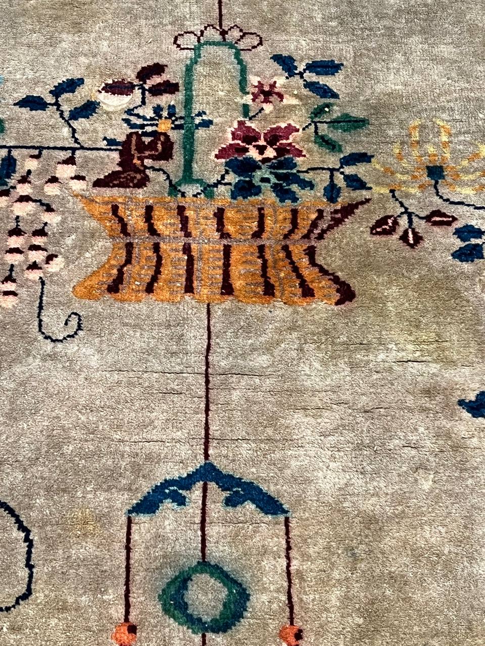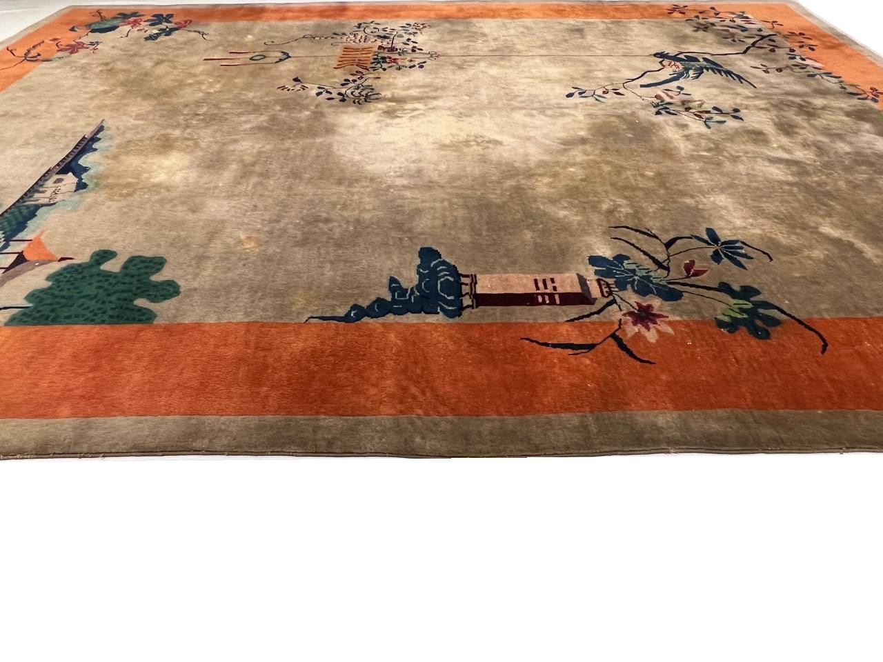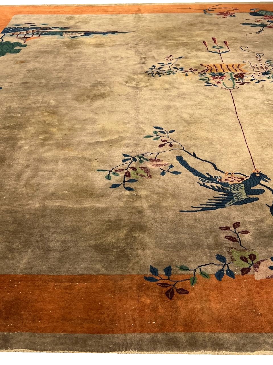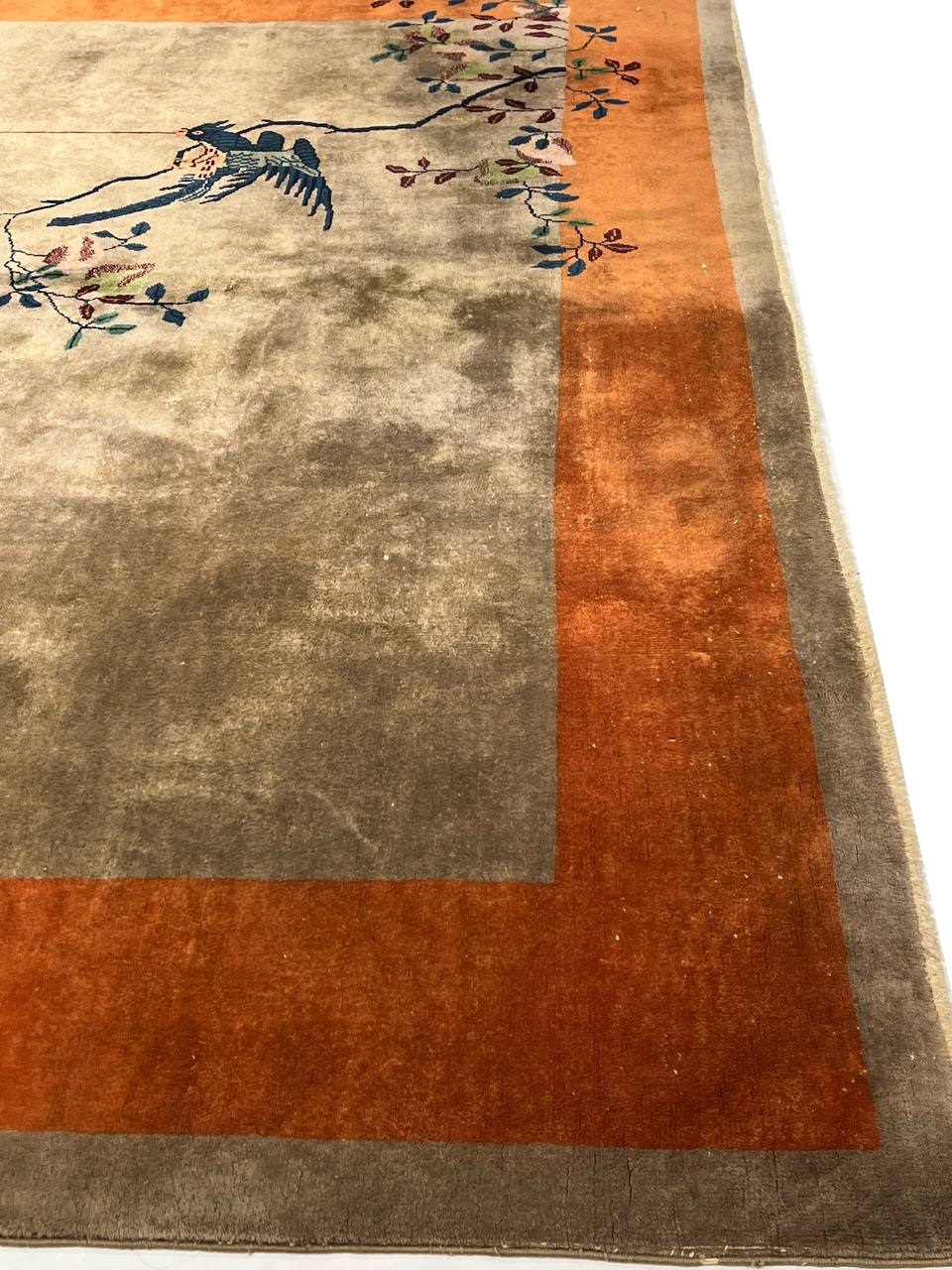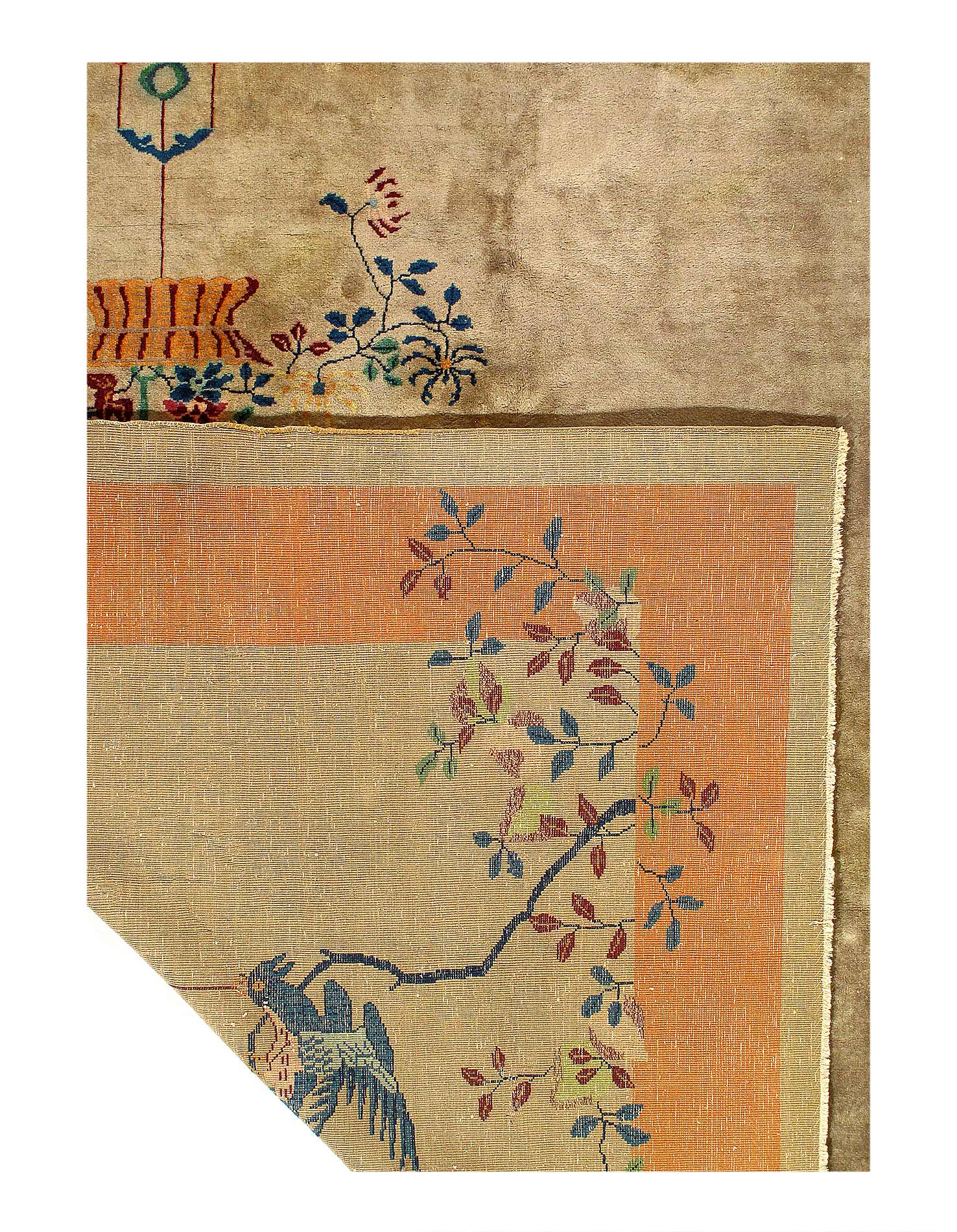 Chinese Deco Rug, Origin: China, Circa: Early 20th Century – Here is an exciting and appealing antique Oriental carpet – an antique Art Deco rug that was designed and woven in China during the early years of the twentieth century. Heavily informed by the aesthetic inclinations of the Art Deco period, this unique carpet is a compelling and thought-provoking example. A scalloped border of Beige / Ivory / light blue sand field on this exquisitely subtle and restrained antique Chinese Art Deco. At first the field appears empty or open, but it is actually covered by a tone-on-tone design of scrolls and cloud-bands emanating inward from the outer edges. In their sinuous rhythms they echo the scalloped forms of the border and continue its visual effects across the carpet in a more subdued manner. This carpet testifies to the masterful design sensibilities of Chinese weavers as they made the transition into the modern world. The Art Deco movement had an outside influence on the world of art and design, and some of the most important qualities and characteristics of that movement may be found in this fine rug.