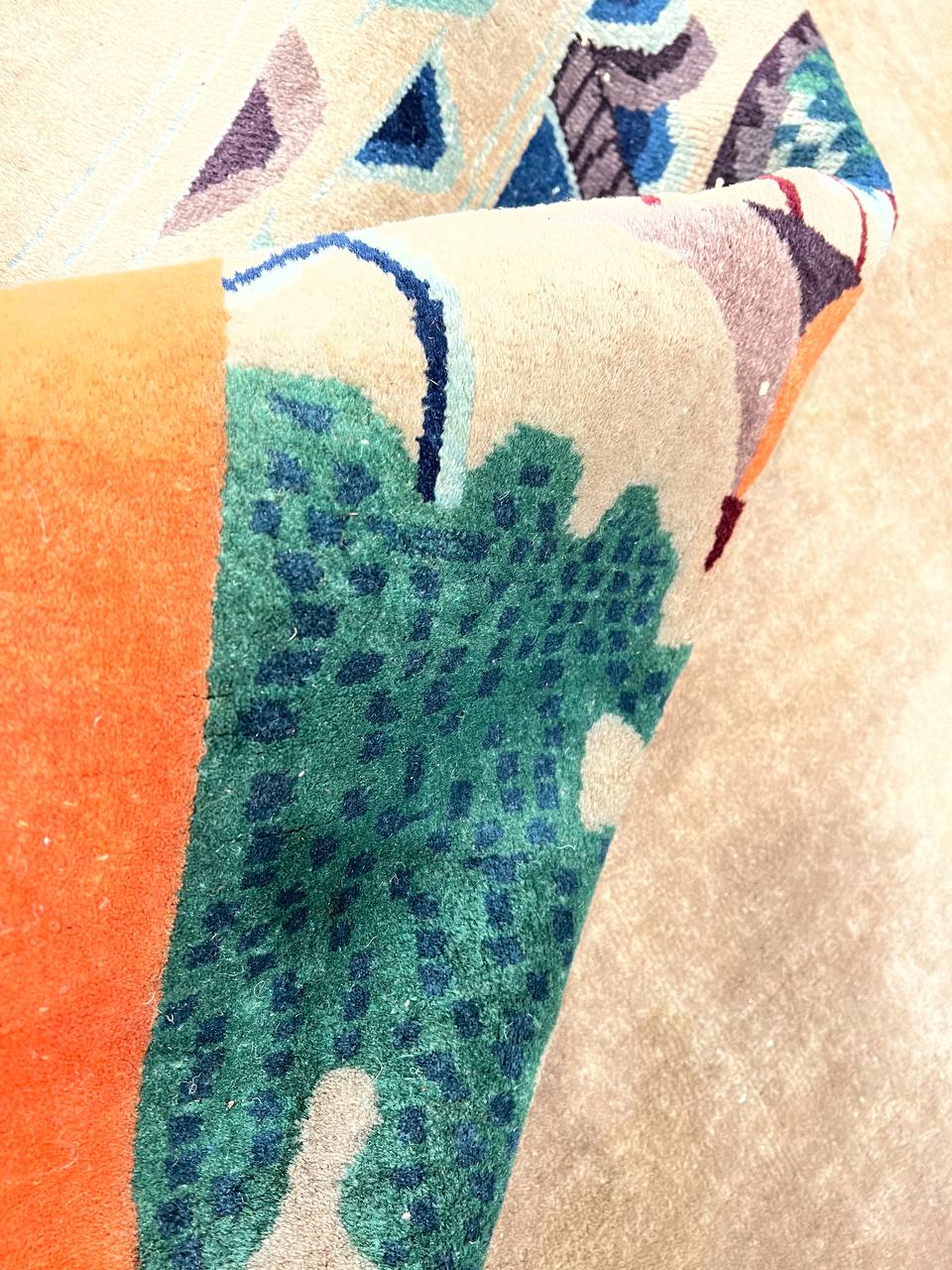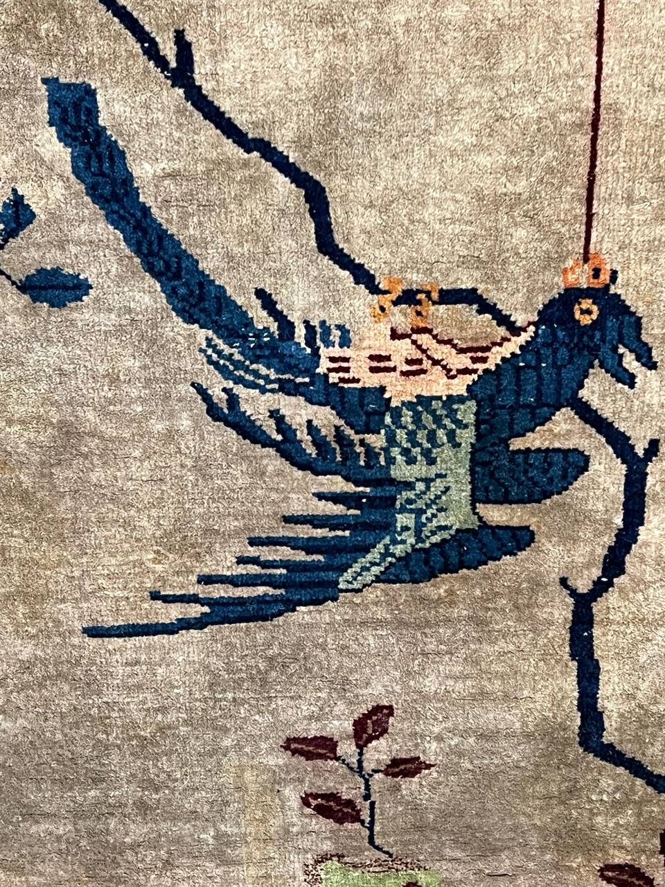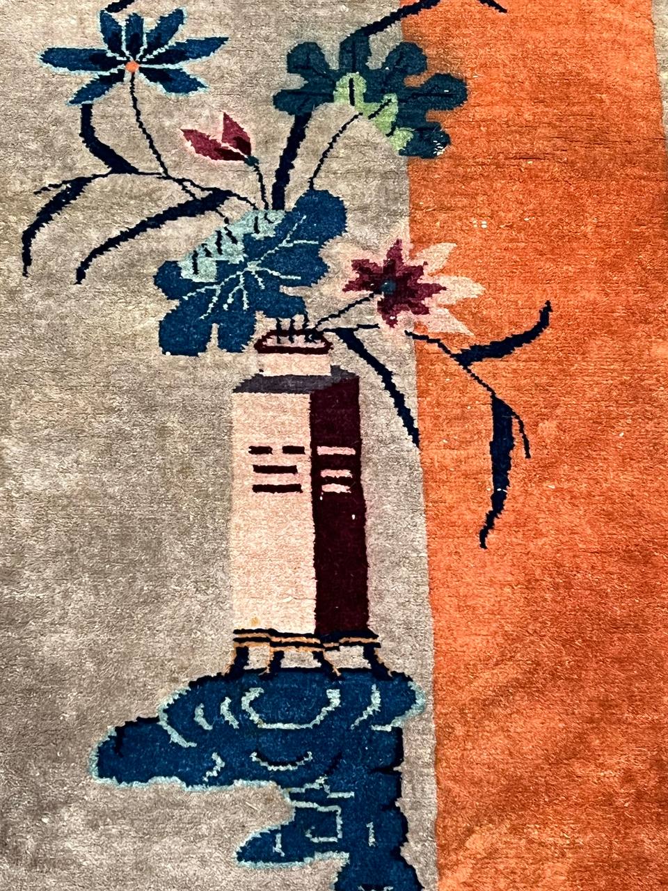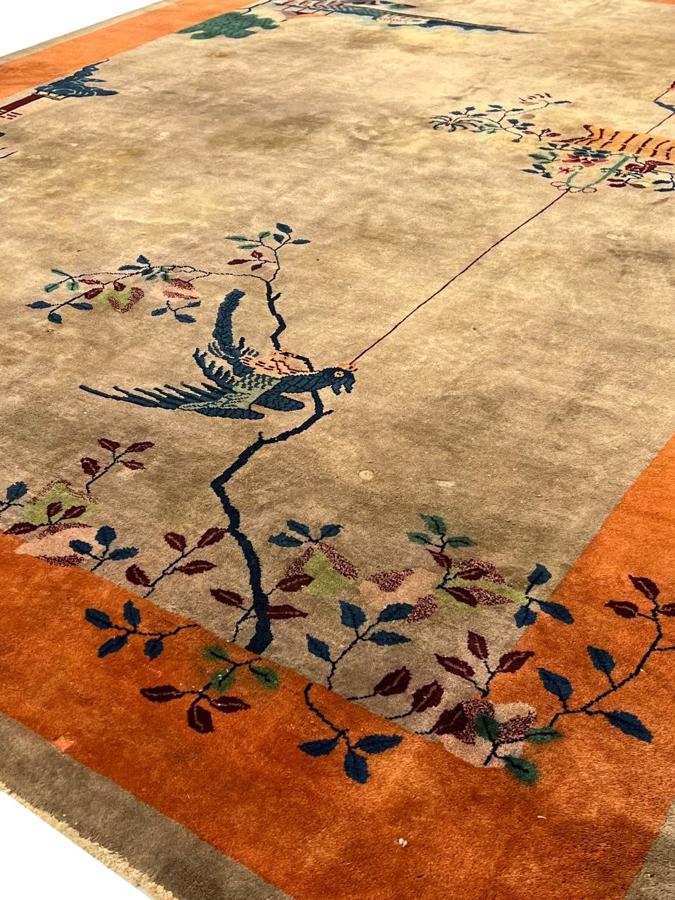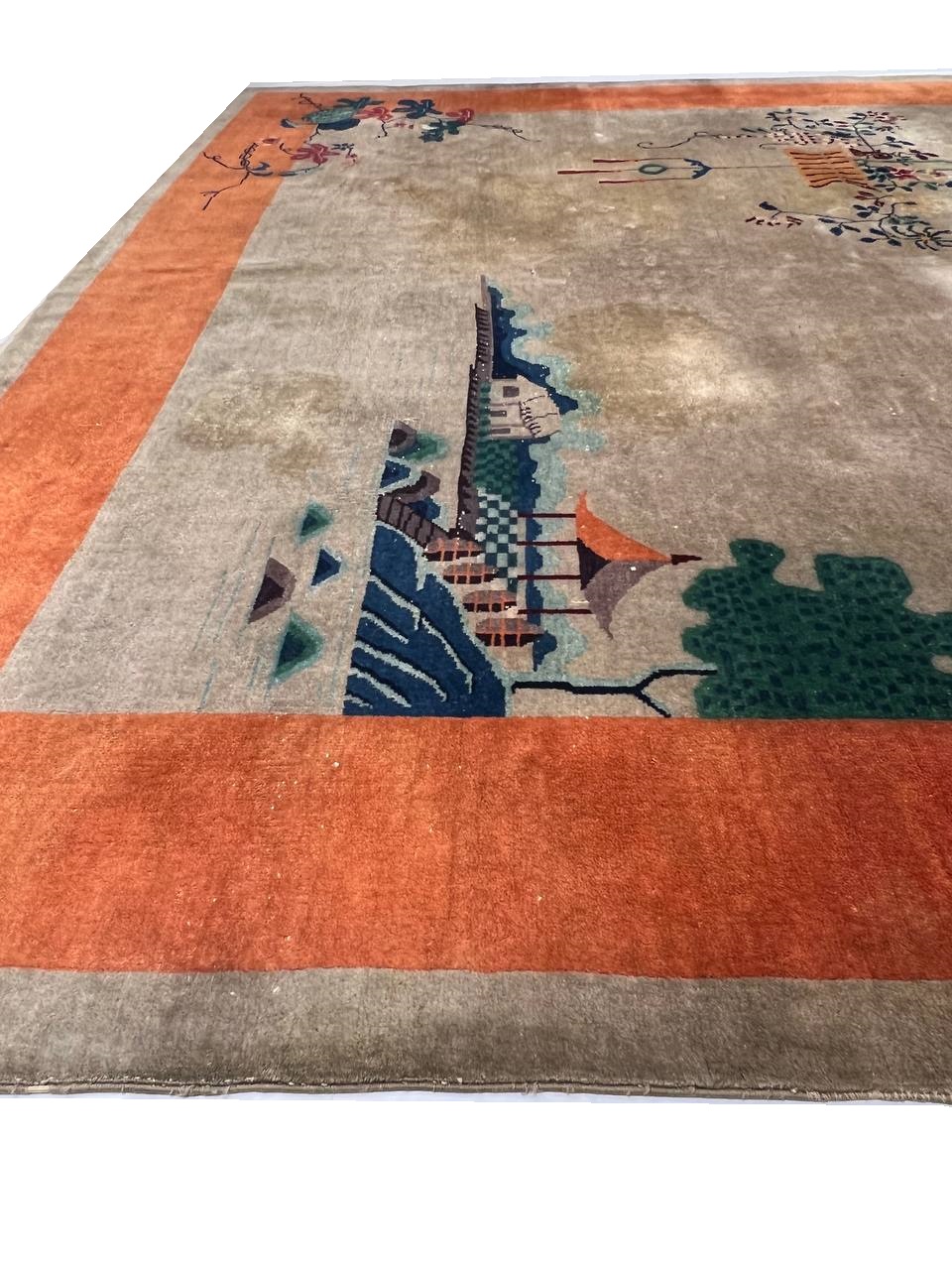 Chinese Deco Rug, Origin: China, Circa: Early 20th Century – Here is an exciting and appealing antique Oriental carpet – an antique Art Deco rug that was designed and woven in China during the early years of the twentieth century. Heavily informed by the aesthetic inclinations of the Art Deco period, this unique carpet is a compelling and thought-provoking example. A scalloped border of Beige / Ivory / light blue sand field on this exquisitely subtle and restrained antique Chinese Art Deco. At first the field appears empty or open, but it is actually covered by a tone-on-tone design of scrolls and cloud-bands emanating inward from the outer edges. In their sinuous rhythms they echo the scalloped forms of the border and continue its visual effects across the carpet in a more subdued manner. This carpet testifies to the masterful design sensibilities of Chinese weavers as they made the transition into the modern world. The Art Deco movement had an outside influence on the world of art and design, and some of the most important qualities and characteristics of that movement may be found in this fine rug.
