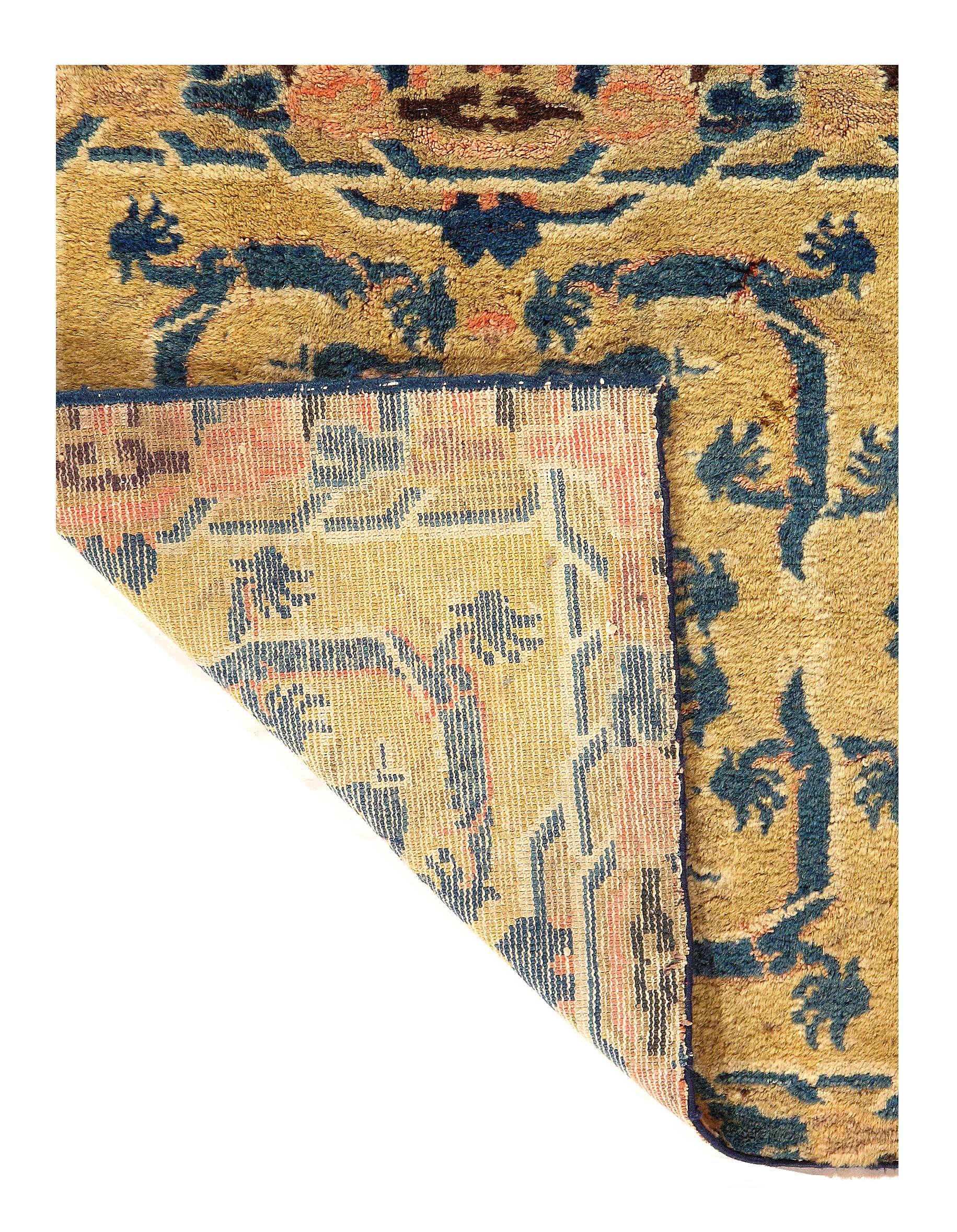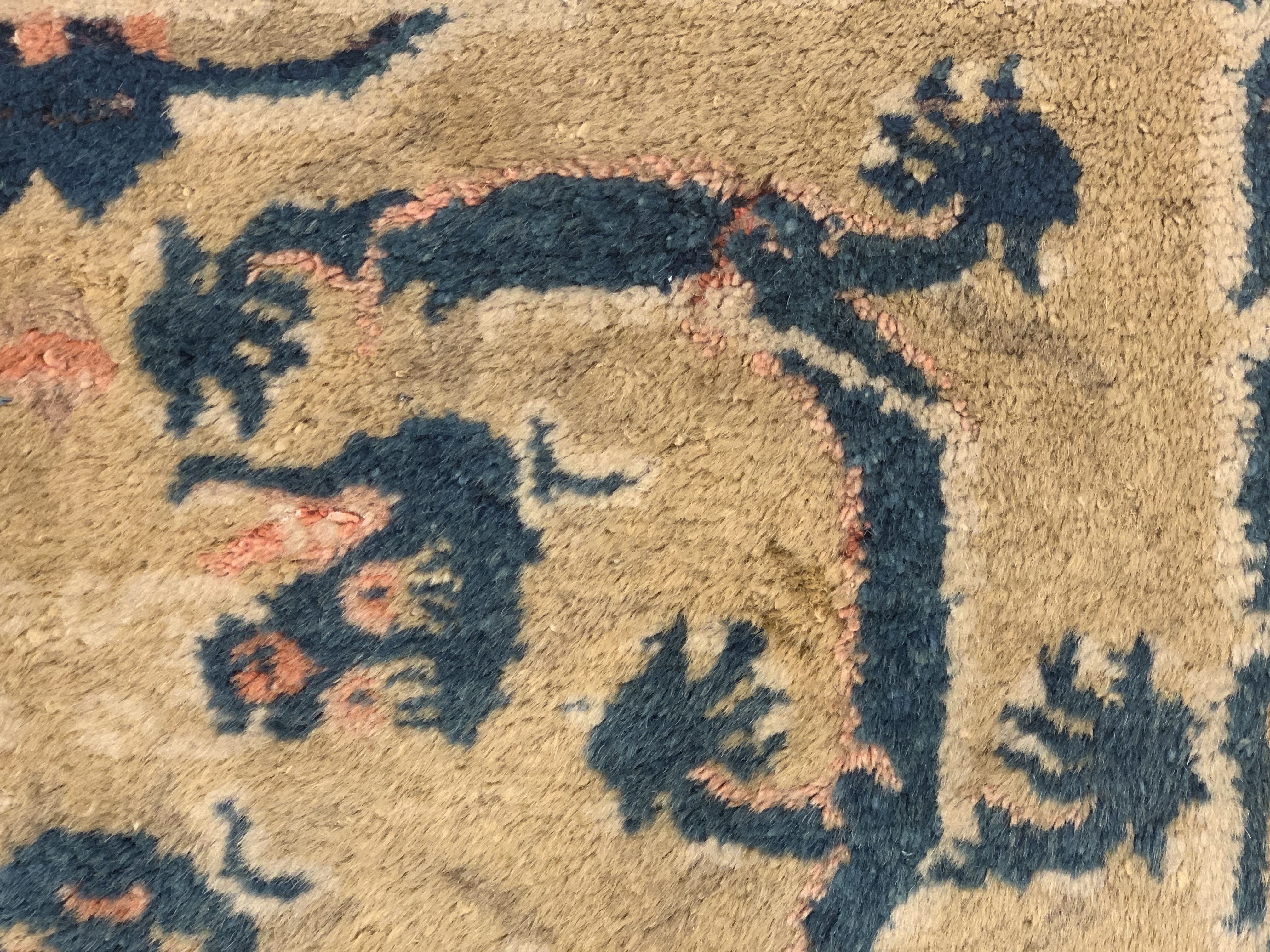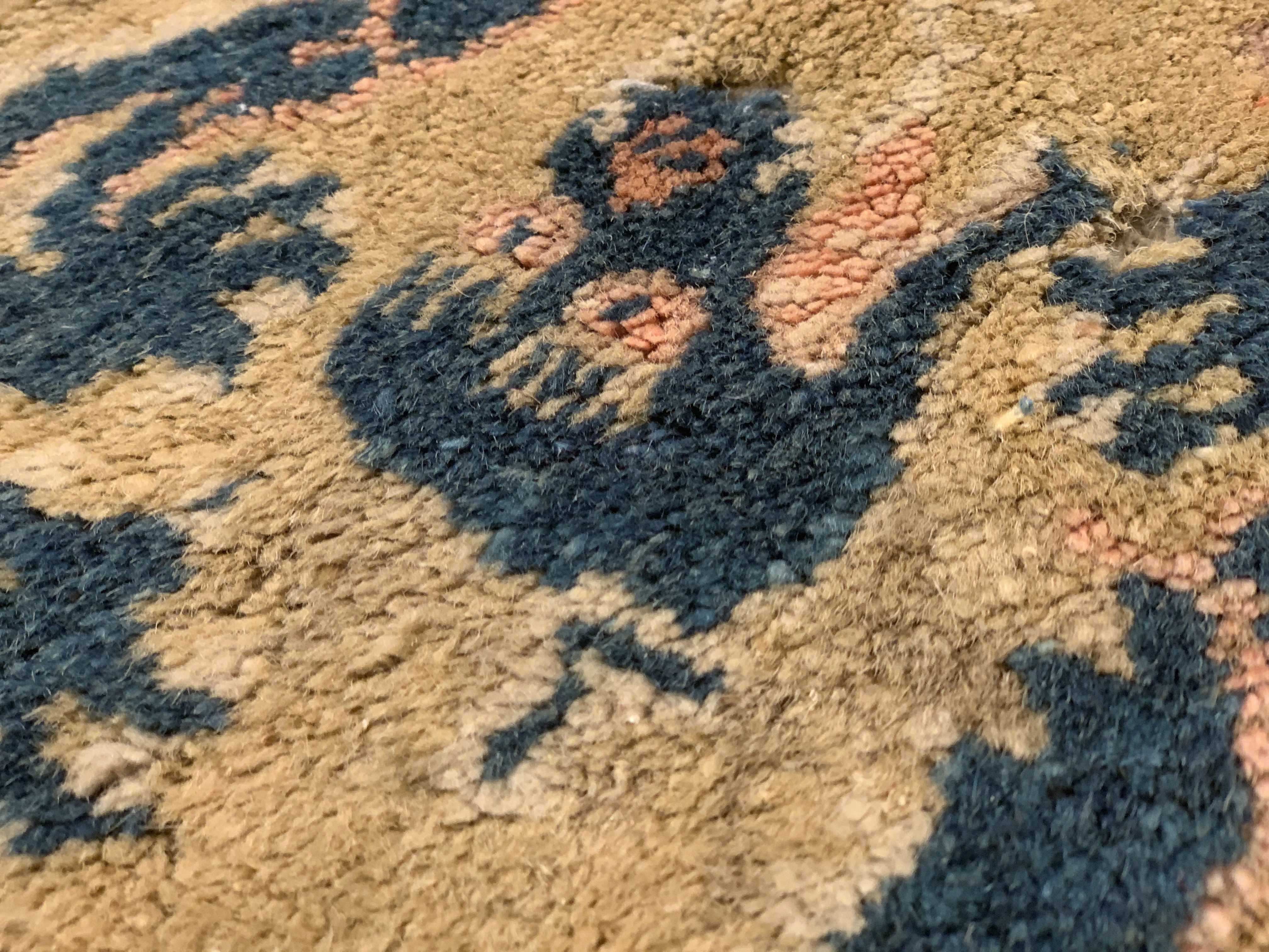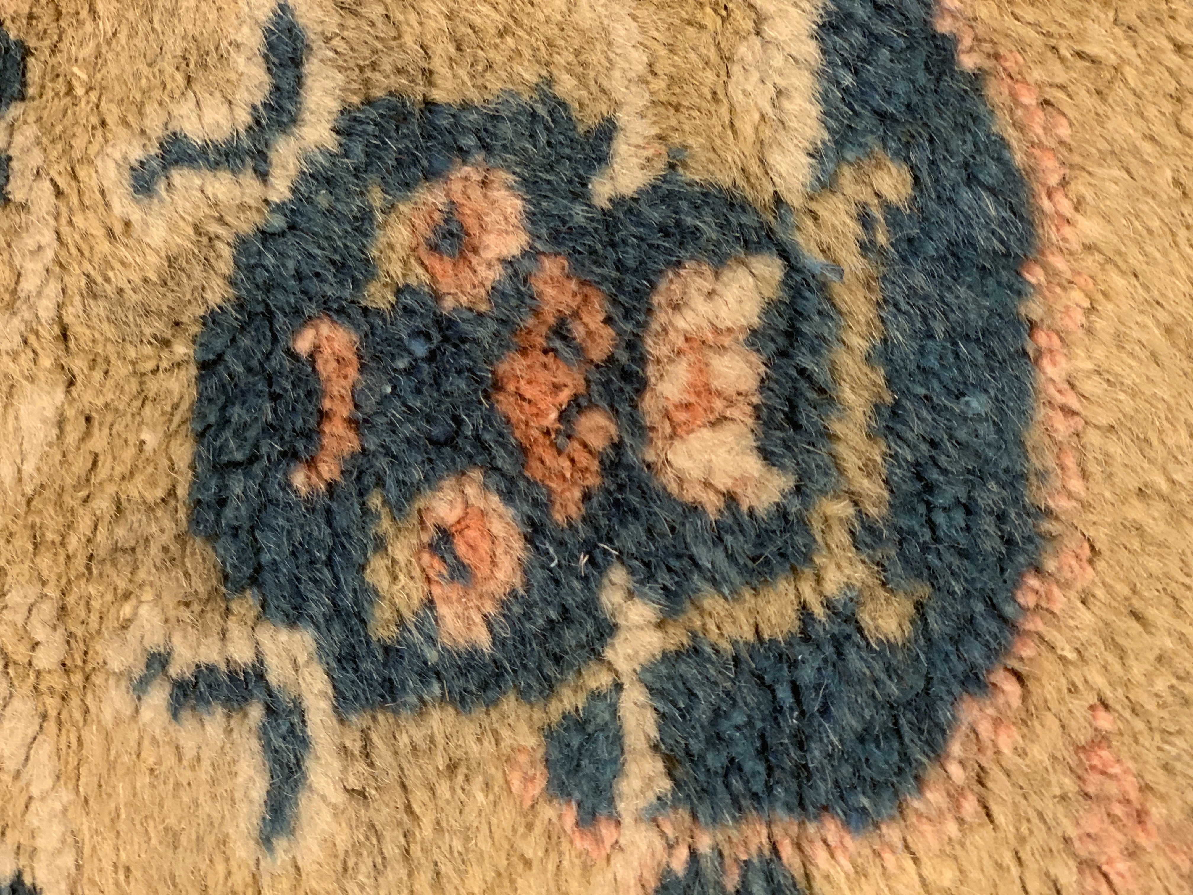 Chinese Deco Rug, Origin: China, Circa: Early 20th Century β Here is an exciting and appealing antique Oriental carpet β an antique Art Deco rug that was designed and woven in China during the early years of the twentieth century. Heavily informed by the aesthetic inclinations of the Art Deco period, this unique carpet is a compelling and thought-provoking example. A scalloped border of Blue encloses a Beige / Ivory sand field on this exquisitely subtle and restrained antique Chinese Art Deco. At first the field appears empty or open, but it is actually covered by a tone-on-tone design of scrolls and cloud-bands emanating inward from the outer edges. In their sinuous rhythms they echo the scalloped forms of the border and continue its visual effects across the carpet in a more subdued manner. This carpet testifies to the masterful design sensibilities of Chinese weavers as they made the transition into the modern world. The Art Deco movement had an outside influence on the world of art and design, and some of the most important qualities and characteristics of that movement may be found in this fine rug.