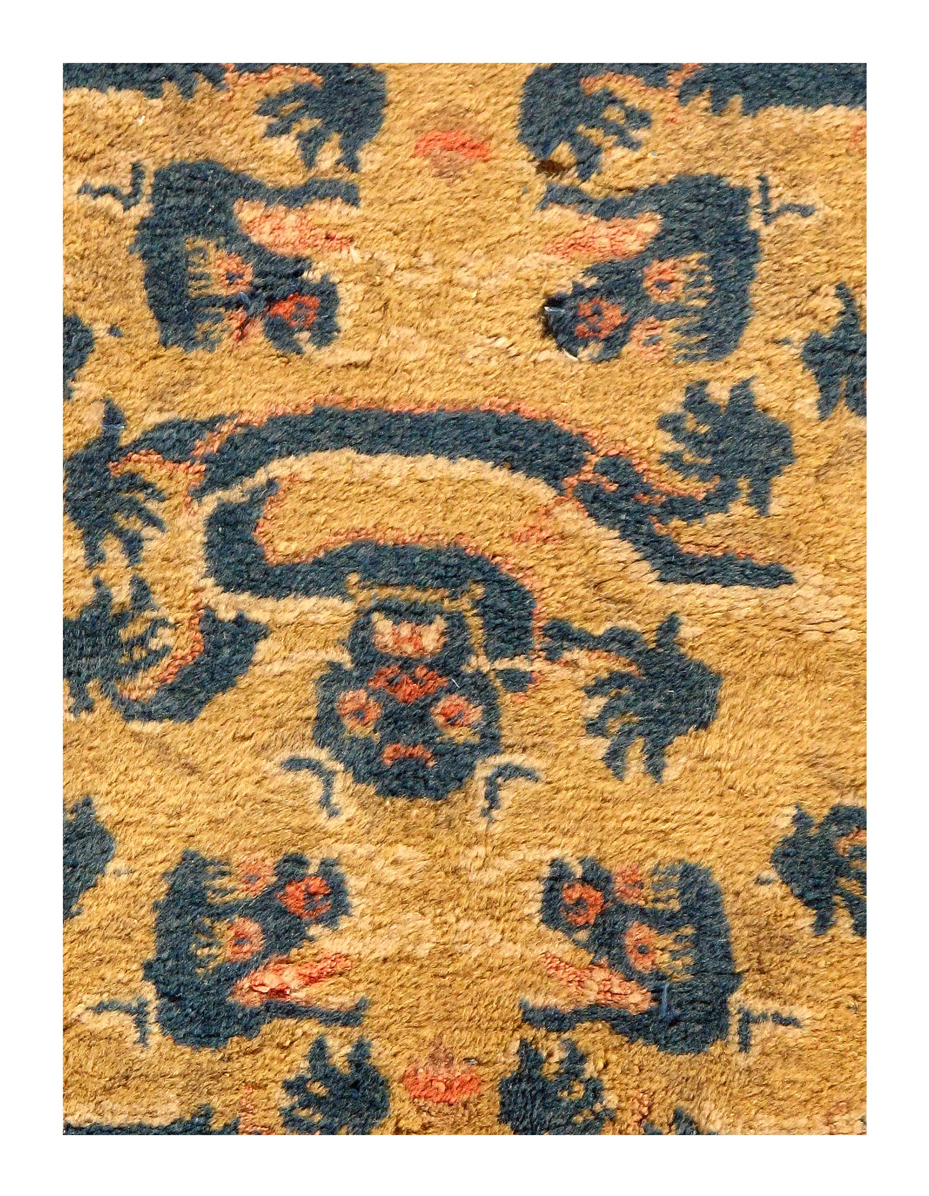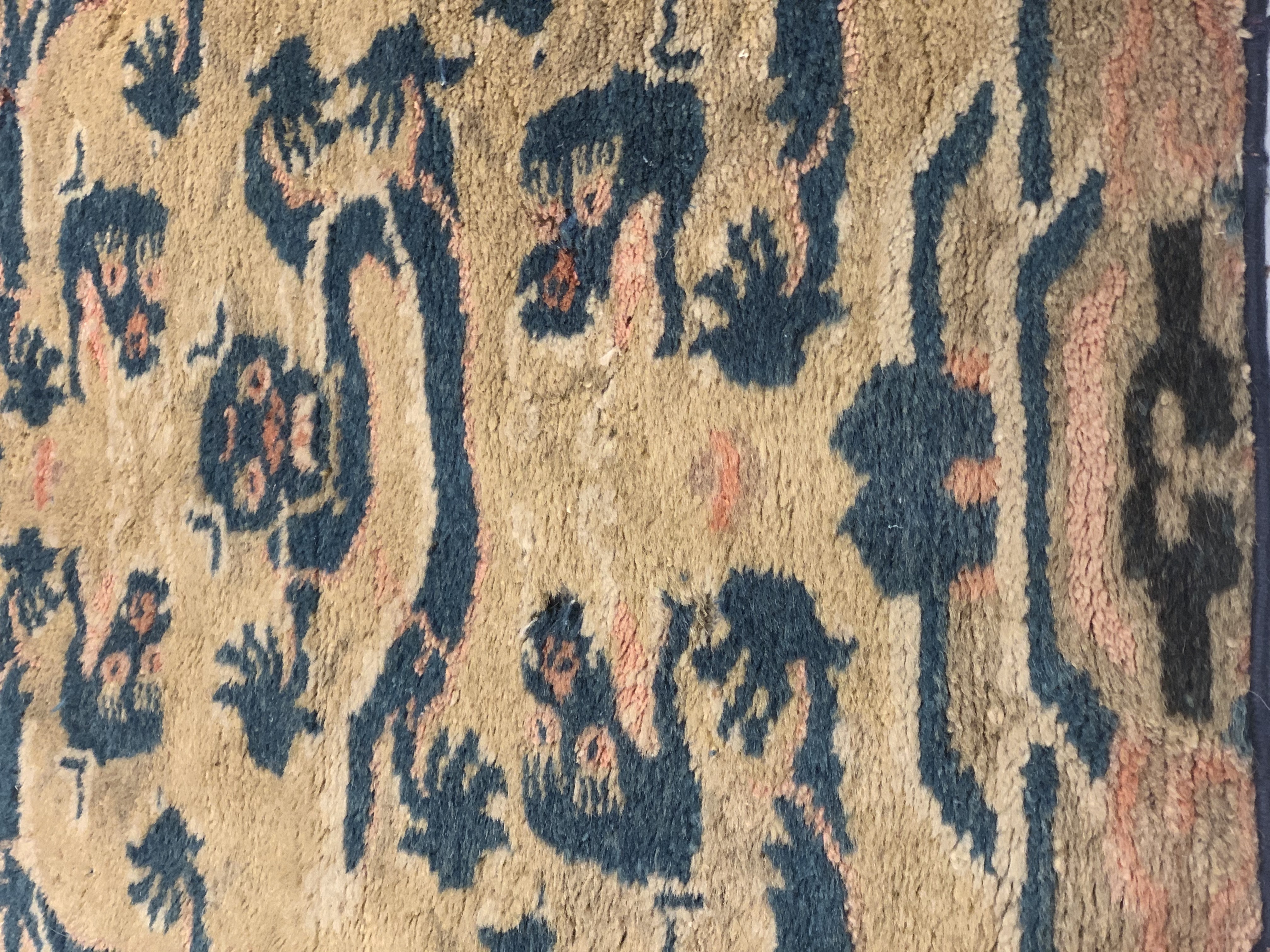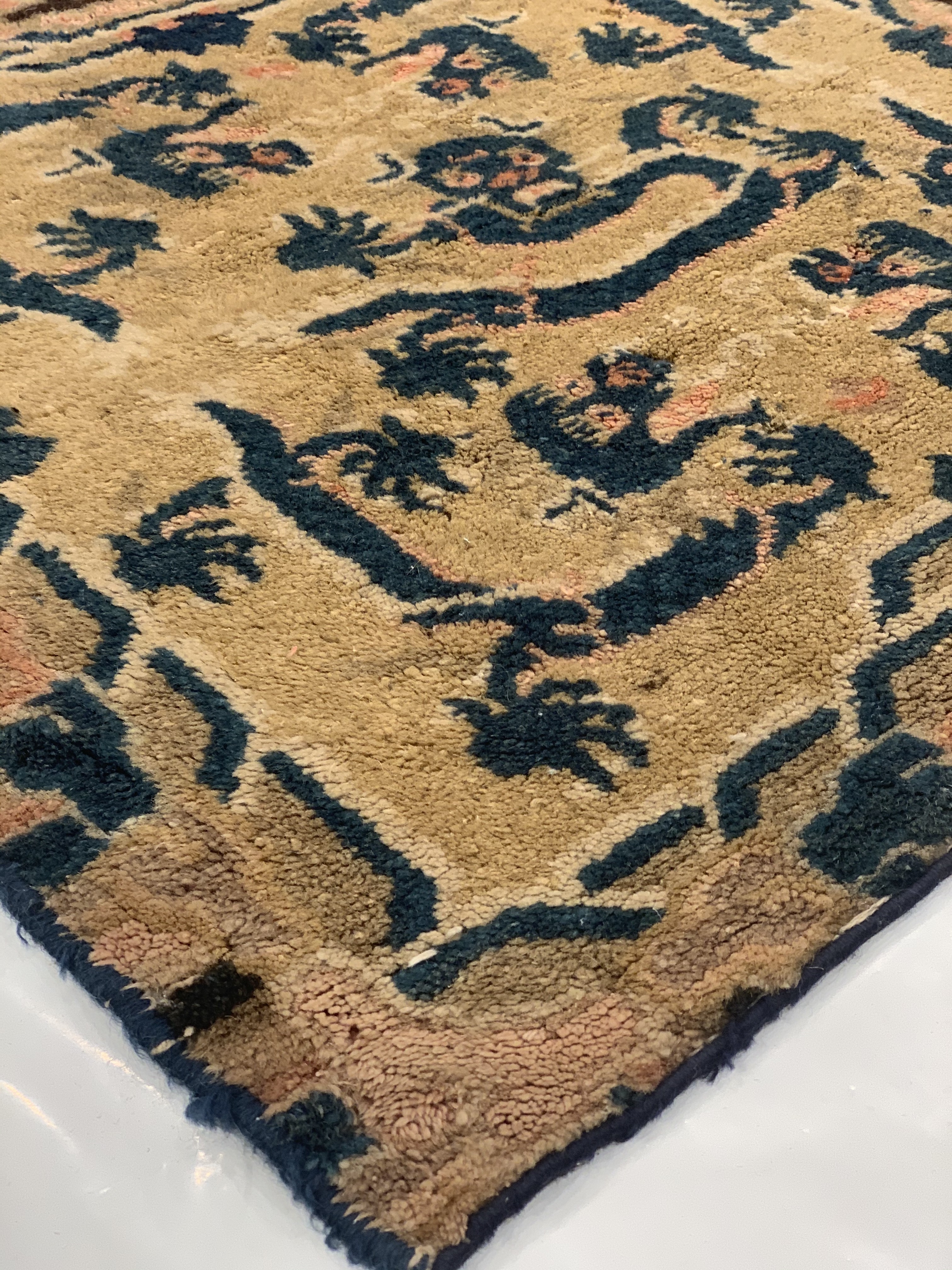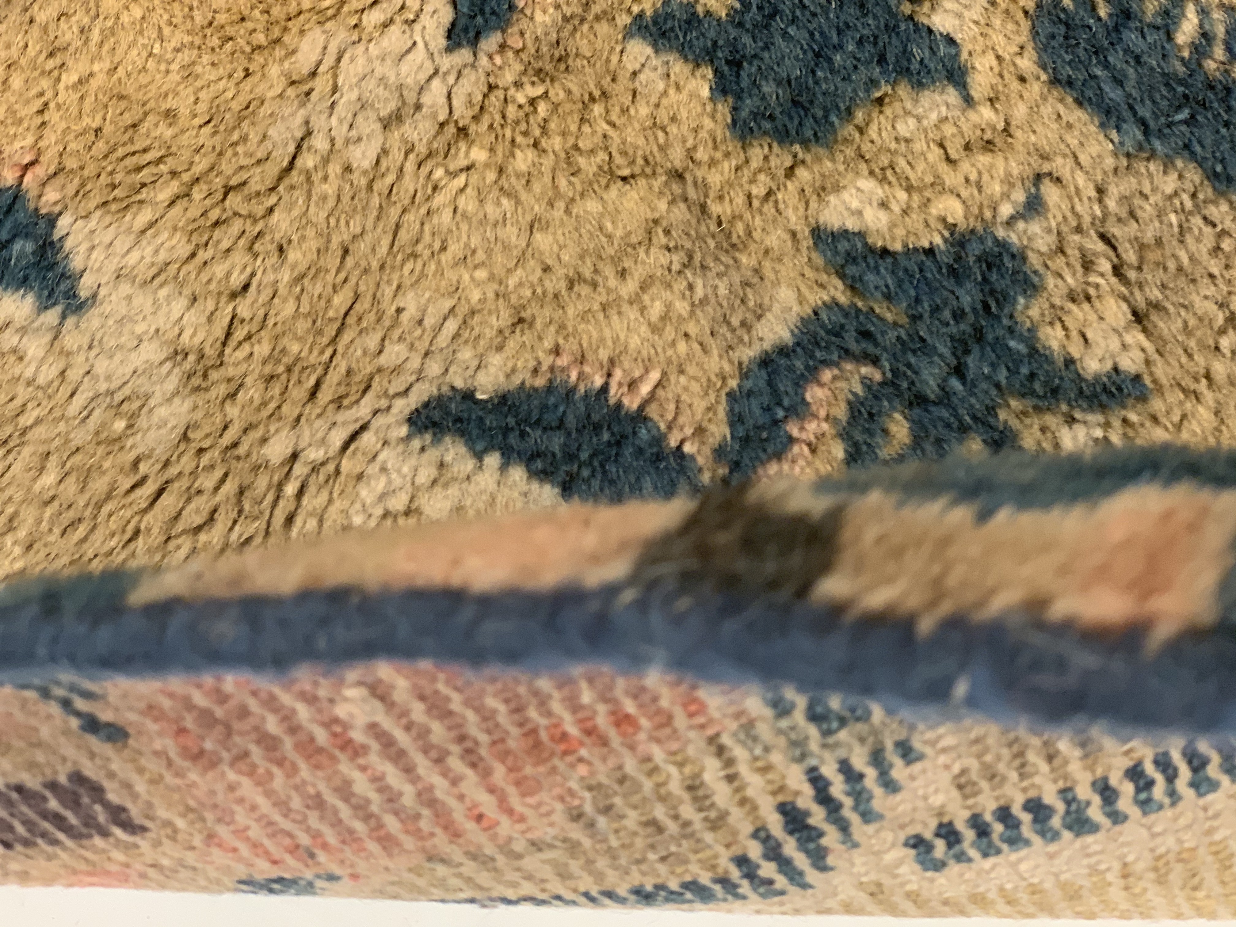 Chinese Deco Rug, Origin: China, Circa: Early 20th Century β Here is an exciting and appealing antique Oriental carpet β an antique Art Deco rug that was designed and woven in China during the early years of the twentieth century. Heavily informed by the aesthetic inclinations of the Art Deco period, this unique carpet is a compelling and thought-provoking example. A scalloped border of Blue encloses a Beige / Ivory sand field on this exquisitely subtle and restrained antique Chinese Art Deco. At first the field appears empty or open, but it is actually covered by a tone-on-tone design of scrolls and cloud-bands emanating inward from the outer edges. In their sinuous rhythms they echo the scalloped forms of the border and continue its visual effects across the carpet in a more subdued manner. This carpet testifies to the masterful design sensibilities of Chinese weavers as they made the transition into the modern world. The Art Deco movement had an outside influence on the world of art and design, and some of the most important qualities and characteristics of that movement may be found in this fine rug.