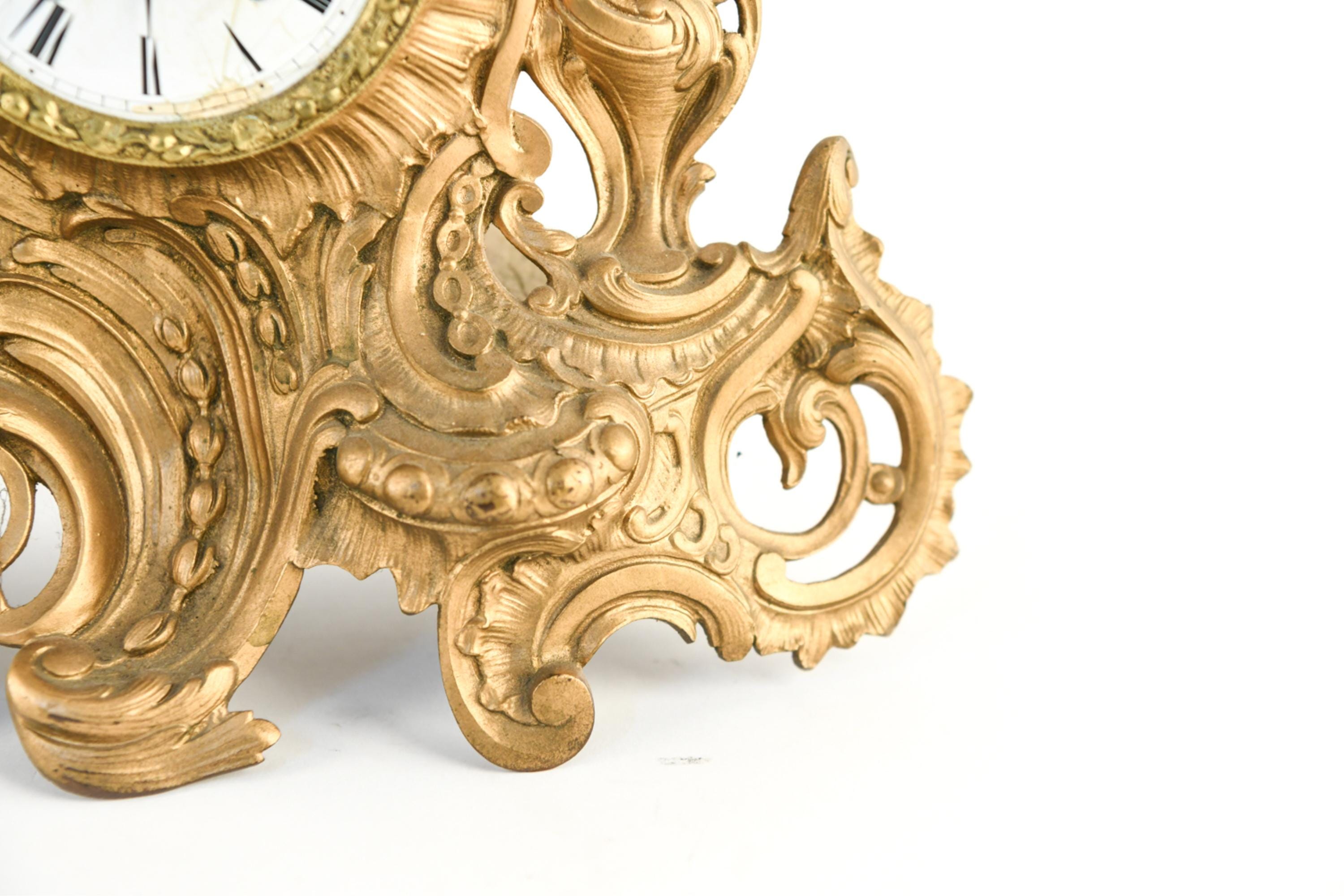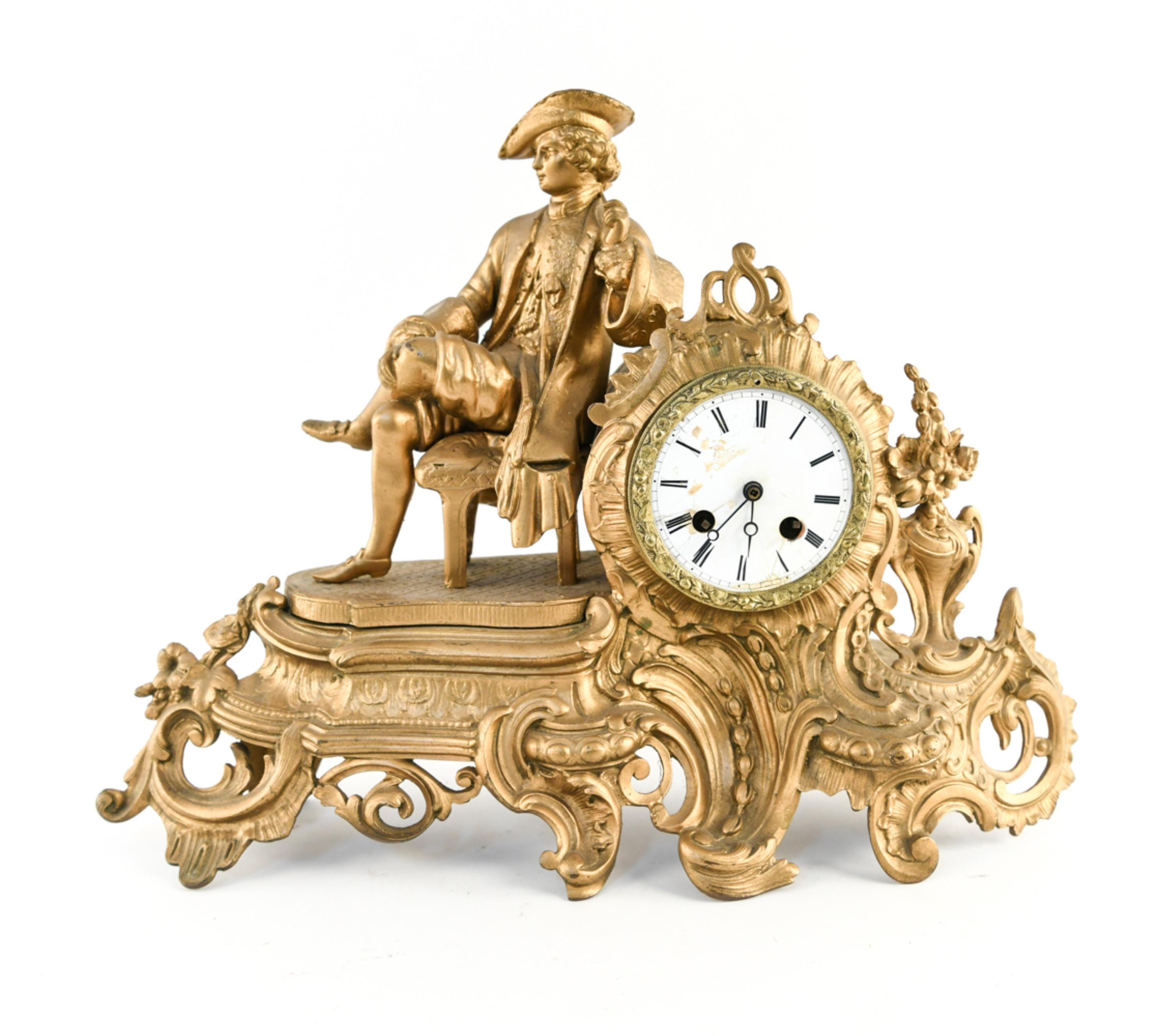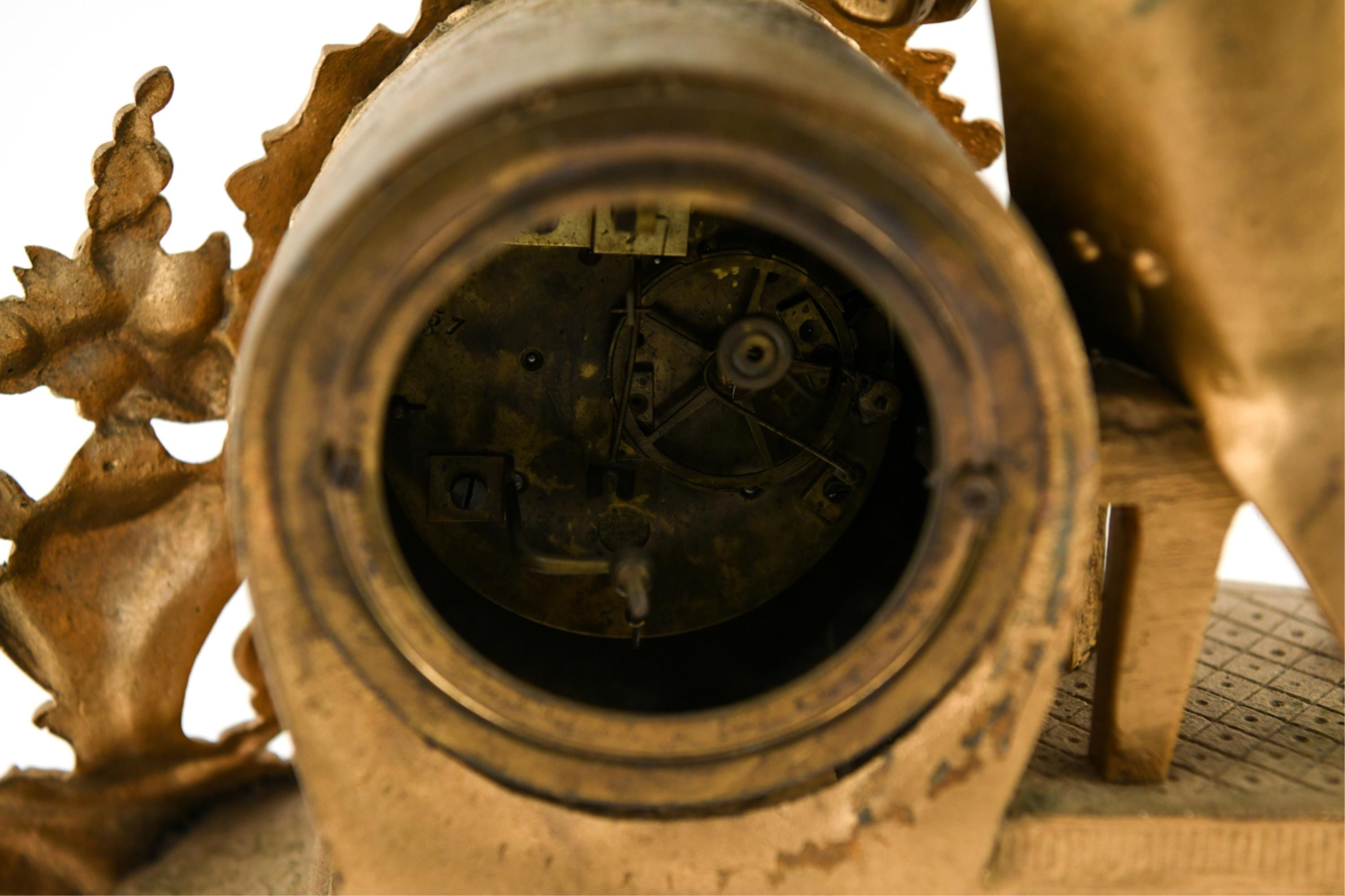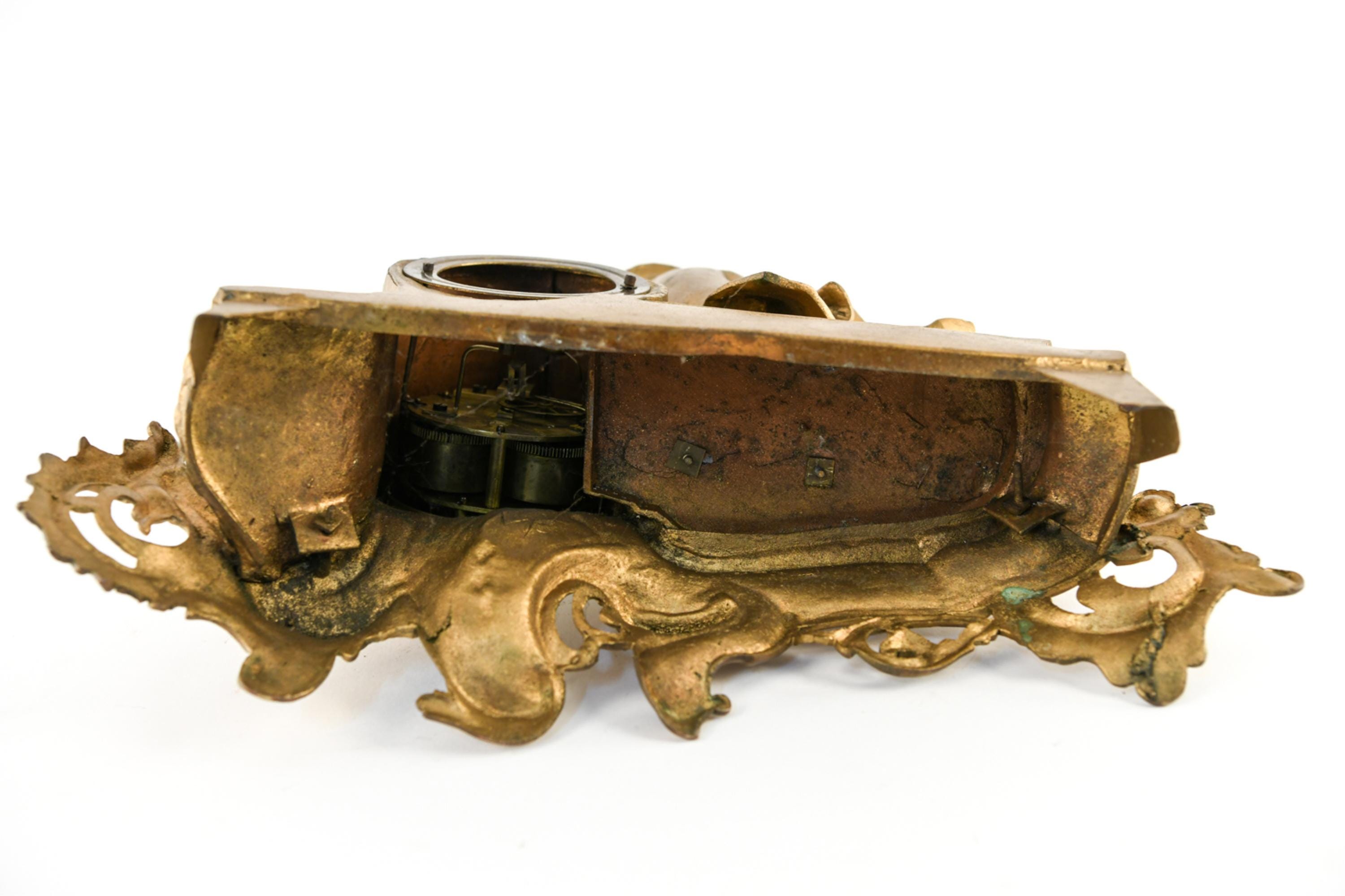 Dimensions: H 13" x W 17" x D 6" Condition: Untested with missing clock components including keys and clock back. Wear consistent with age and use including scratches and paint loss. Some hairline cracks to clock face with old repairs