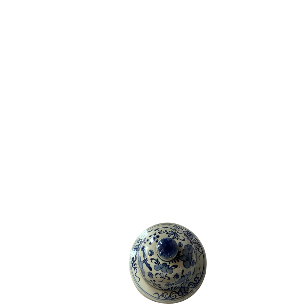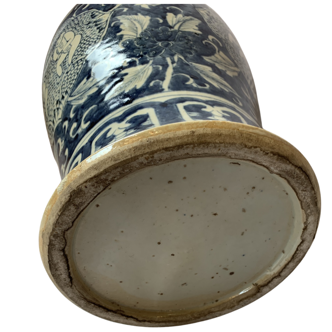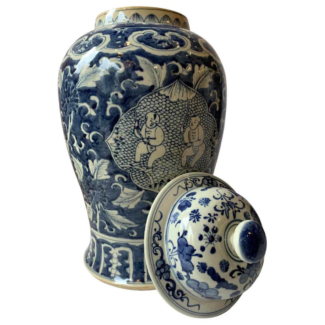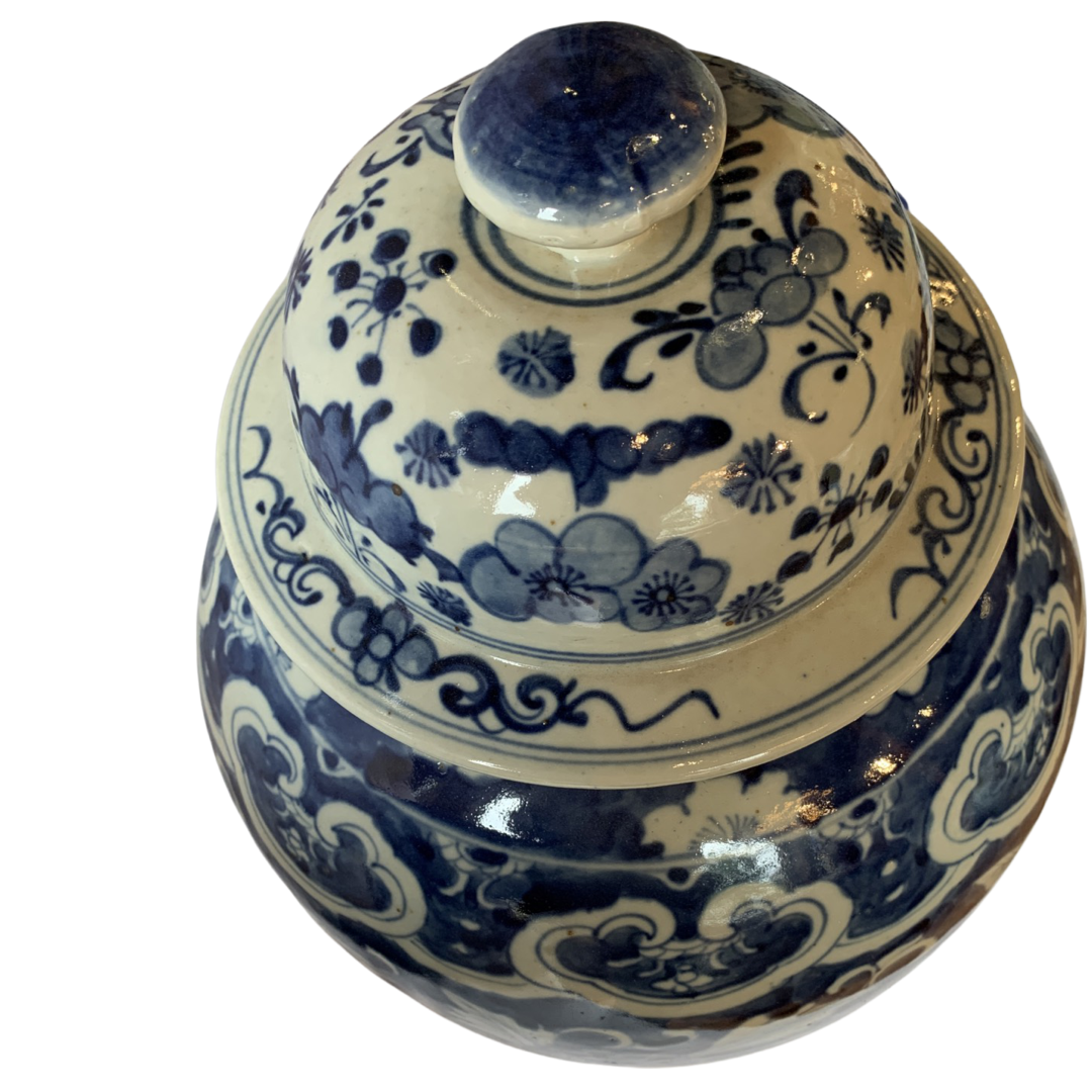 Classic Asian design temple jar, which are often displayed in pairs on buffets, credenzas, or sideboards. Decorated with a Chinese Blue and White landscape pattern with hand painted mountain and pagoda detail.