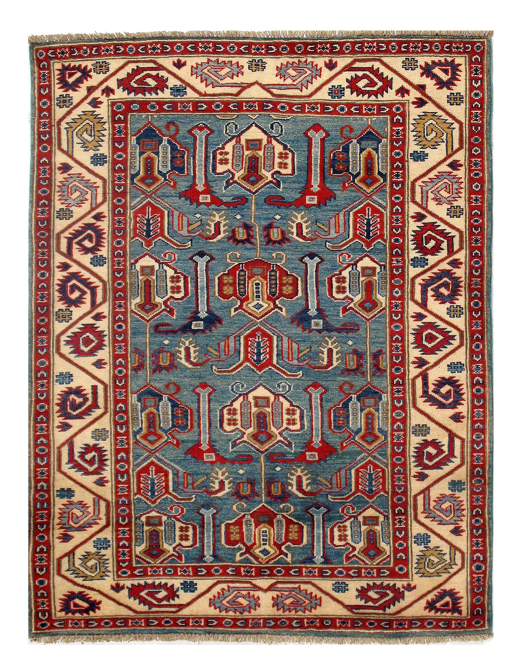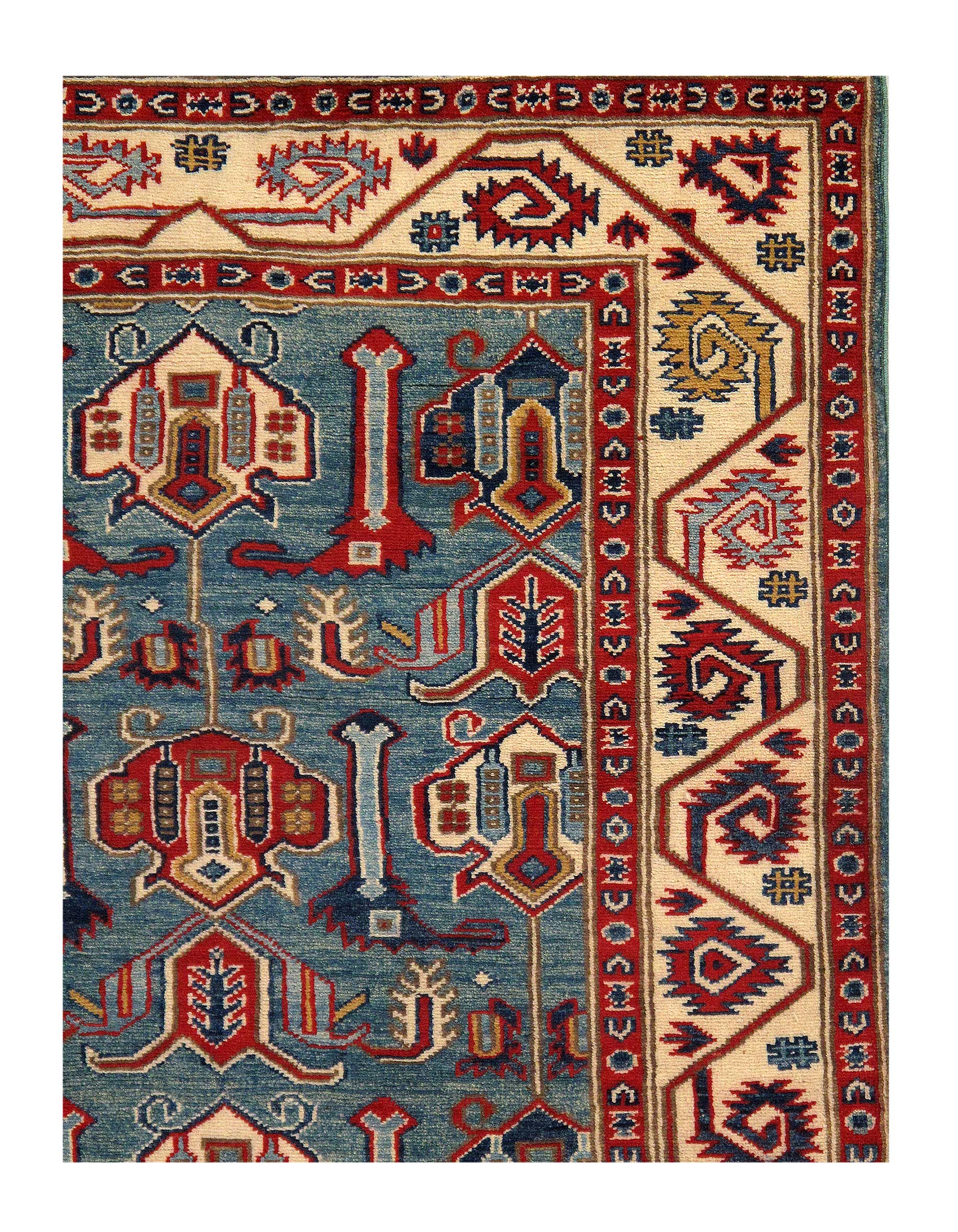 Original Kazak design rug made from hand-spun lamb's wool on a cotton foundation. This rug is handmade from 100-percent premium, hand-spun wool, and employ ancient pot-dying techniques to give them their authentic look. Very Practical for High Traffic Vegetable Dyed