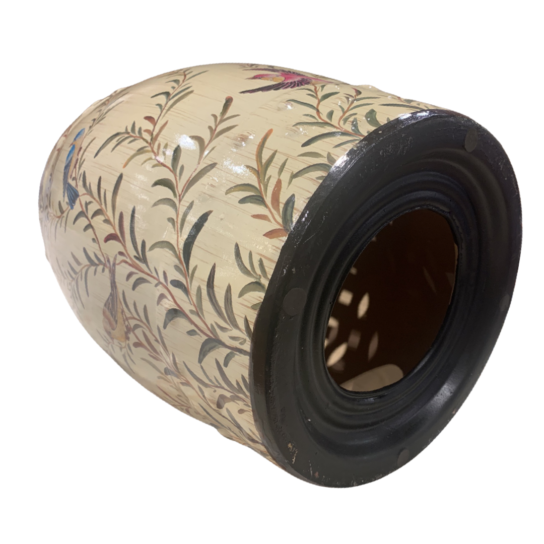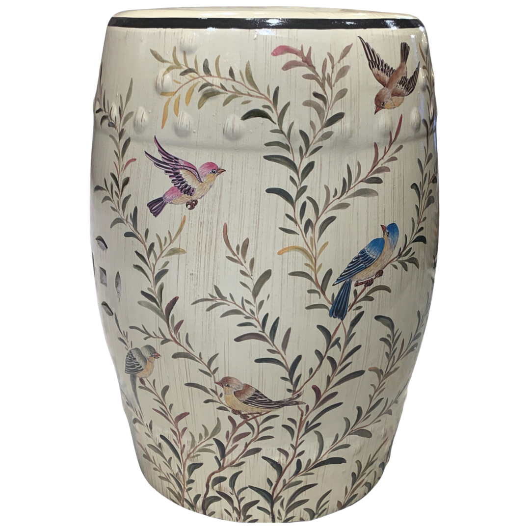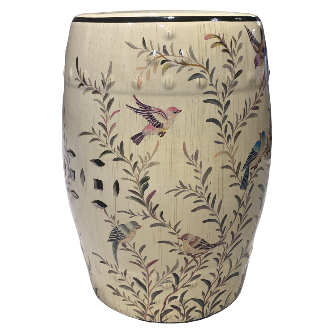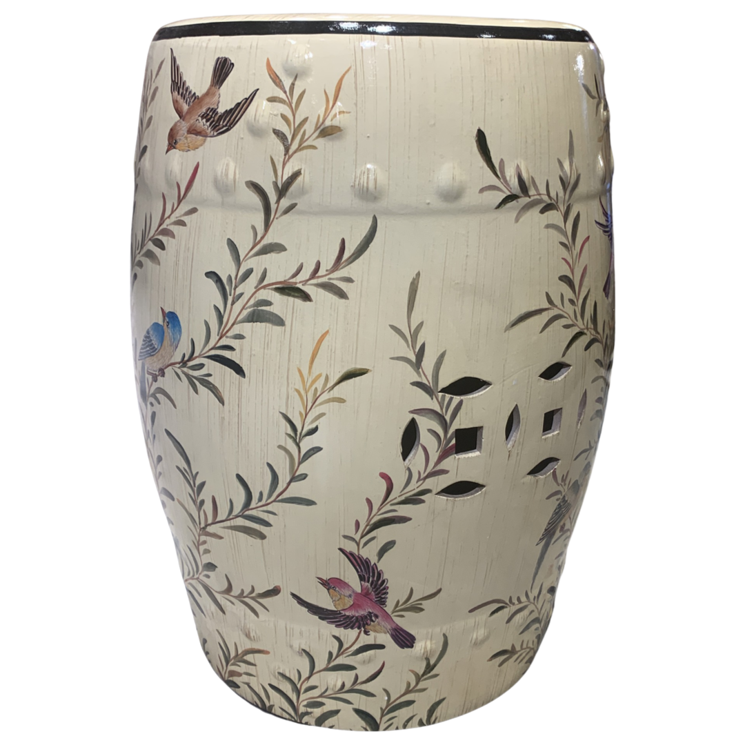 Porcelain garden stool spring birds PA10027. Birds have their perches ,and so should you ! whether you use this beige color stool in the garden or living room ,it's cute ,compact form and asian charm will make it your favorite new seat . featuring oval-shaped cut-outs and embossed details ,it's a fabulous accent piece that will tie indoor or outdoor spaces together .