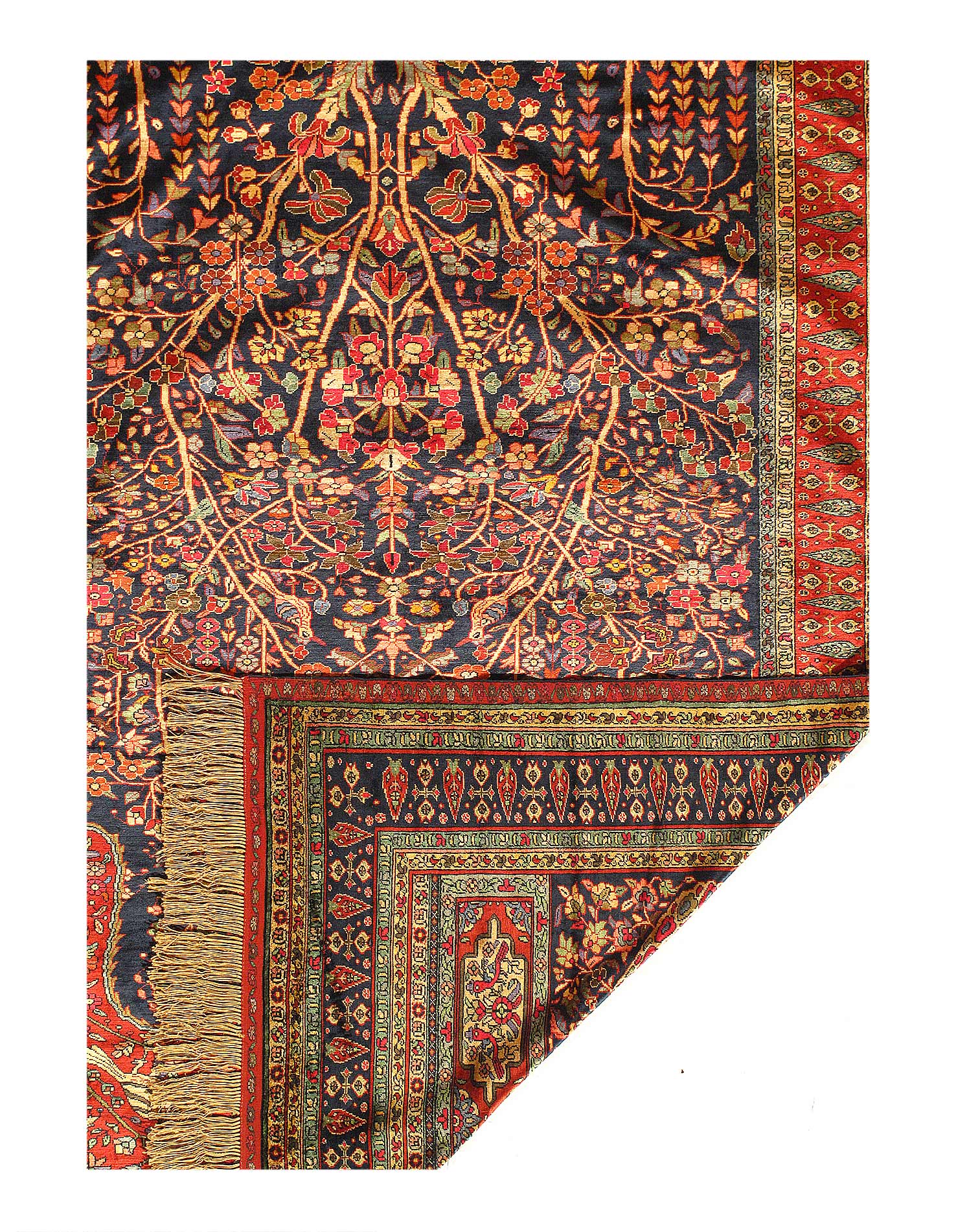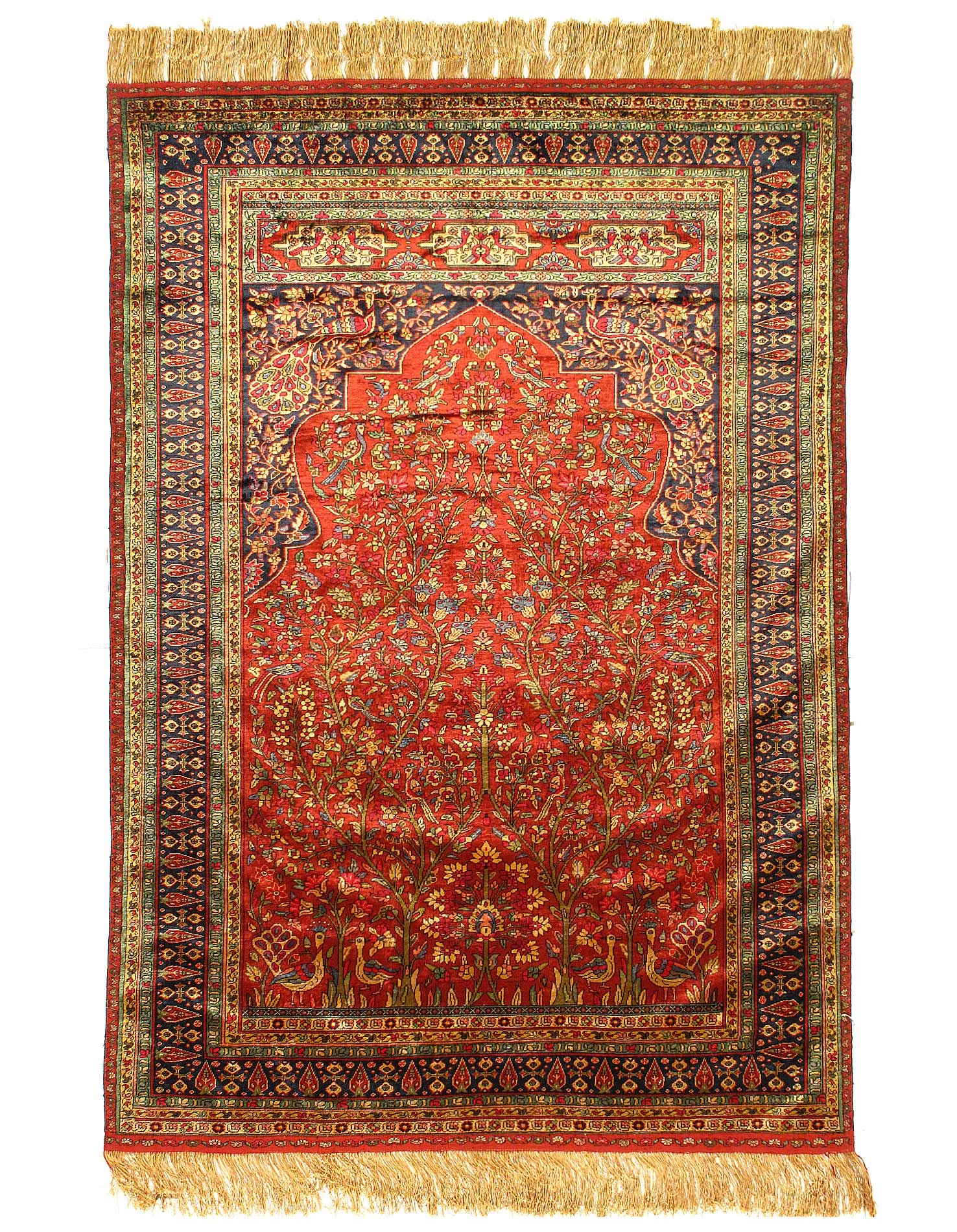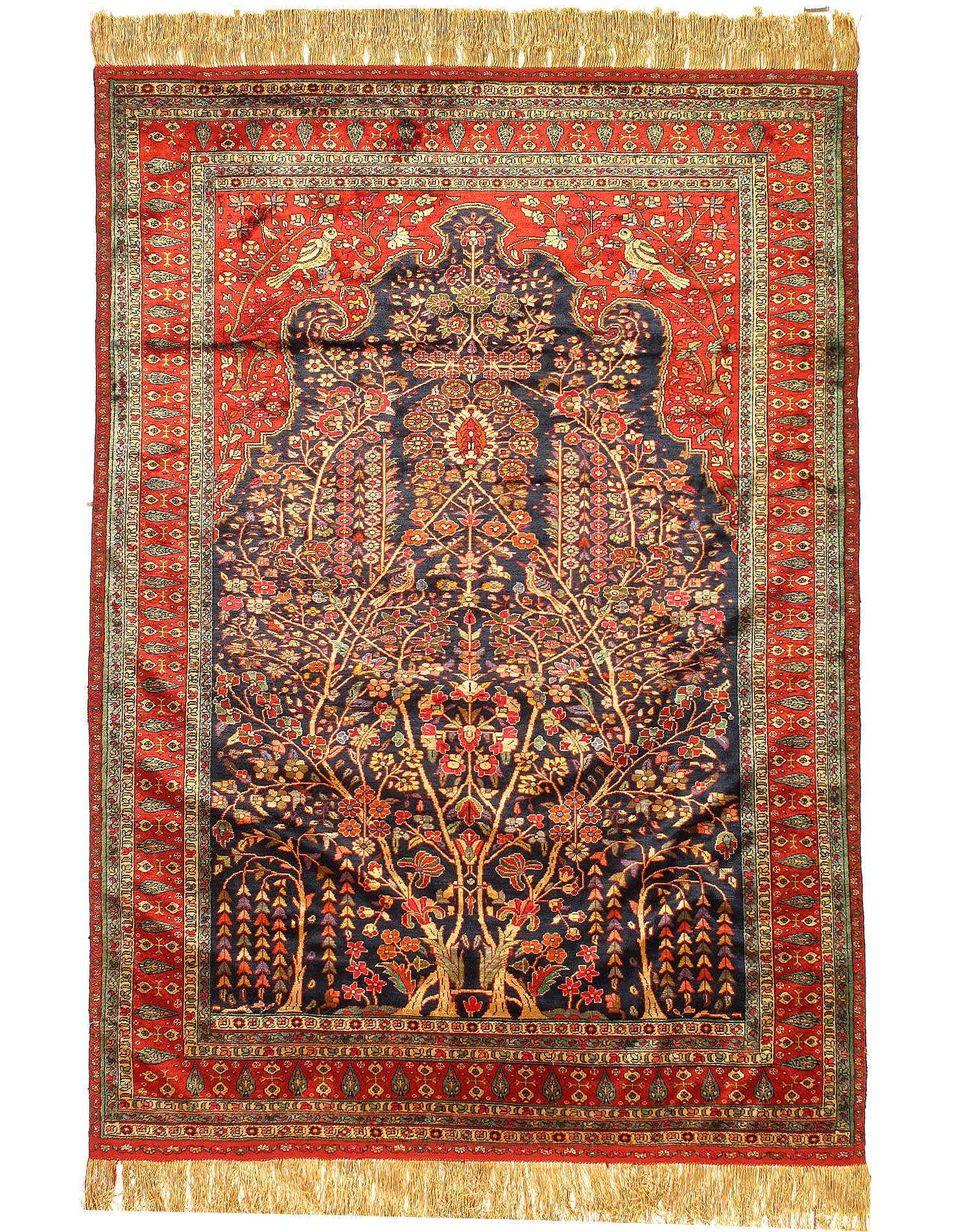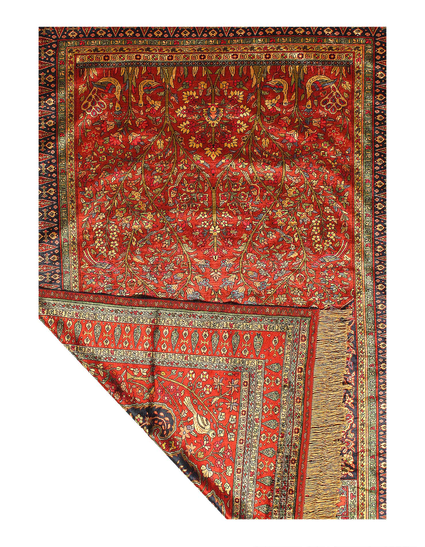 Exceptional. For being a pure silk Quchan, with an exquisitely fine weave. Also for being one of the very few double sided rugs in the world. This technique is fiendishly difficult to work and requires two weavers with near identical skills and manner of expression to sit opposite each other, either side of the same loom, and weave two distinct patterns using the the same warp and weft threads.