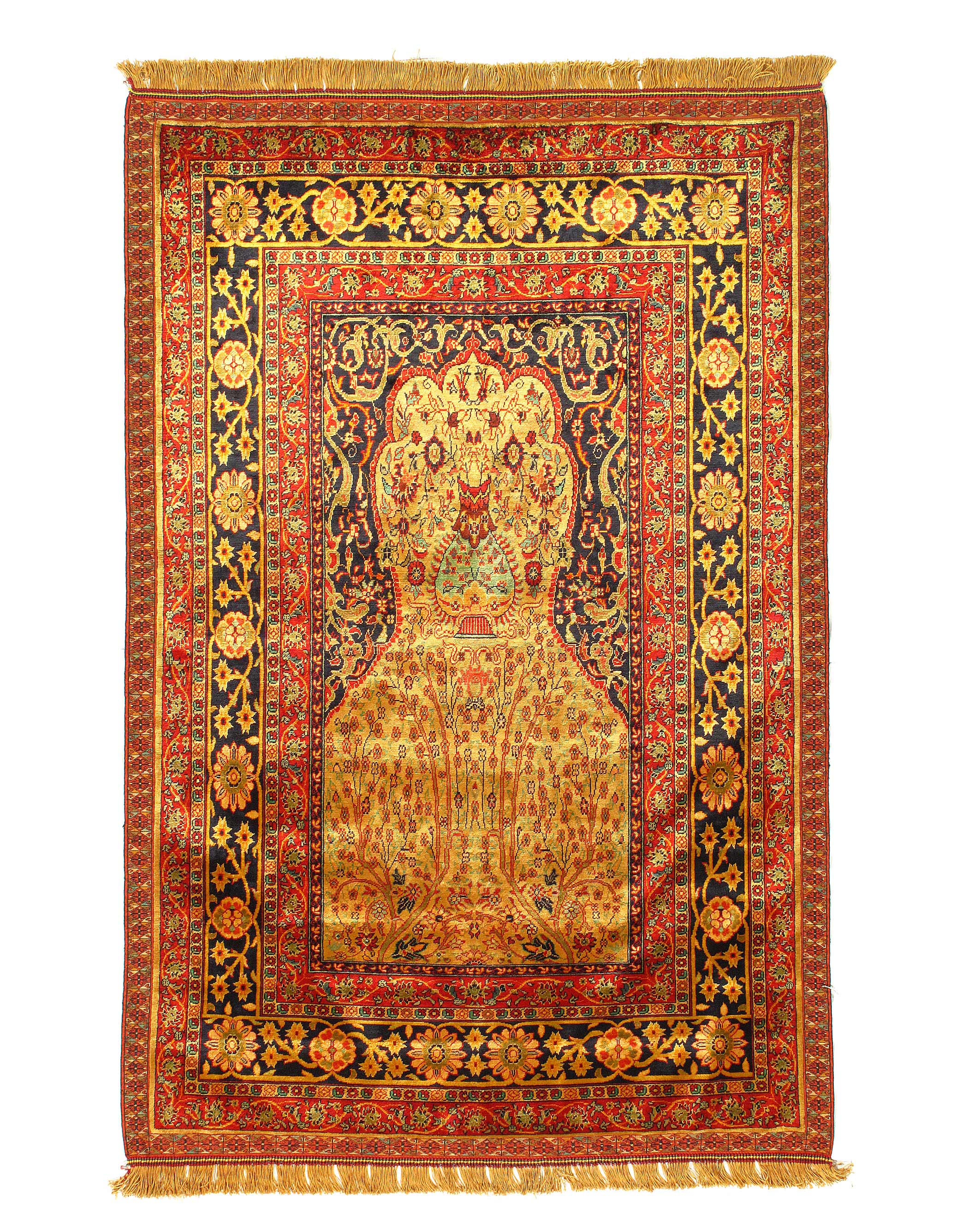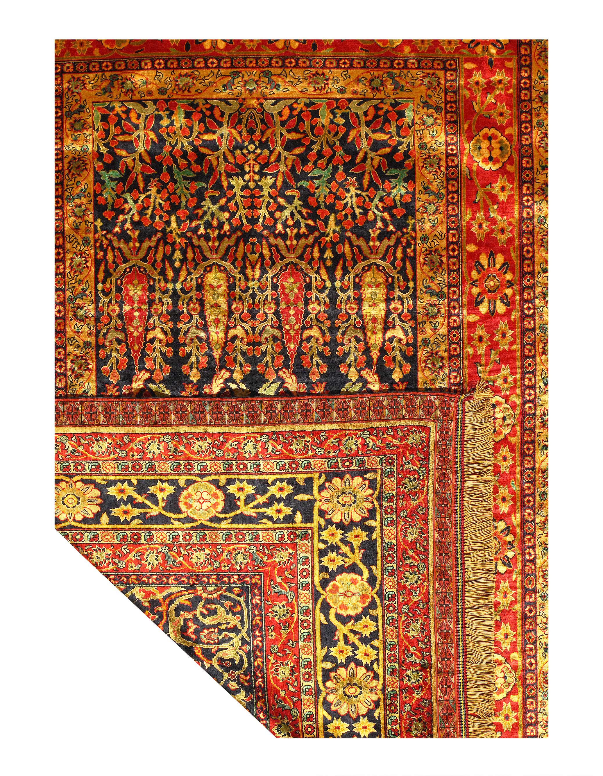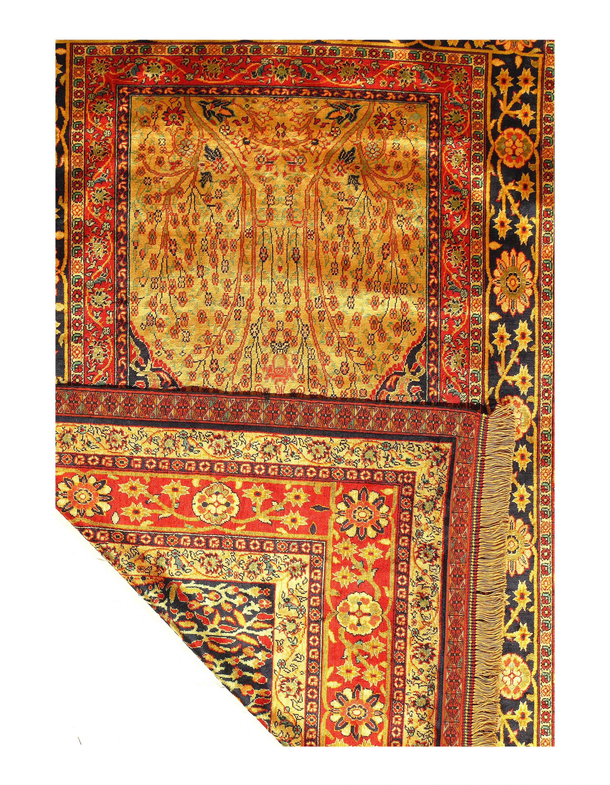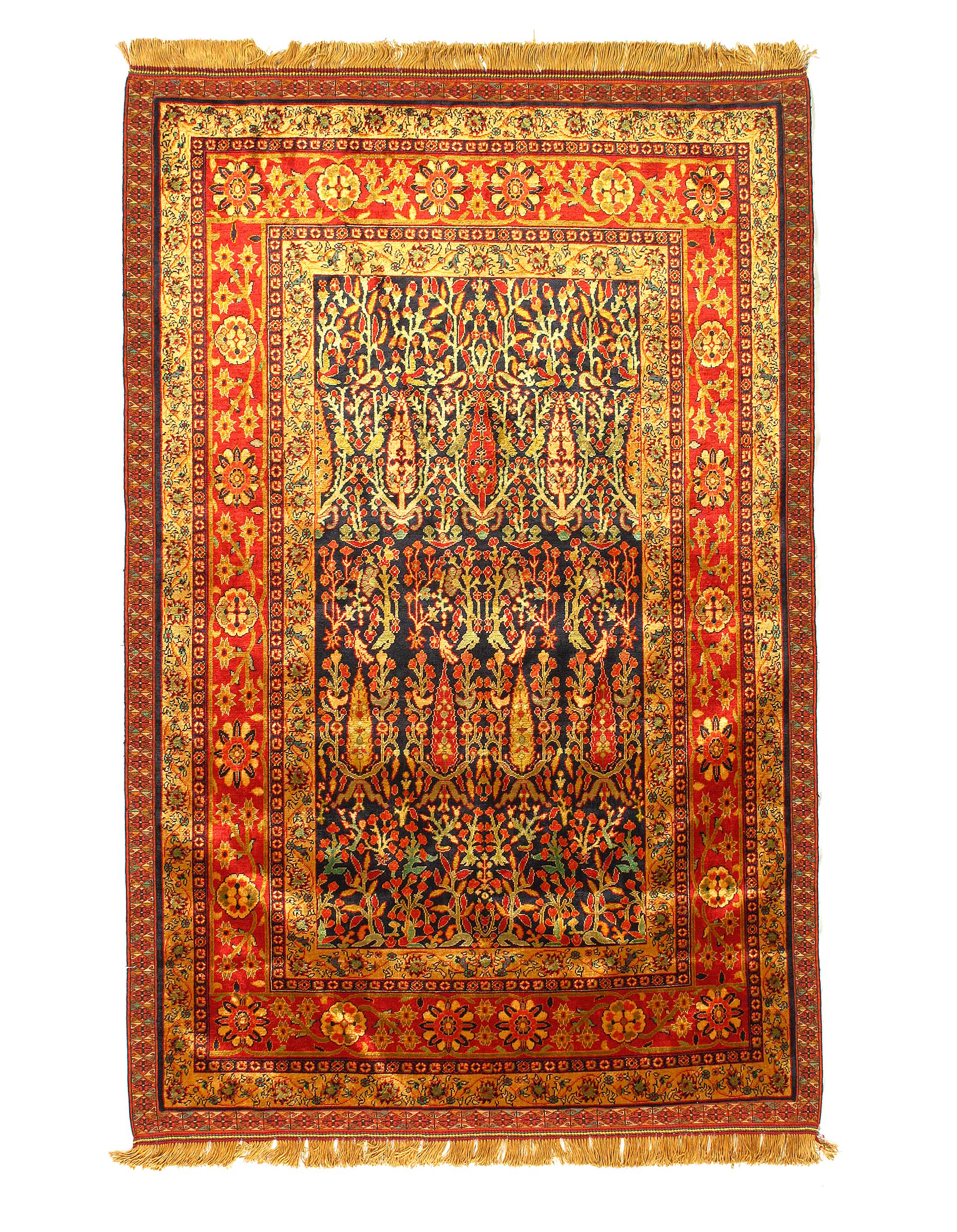 Exceptional. For being a pure silk Quchan, with an exquisitely fine weave. Also for being one of the very few double sided rugs in the world. This technique is fiendishly difficult to work and requires two weavers with near identical skills and manner of expression to sit opposite each other, either side of the same loom, and weave two distinct patterns using the the same warp and weft threads.