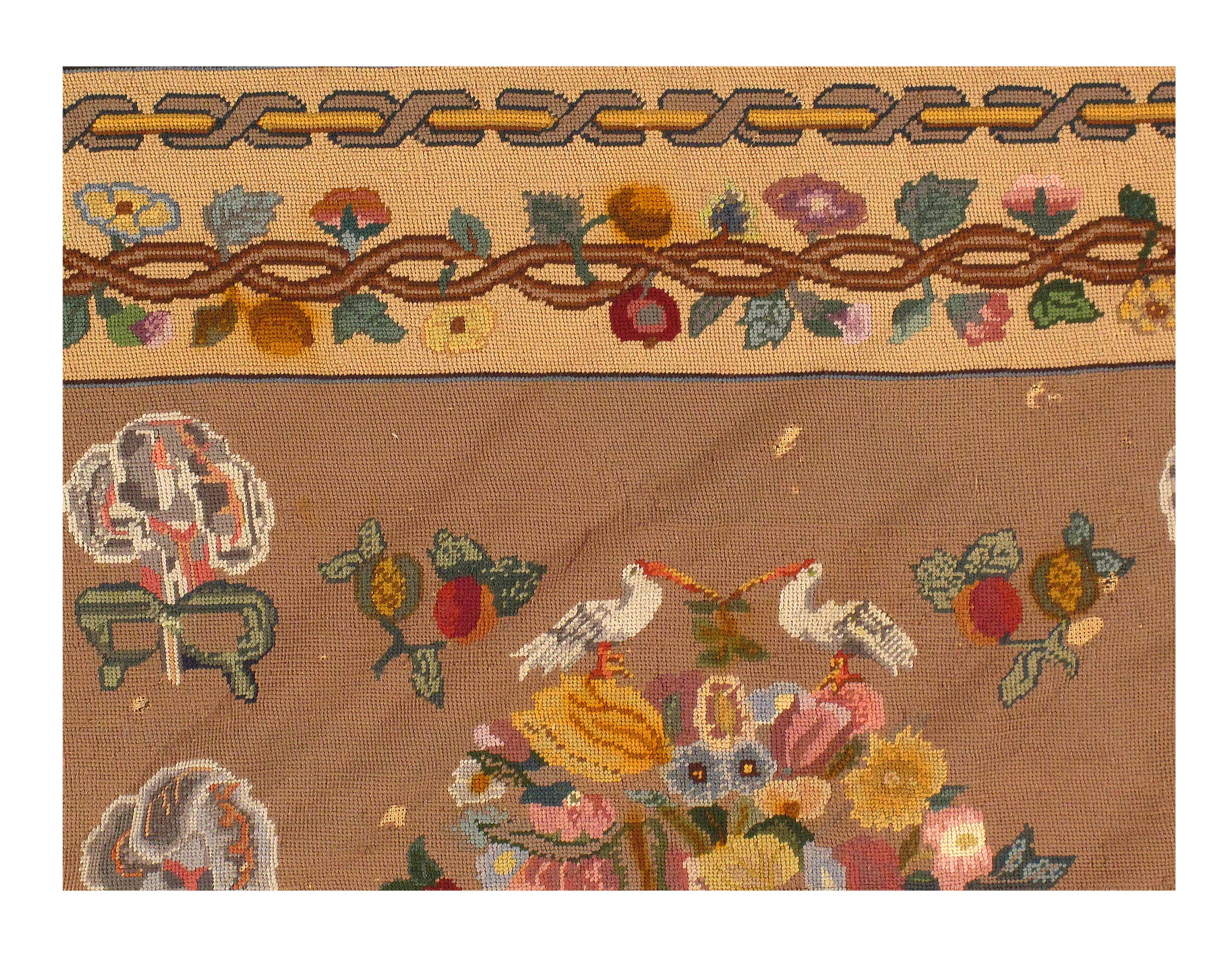 This early 20th-century needlework rug represents classic English needlepoint craft. It was made by hand, using a sewing needle and wool yarn to create stitches on an open grid cotton fabric known as the “canvas.” This technique results in millions of individual stitches that provide an interesting visual and textural effect – needlepoint rugs are pile-less and have that slightly rustic character.