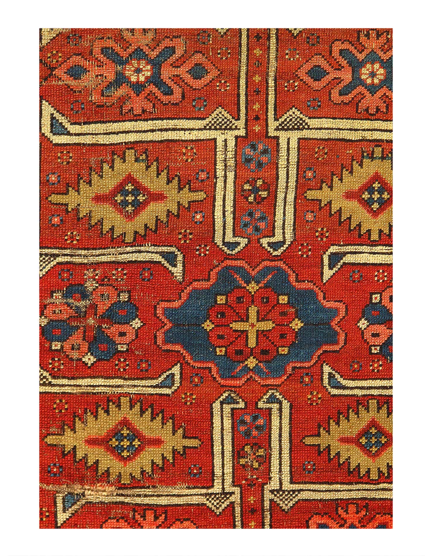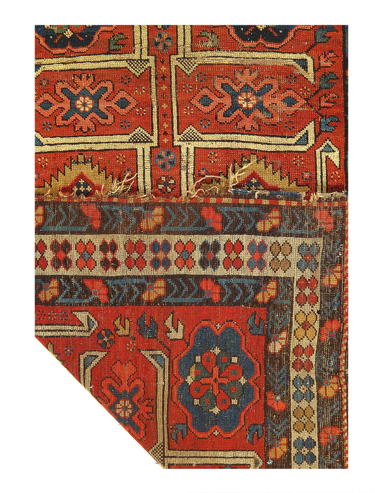Kazak is a modern shape of old Caucasian rugs which strictly adheres to traditional design elements of the Caucasus. It has elements such as the stepped hooked polygons, geometrical medallions and rosettes, presented in more stylized manner and with a new dimension. Natural dyes produce soft luminous shades and abrashes causing a beautiful sheen. Handspun wool yarn is normally used in the variety of vibrant warm colors.