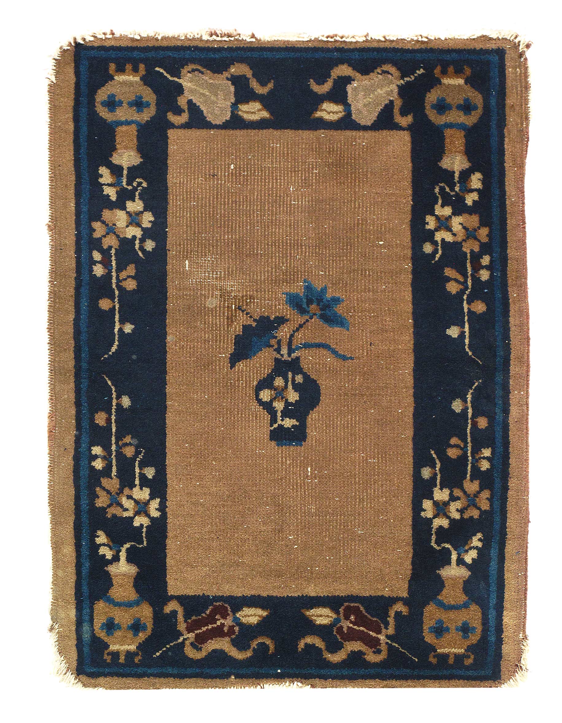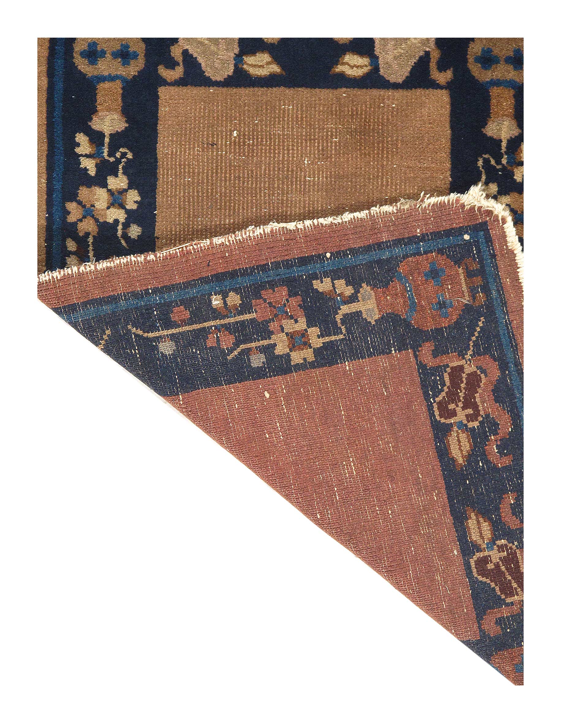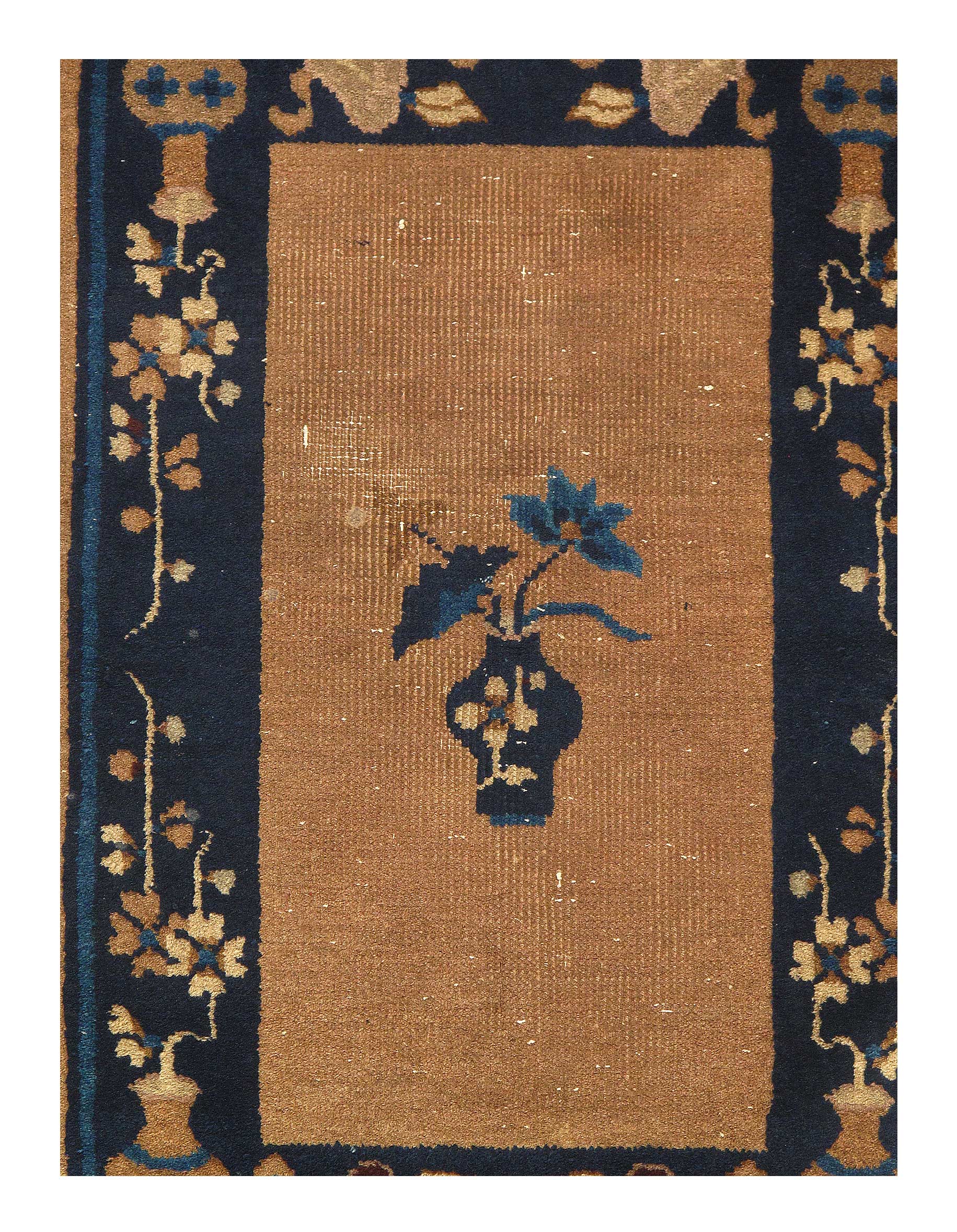 Antique Chinese Deco Rug, Origin: China, Circa: Early 20th Century – Here is an exciting and appealing antique Oriental carpet – an antique Art Deco rug that was designed and woven in China during the early years of the twentieth century. Heavily informed by the aesthetic inclinations of the Art Deco period, this unique carpet is a compelling and thought-provoking example. A scalloped Purple encloses a Light Green sand field on this exquisitely subtle and restrained antique Chinese Art Deco. At first the field appears empty or open, but it is actually covered by a tone-on-tone design of scrolls and cloud-bands emanating inward from the outer edges. In their sinuous rhythms they echo the scalloped forms of the border and continue its visual effects across the carpet in a more subdued manner. This carpet testifies to the masterful design sensibilities of Chinese weavers as they made the transition into the modern world. The Art Deco movement had an outside influence on the world of art and design, and some of the most important qualities and characteristics of that movement may be found in this fine small rug.