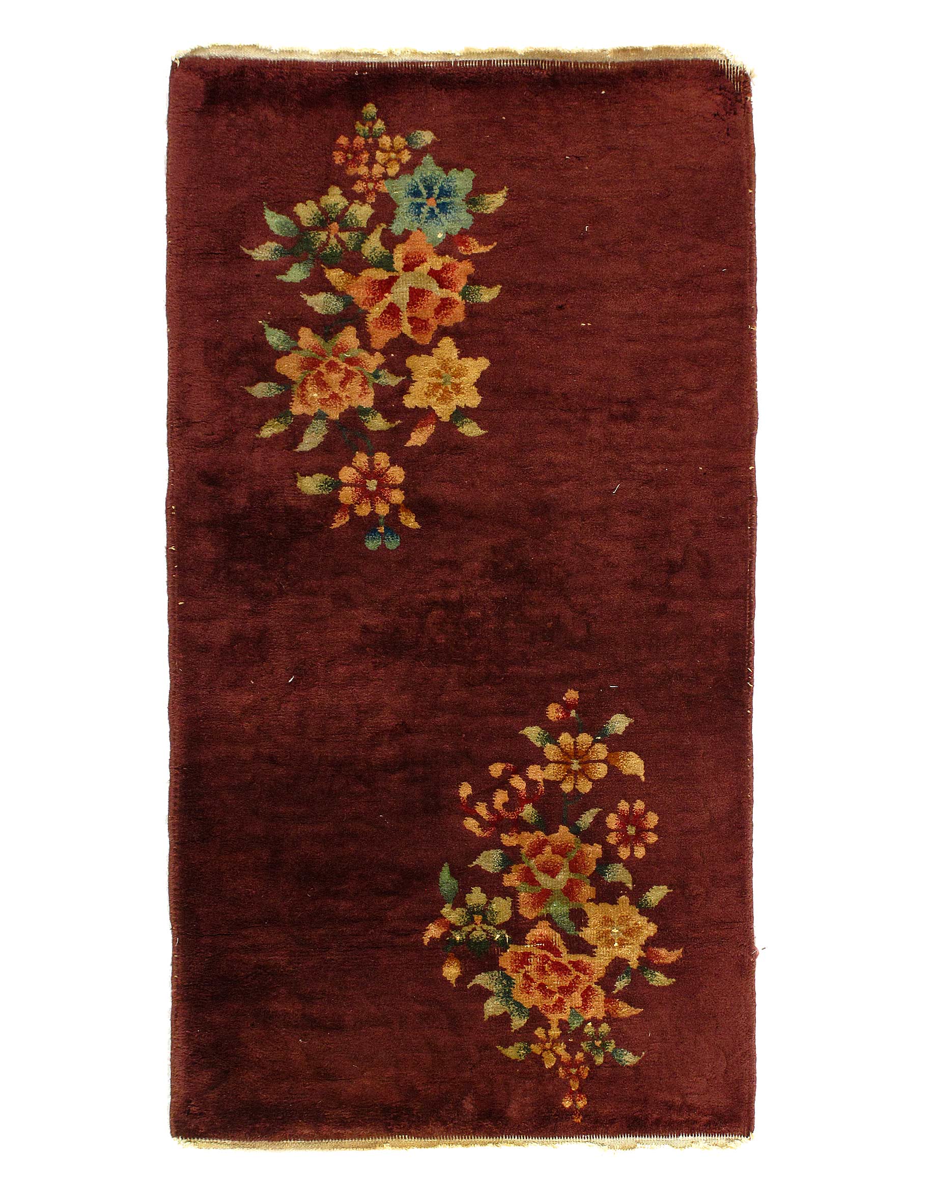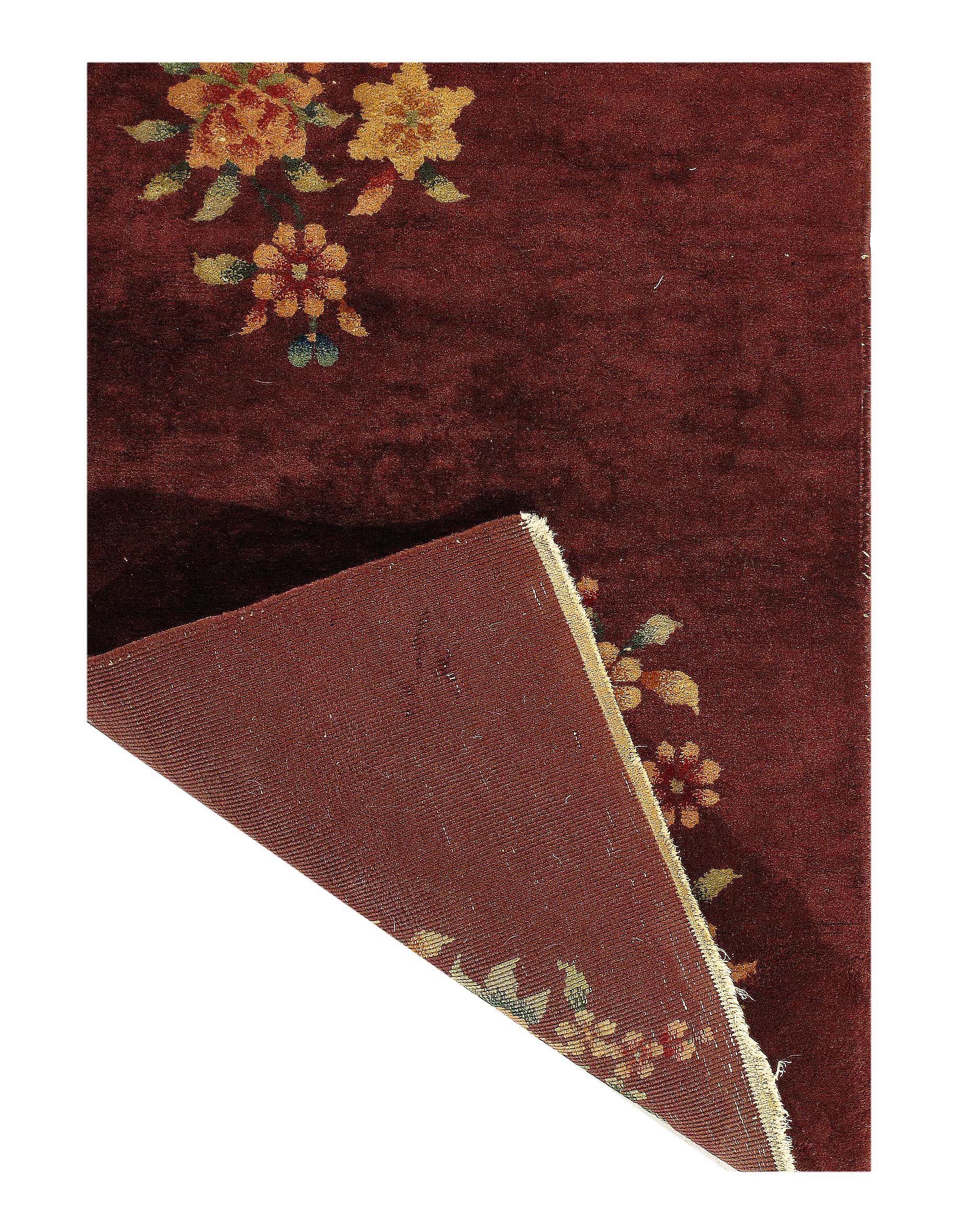 Chinese Deco Rug, Origin: China, Circa: Early 20th Century – Here is an exciting and appealing antique Oriental carpet – an antique Art Deco rug that was designed and woven in China during the early years of the twentieth century. Heavily informed by the aesthetic inclinations of the Art Deco period, this unique carpet is a compelling and thought-provoking example. A scalloped Red sand field on this exquisitely subtle and restrained antique Chinese Art Deco. At first the field appears empty or open, but it is actually covered by a tone-on-tone design of scrolls and cloud-bands emanating inward from the outer edges. In their sinuous rhythms they echo the scalloped forms of the border and continue its visual effects across the carpet in a more subdued manner. This carpet testifies to the masterful design sensibilities of Chinese weavers as they made the transition into the modern world. The Art Deco movement had an outside influence on the world of art and design, and some of the most important qualities and characteristics of that movement may be found in this fine small rug.