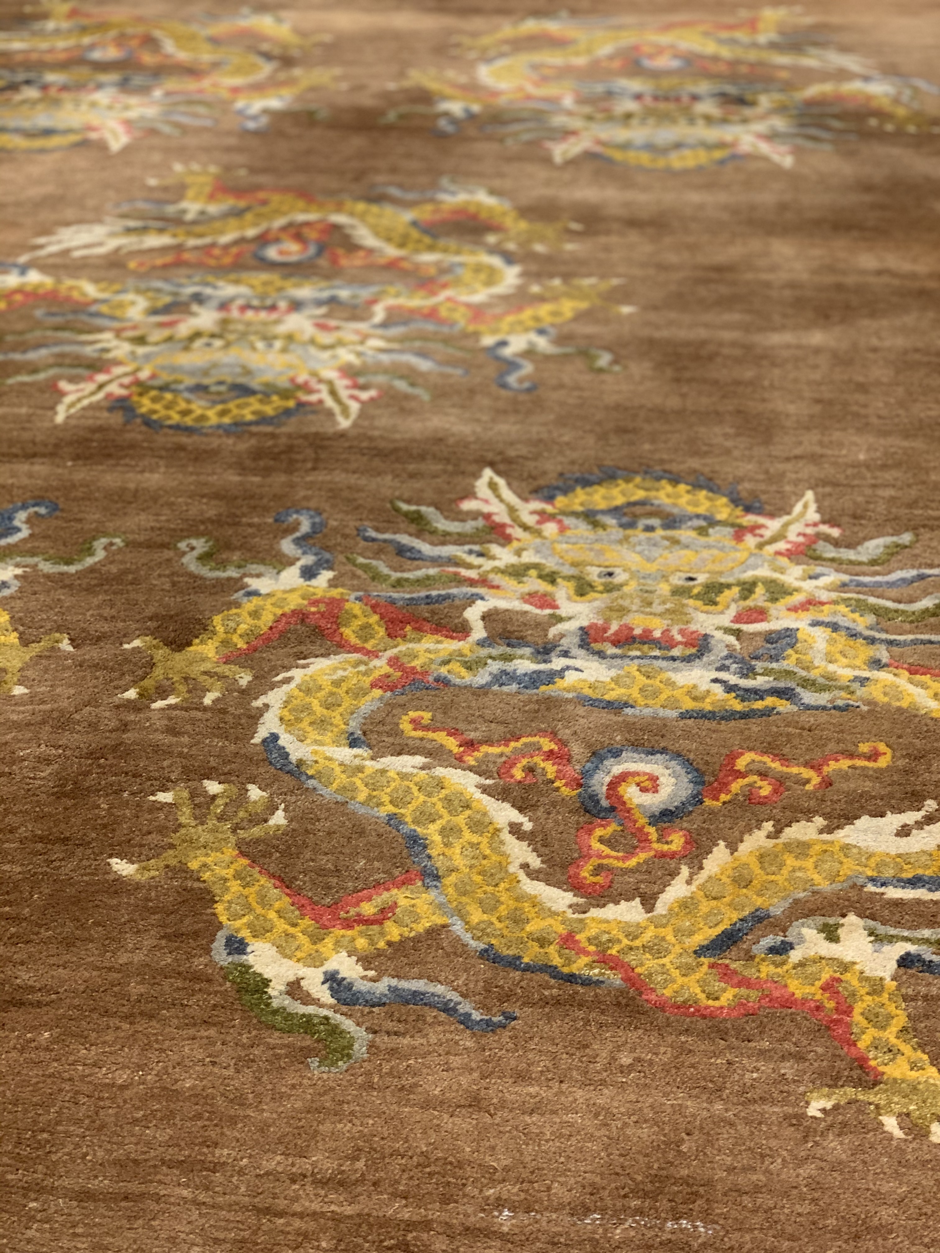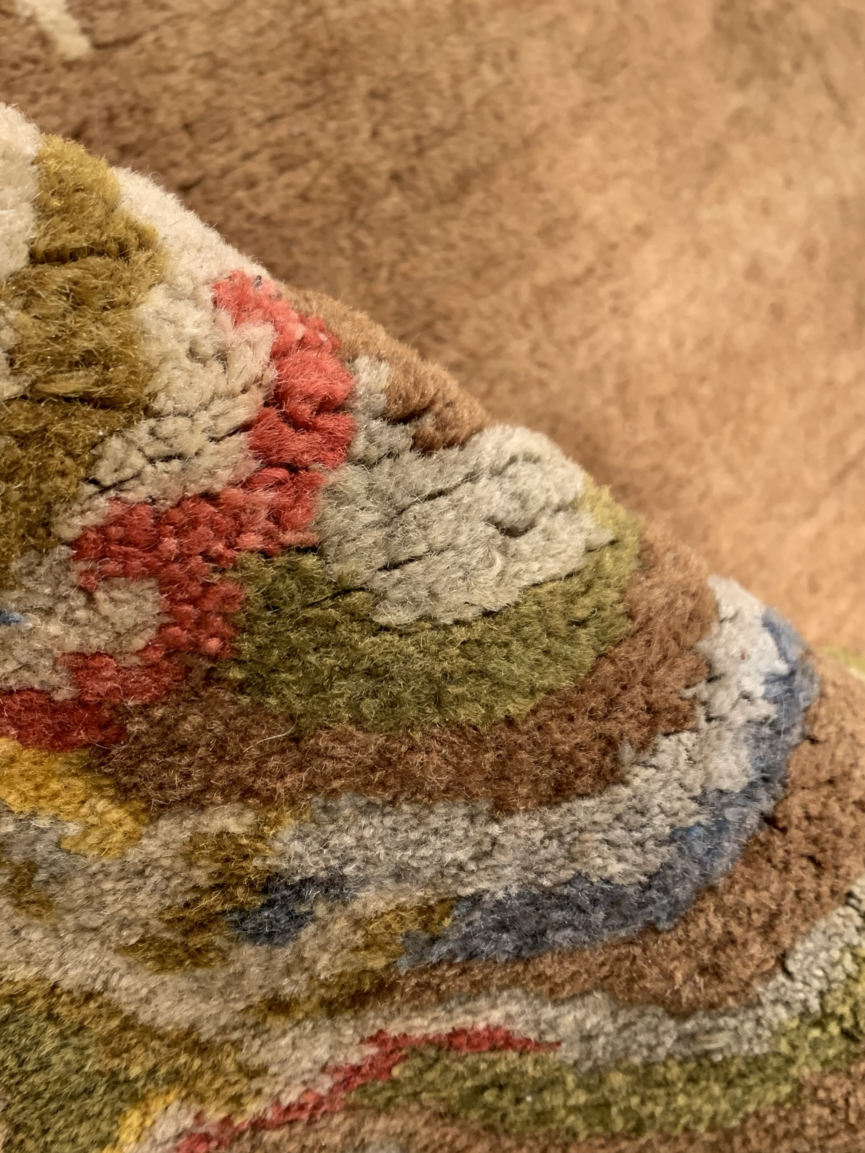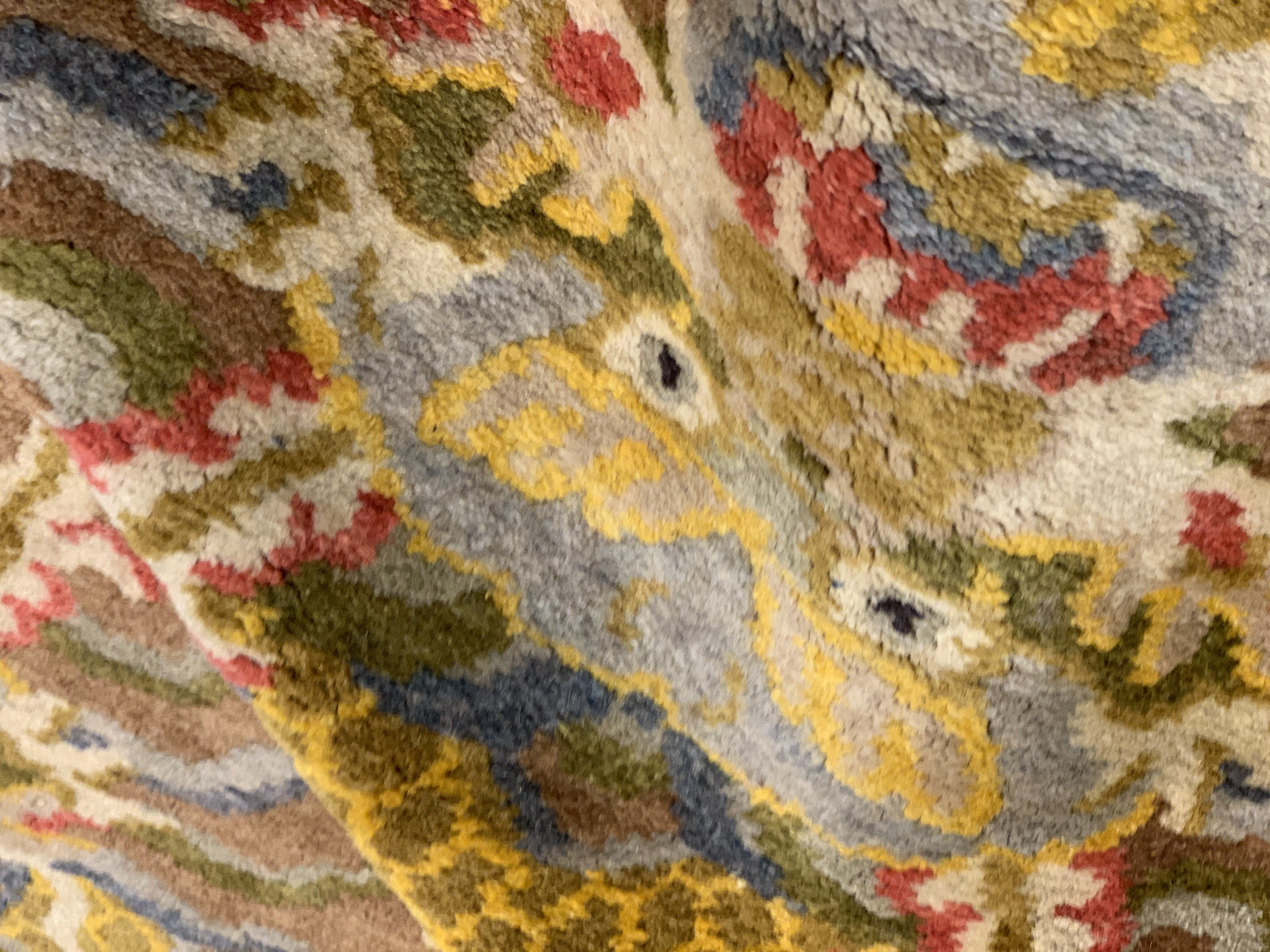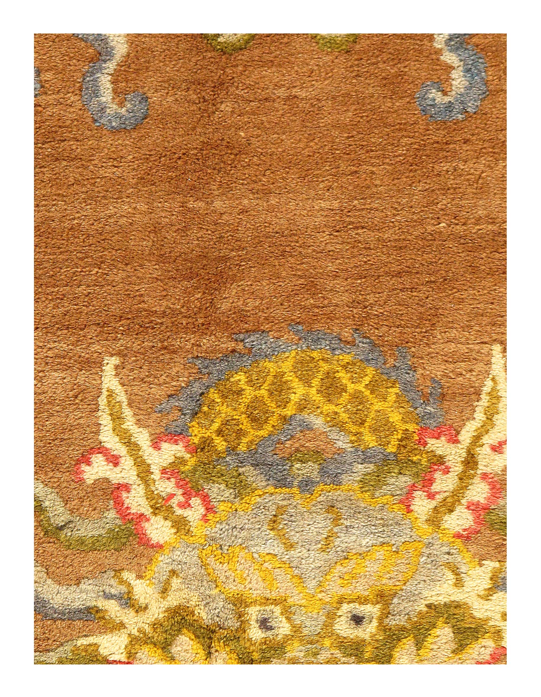 Chinese Deco Rug, Origin: China, Circa: Early 20th Century – Here is an exciting and appealing antique Oriental carpet – an antique Art Deco rug that was designed and woven in China during the early years of the twentieth century. Heavily informed by the aesthetic inclinations of the Art Deco period, this unique carpet is a compelling and thought-provoking example. A scalloped border of Blue encloses a Beige / Ivory sand field on this exquisitely subtle and restrained antique Chinese Art Deco. At first the field appears empty or open, but it is actually covered by a tone-on-tone design of scrolls and cloud-bands emanating inward from the outer edges. In their sinuous rhythms they echo the scalloped forms of the border and continue its visual effects across the carpet in a more subdued manner. This carpet testifies to the masterful design sensibilities of Chinese weavers as they made the transition into the modern world. The Art Deco movement had an outside influence on the world of art and design, and some of the most important qualities and characteristics of that movement may be found in this fine rug.