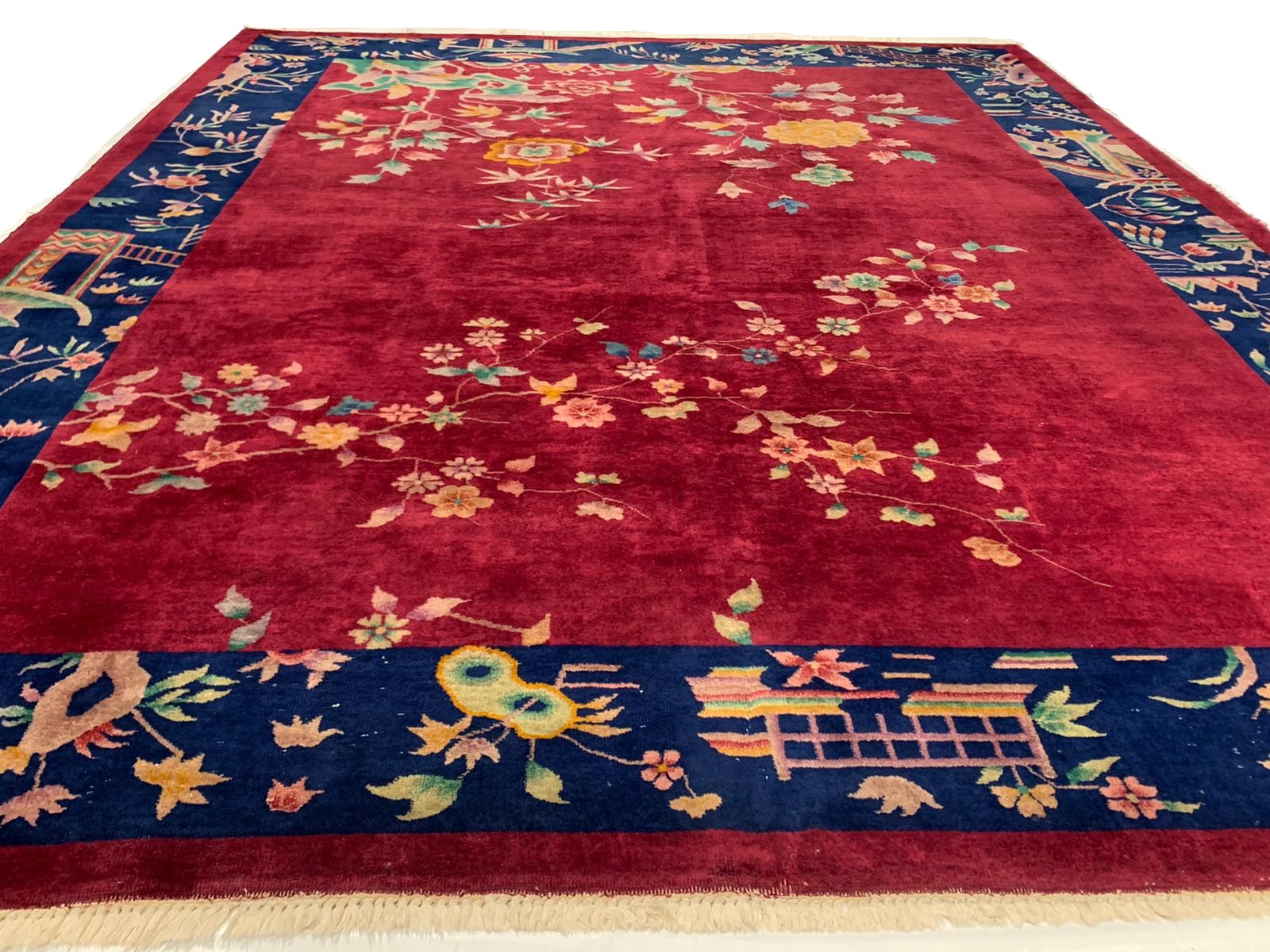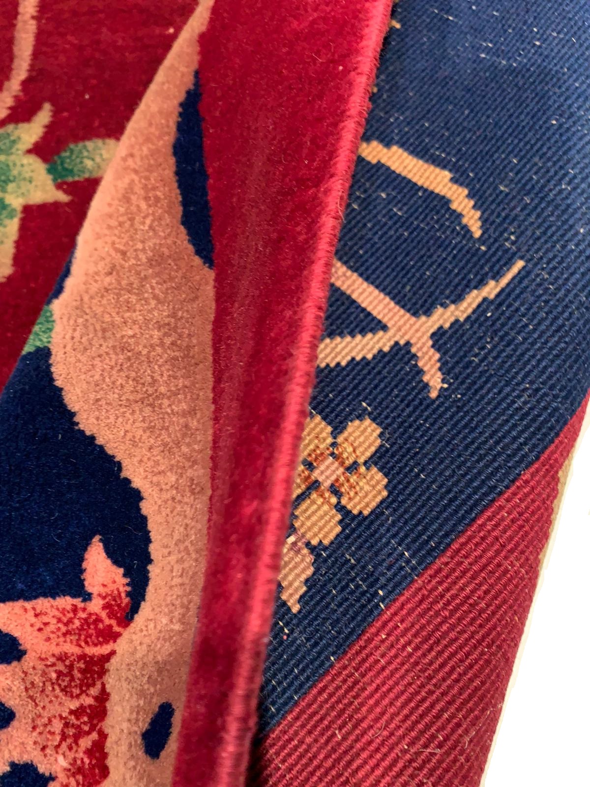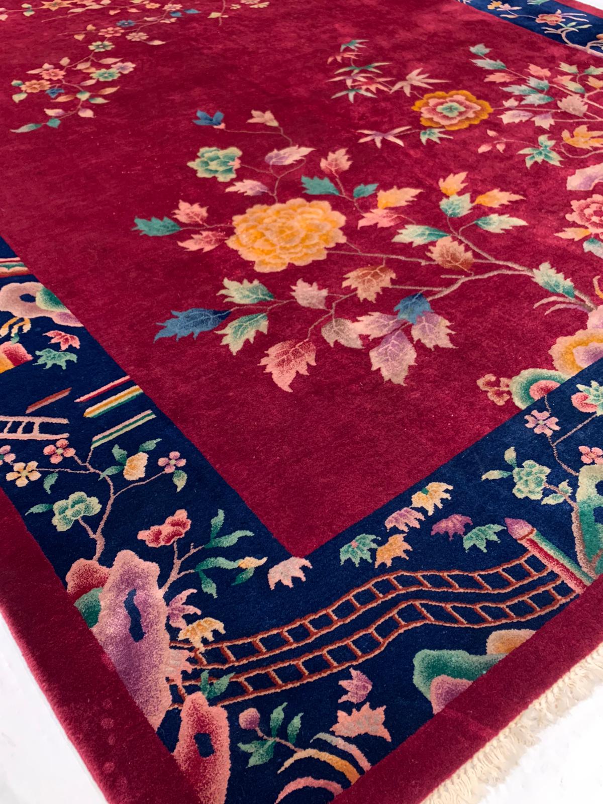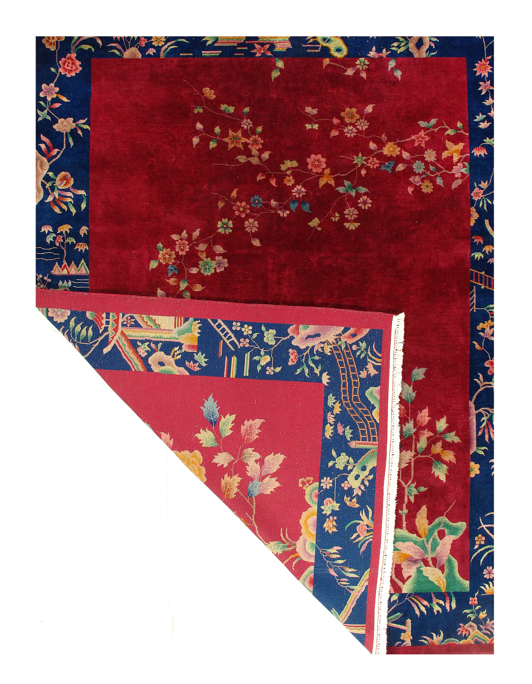 Chinese Deco Rug, Origin: China, Circa: Early 20th Century β Here is an exciting and appealing antique Oriental carpet β an antique Art Deco rug that was designed and woven in China during the early years of the twentieth century. Heavily informed by the aesthetic inclinations of the Art Deco period, this unique carpet is a compelling and thought-provoking example. A scalloped border of Blue enclose Red / Navy sand field on this exquisitely subtle and restrained antique Chinese Art Deco. At first the field appears empty or open, but it is actually covered by a tone-on-tone design of scrolls and cloud-bands emanating inward from the outer edges. In their sinuous rhythms they echo the scalloped forms of the border and continue its visual effects across the carpet in a more subdued manner. This carpet testifies to the masterful design sensibilities of Chinese weavers as they made the transition into the modern world. The Art Deco movement had an outside influence on the world of art and design, and some of the most important qualities and characteristics of that movement may be found in this fine rug.